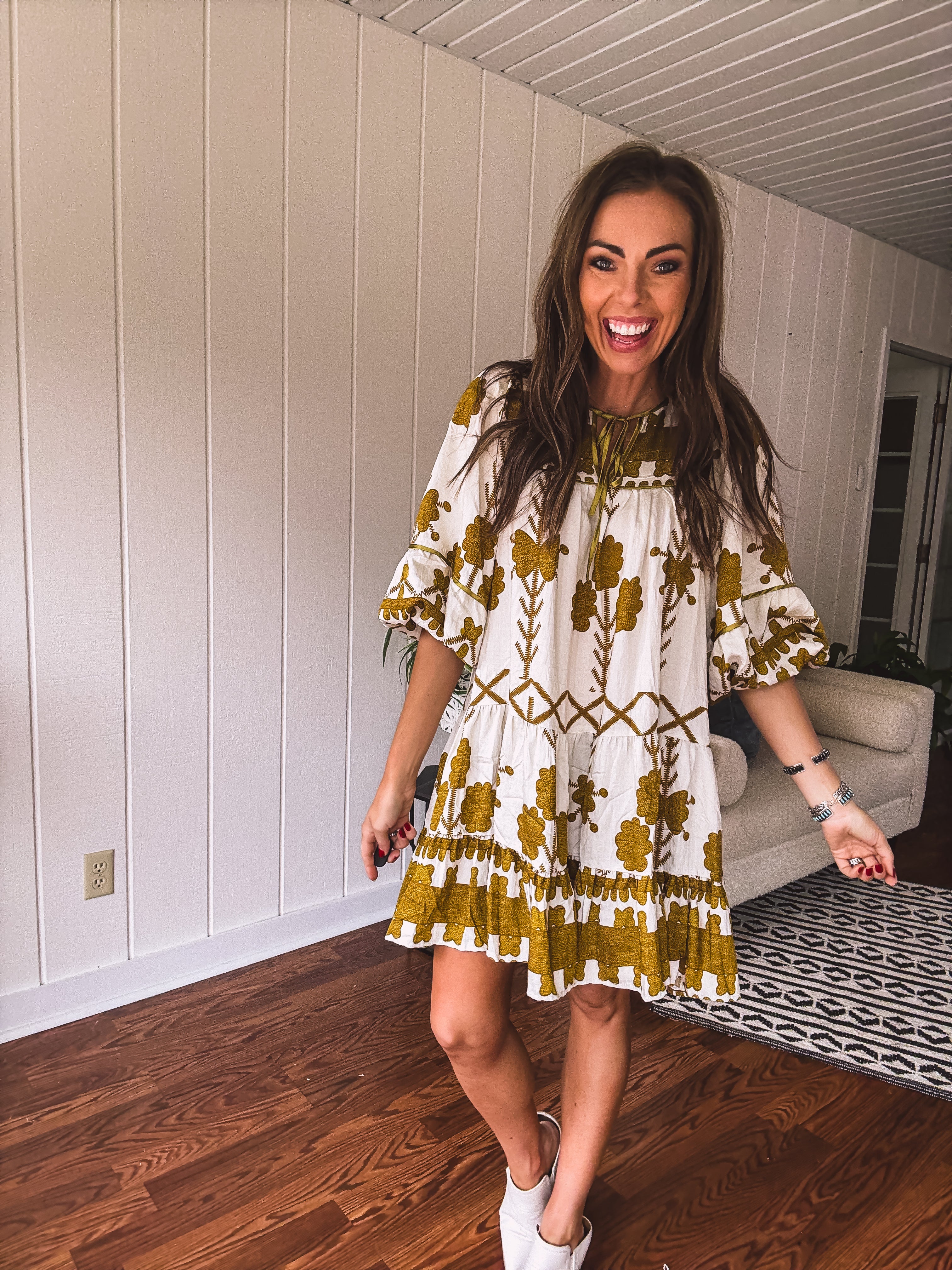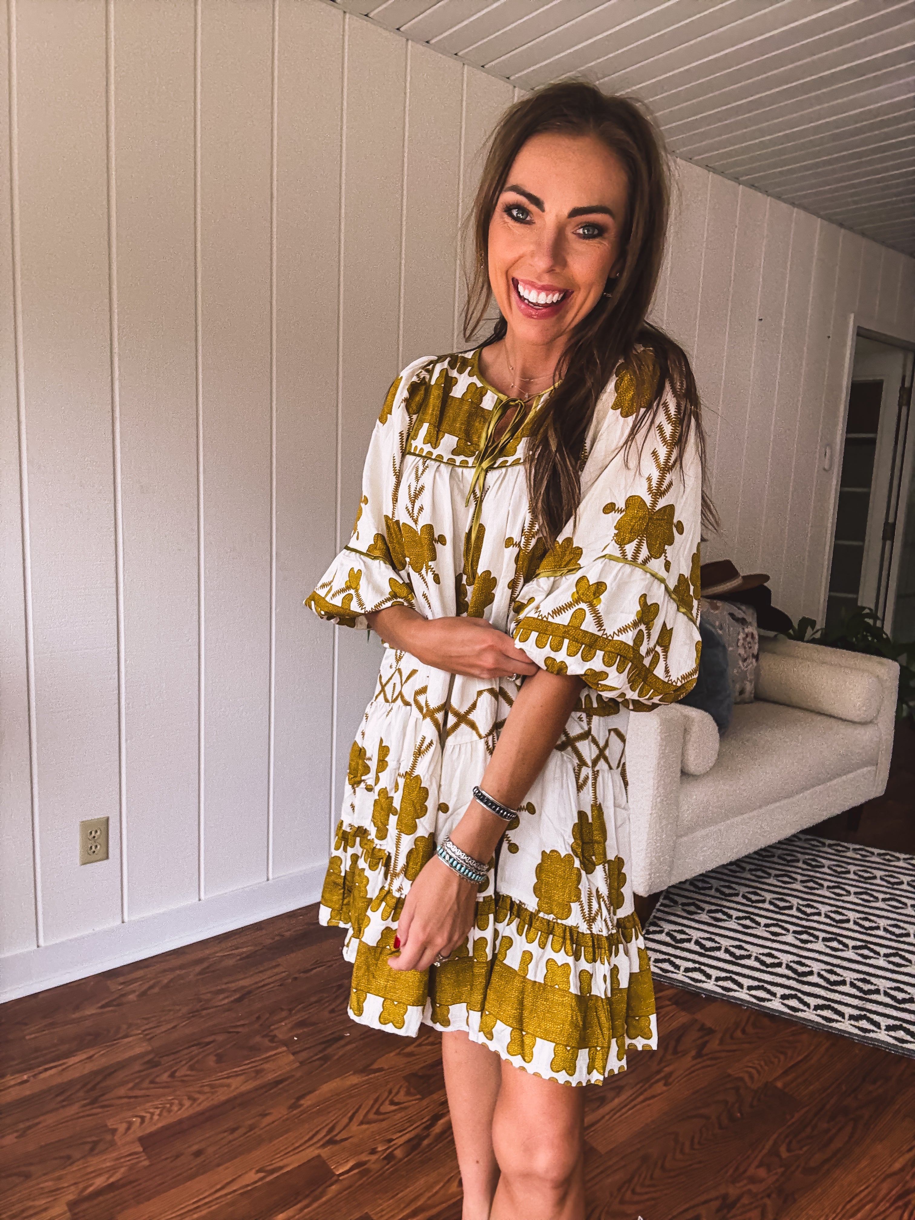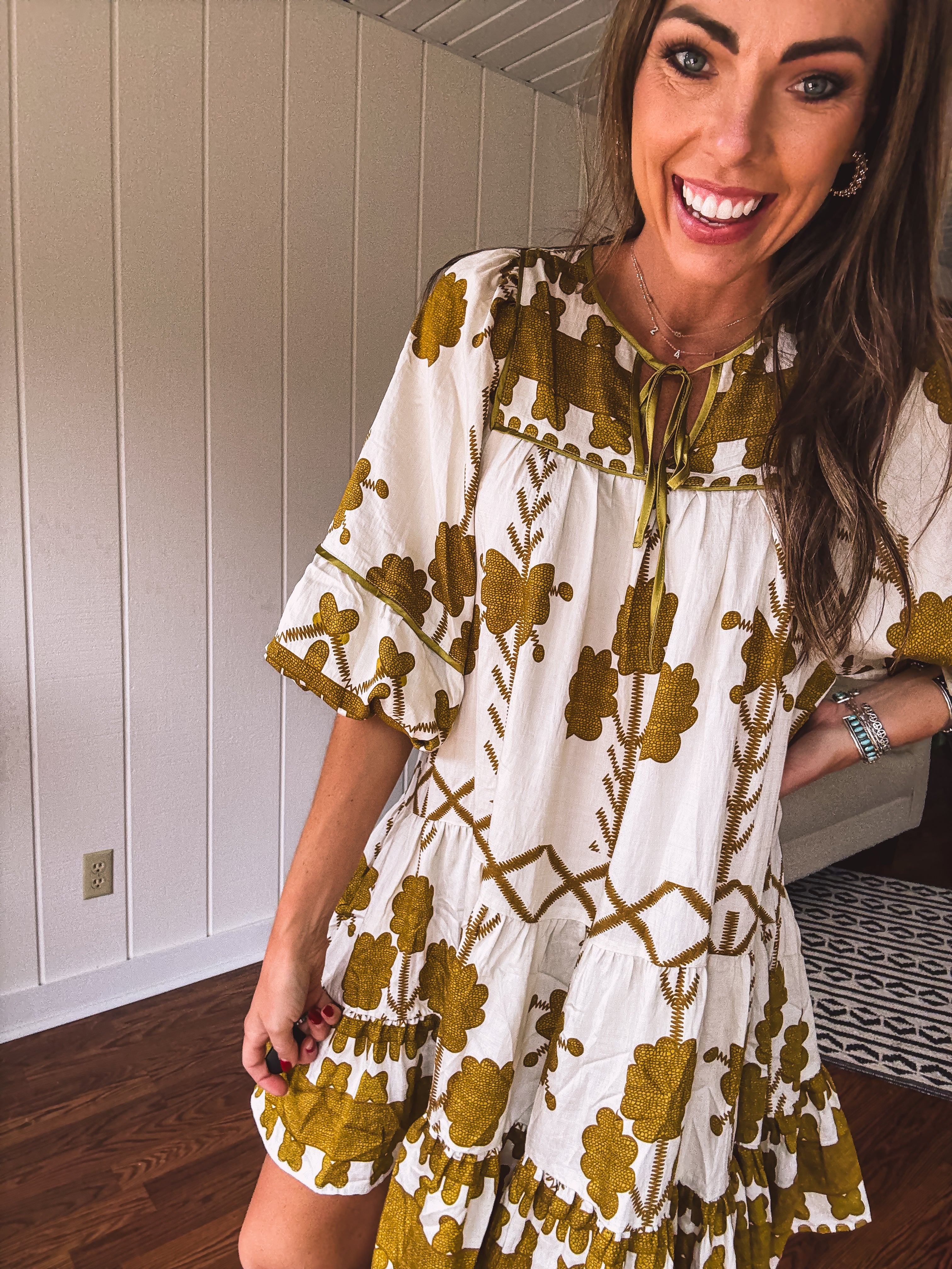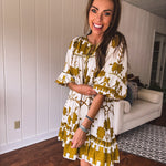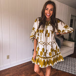 This breezy, knee-length tiered dress showcases a mustard green tribal and floral pattern on a creamy base. With a satin-trimmed yoke and neckline tied with a satin bow, plus elastic cuffs adding a boho-western flair, it’s the perfect match for your go-to boots. Whether it’s date night, a fun girls’ outing, or a casual shopping spree, this dress makes every moment feel effortlessly stylish.