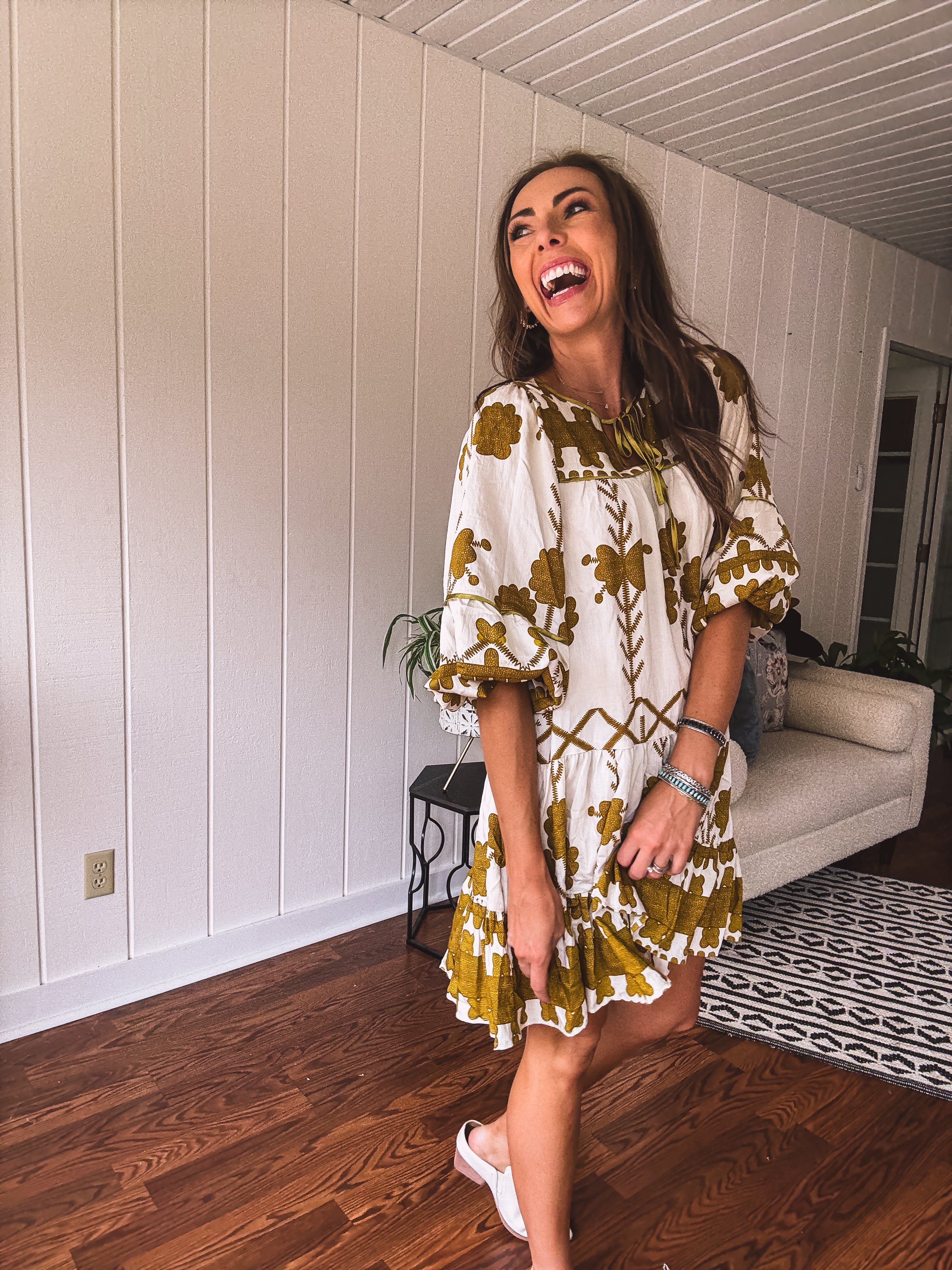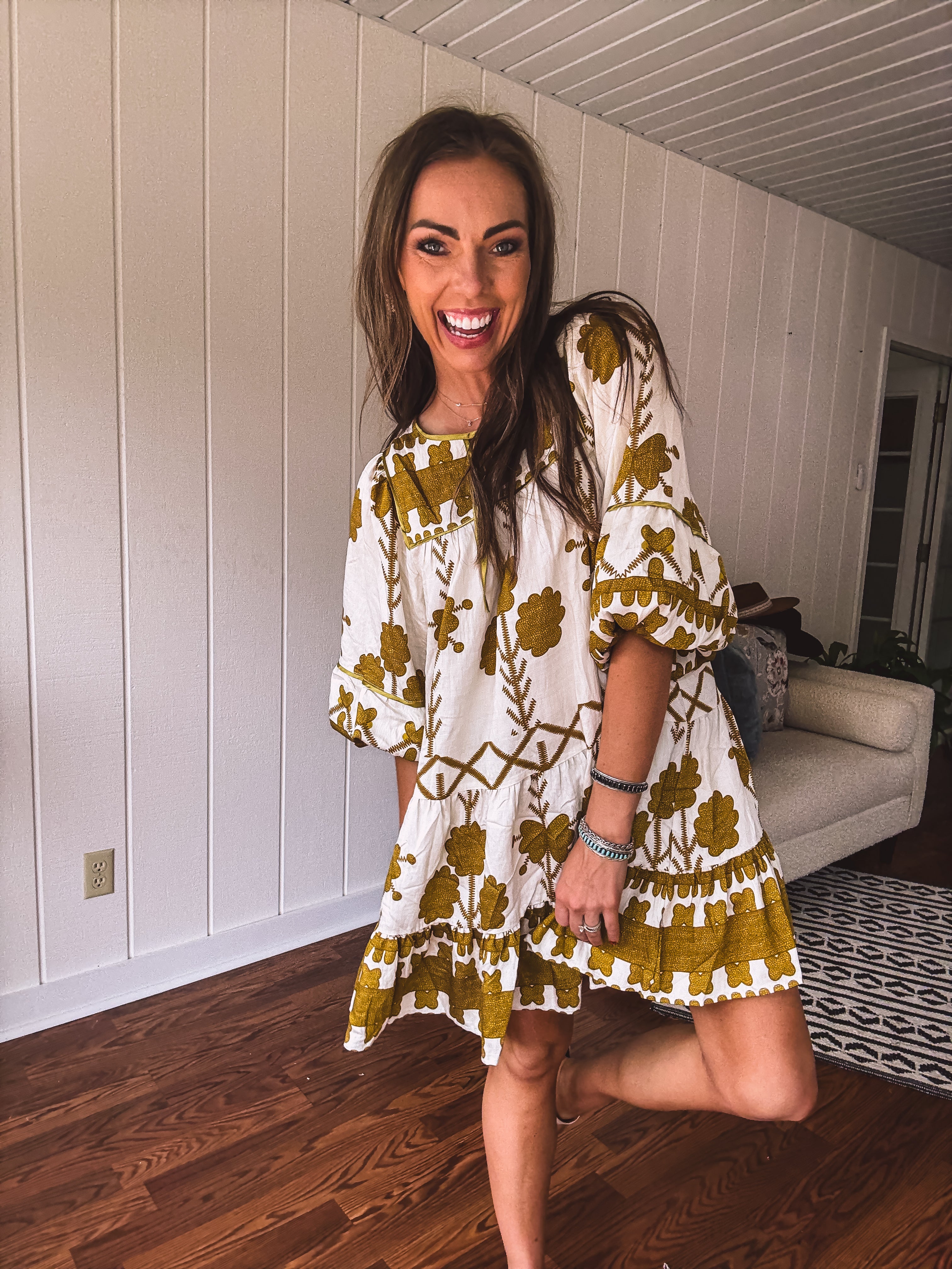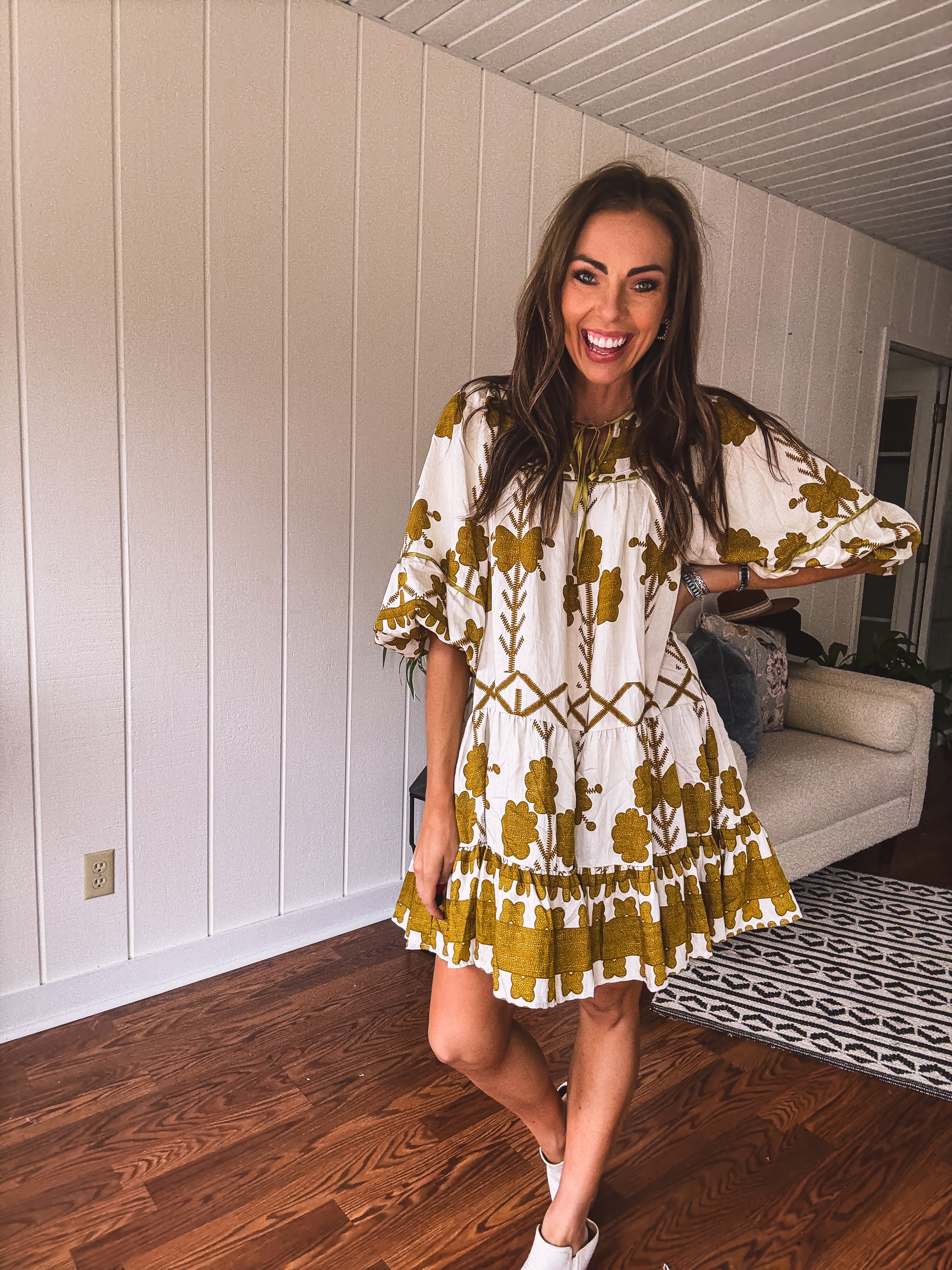 This breezy, knee-length tiered dress showcases a mustard green tribal and floral pattern on a creamy base. With a satin-trimmed yoke and neckline tied with a satin bow, plus elastic cuffs adding a boho-western flair, it’s the perfect match for your go-to boots. Whether it’s date night, a fun girls’ outing, or a casual shopping spree, this dress makes every moment feel effortlessly stylish.