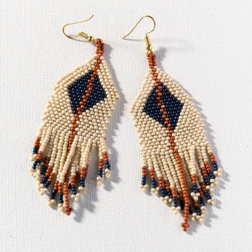 IVORY NAVY RUST DIAMOND WITH STRIPE FRINGE SEED BEAD EARRINGS