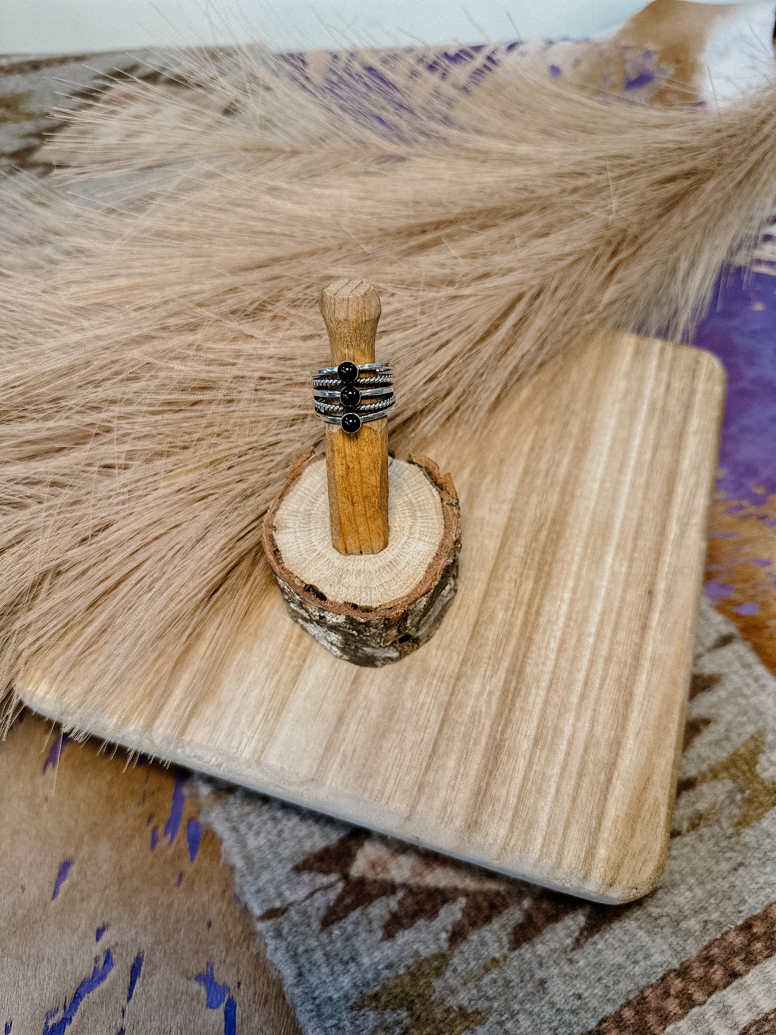 The Onyx Triple Thick Stacker Ring features three stunning Onyx stones set on alternating bands of smooth and cable style authentic Sterling Silver. Its wide design makes it a versatile accessory for any finger placement, guaranteed to turn heads. Complete your look by pairing it with our matching Onyx earrings and necklaces.