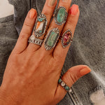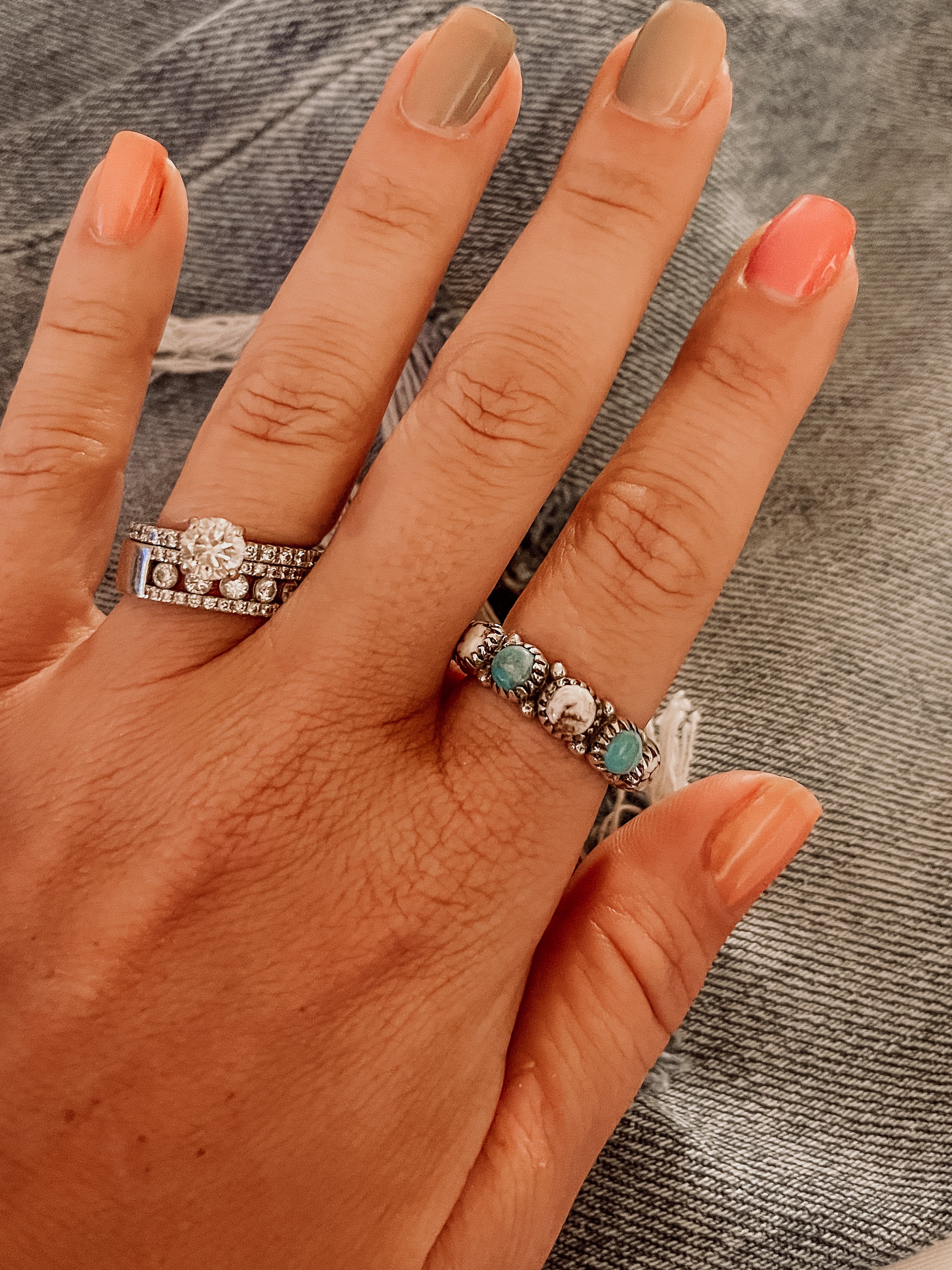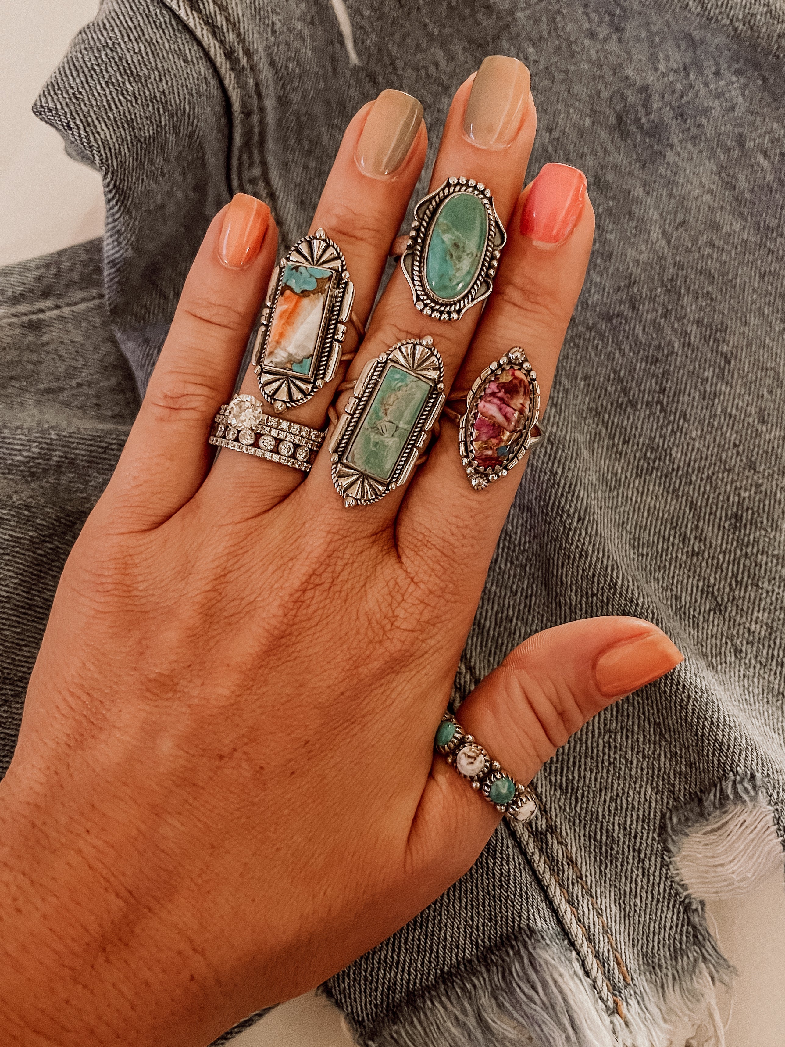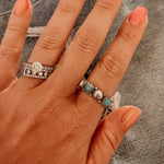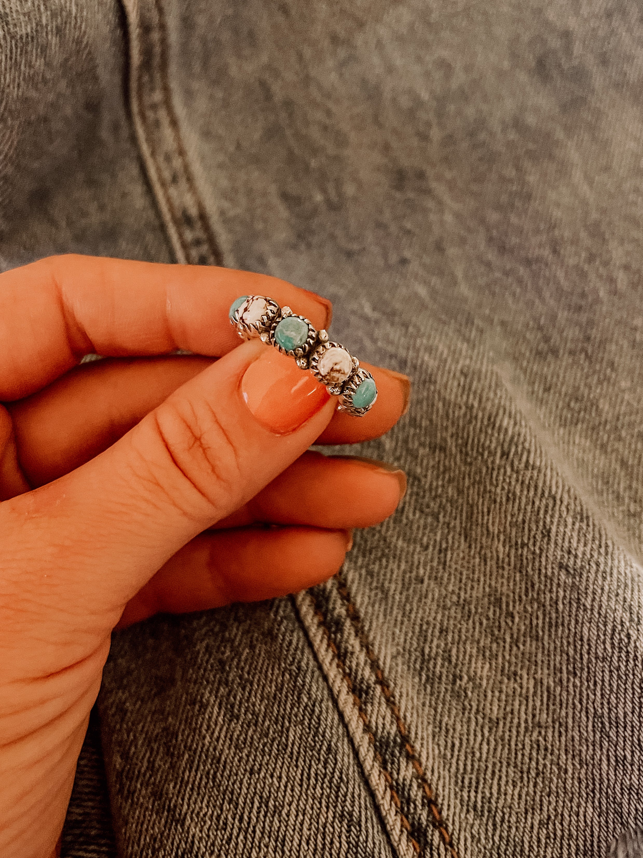 Indulge in the beauty and power of nature with our Wild Horse All Around Ring | Hada. Hand crafted with a genuine sterling silver band and alternating Wild Horse and Kingman Turquoise stones, this stunning stacker ring exudes an irresistible energy. The intricate design, complete with silver dot accents, makes it a truly unique and striking piece. Wear it alone for a statement look or stack it with our other sterling silver rings for an even more powerful and mesmerizing effect.