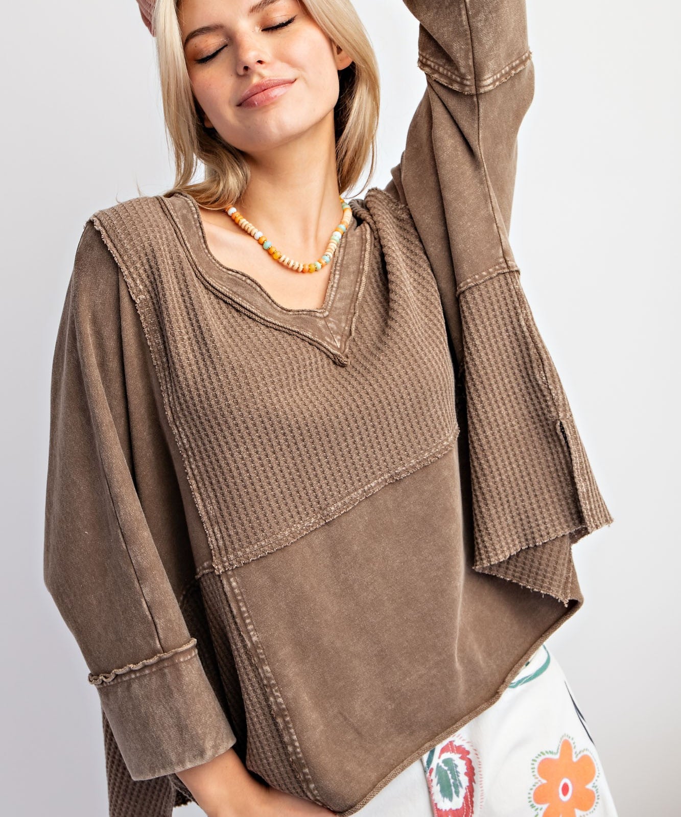 Ash Brown Thermal Knit V Neck Mineral Wash