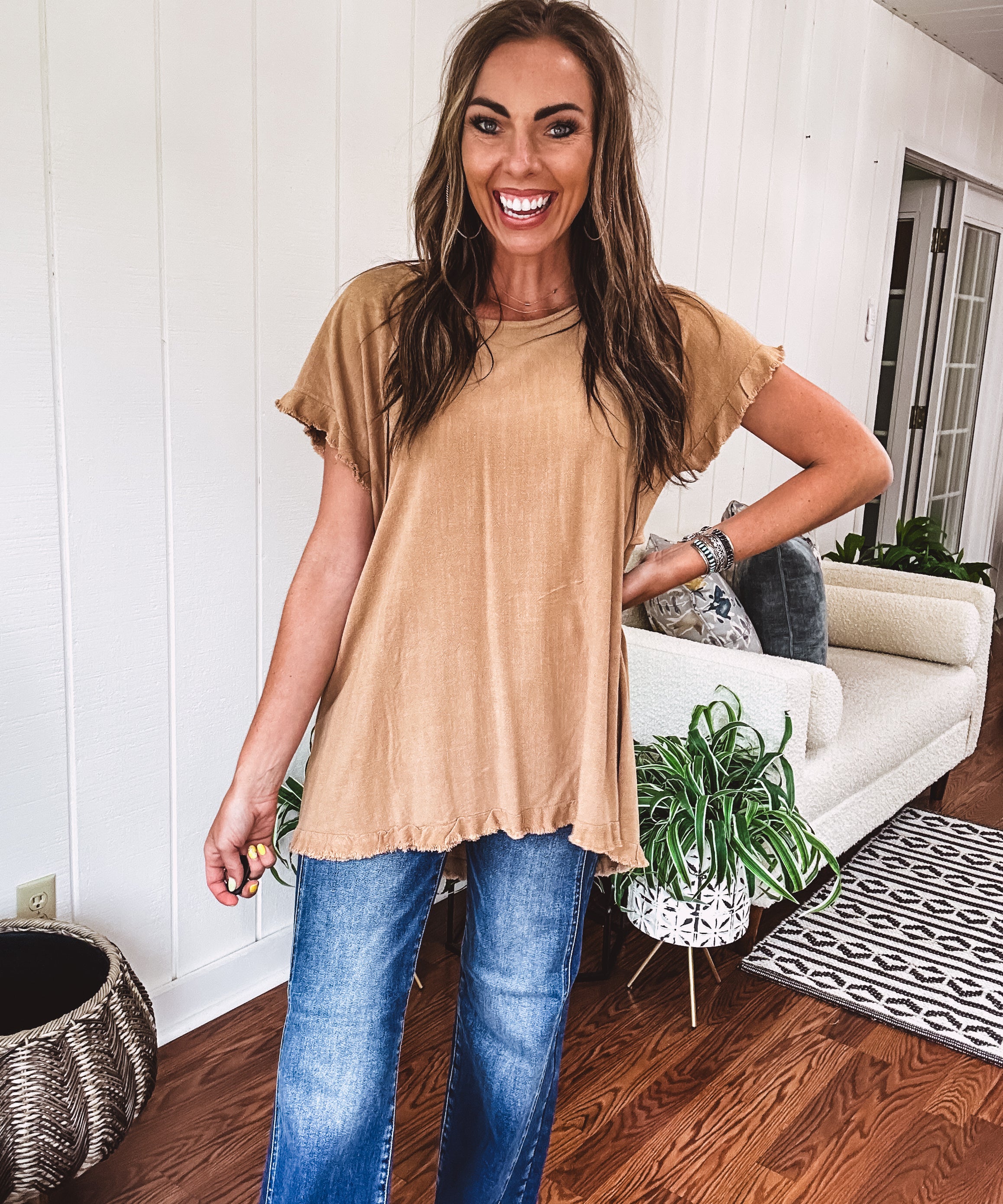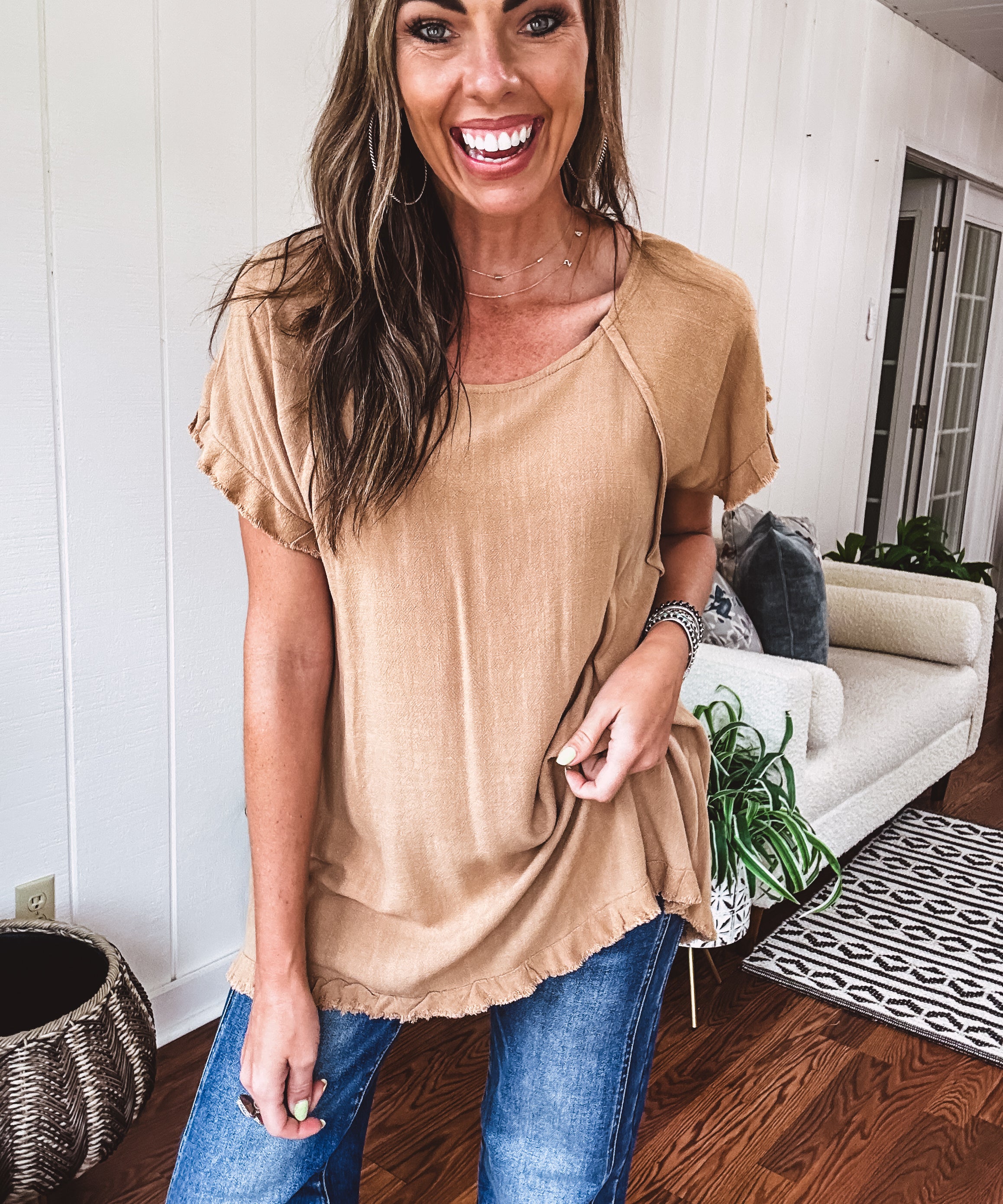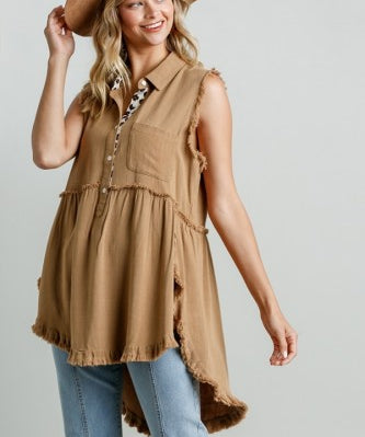 Toffee Linen Like Top with Fray Edges