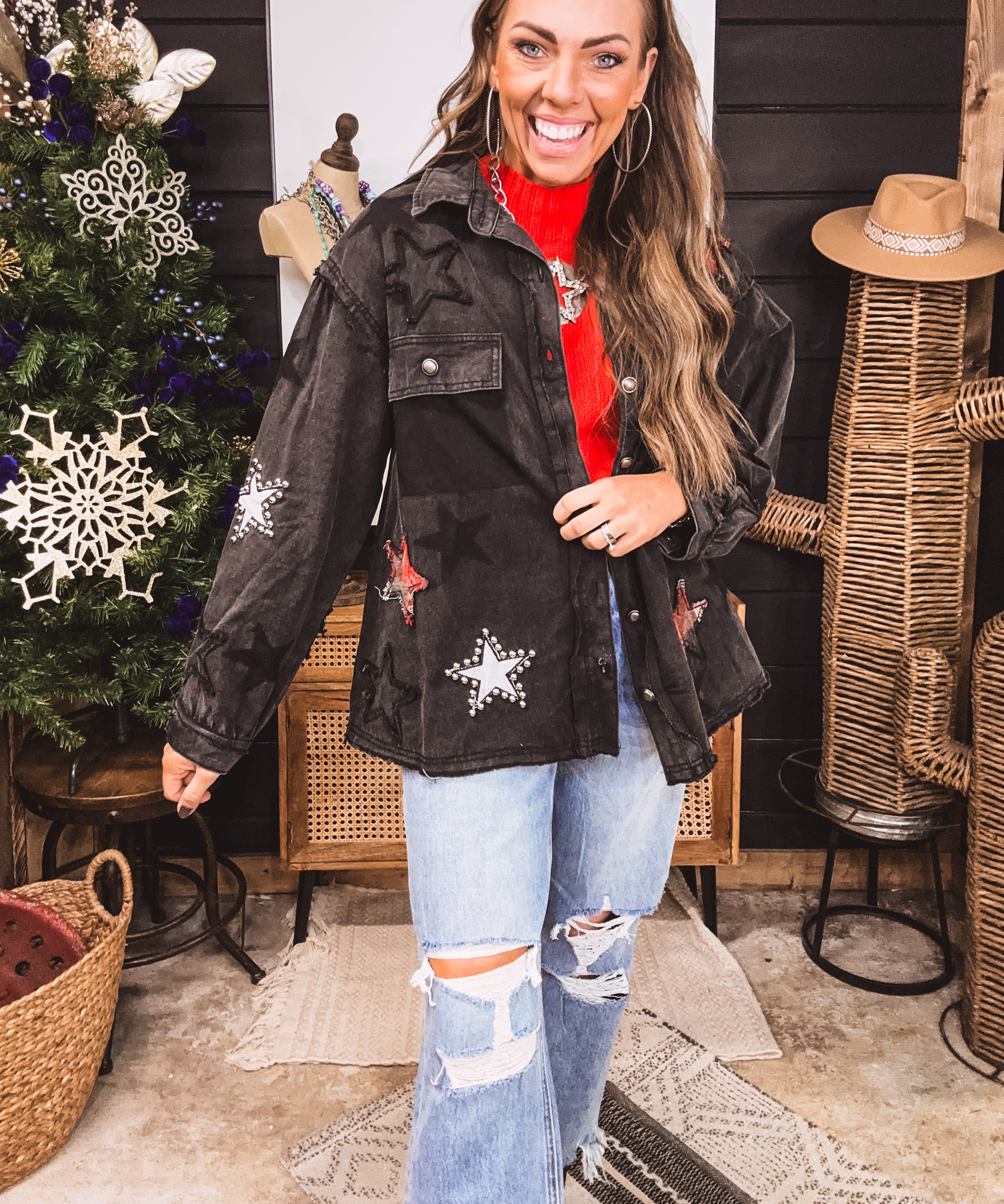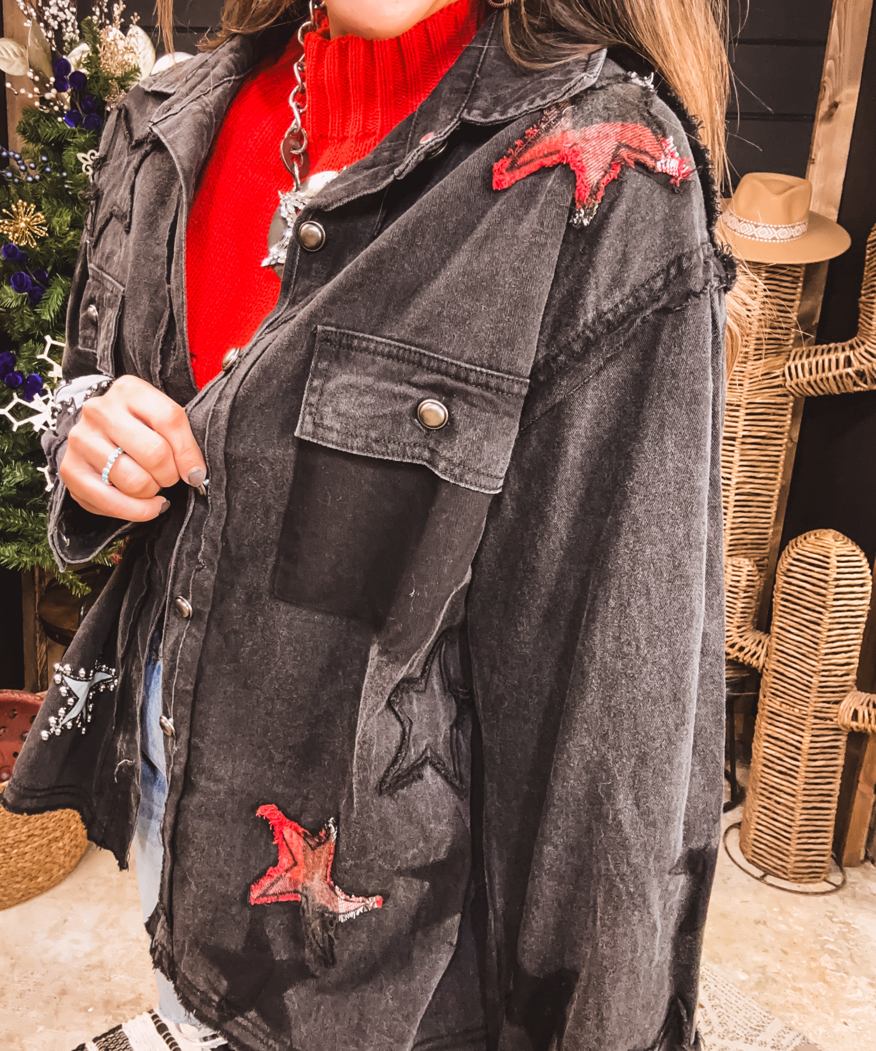 Black Faux Leather Moto Jacket with Gingham Contrast