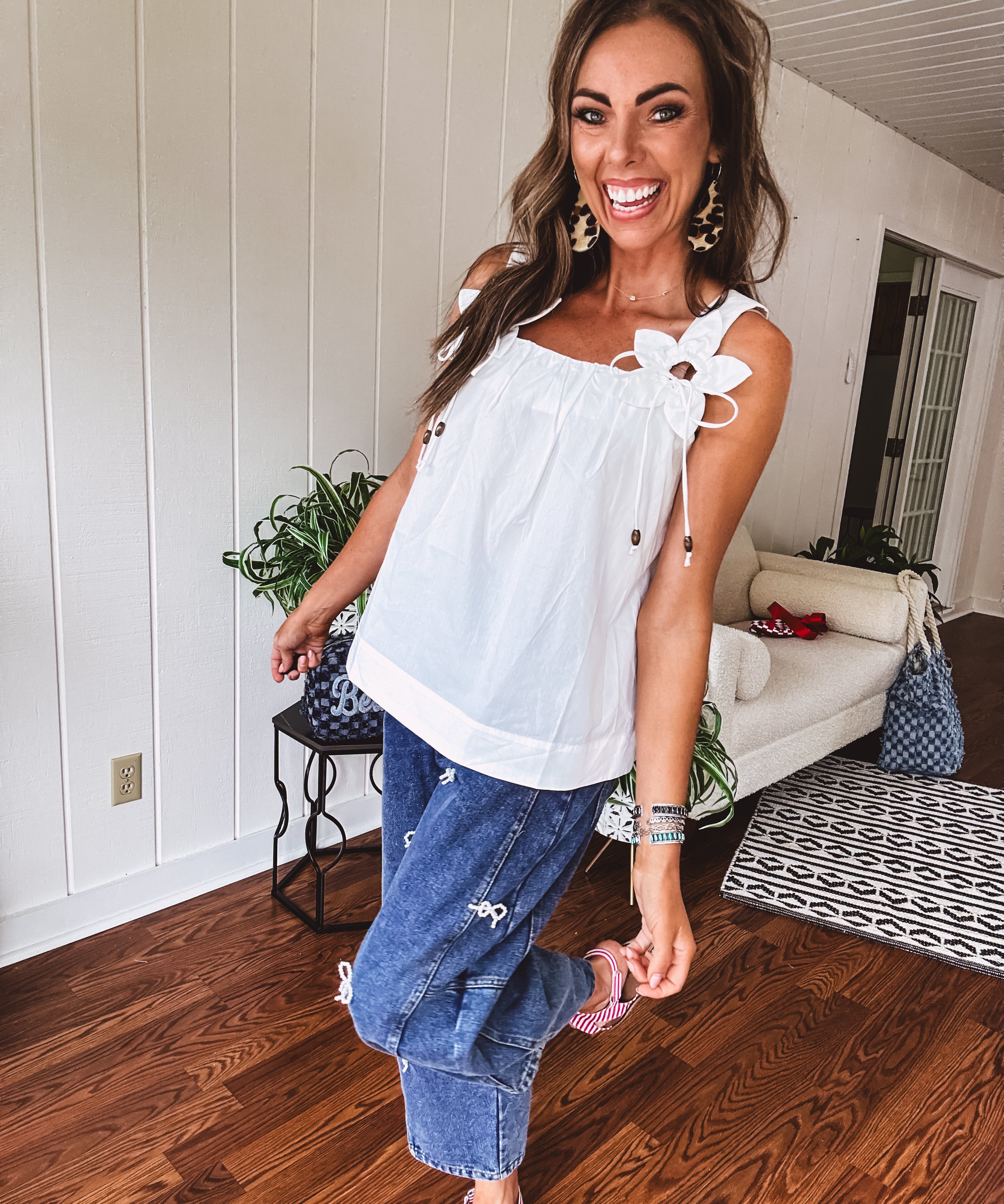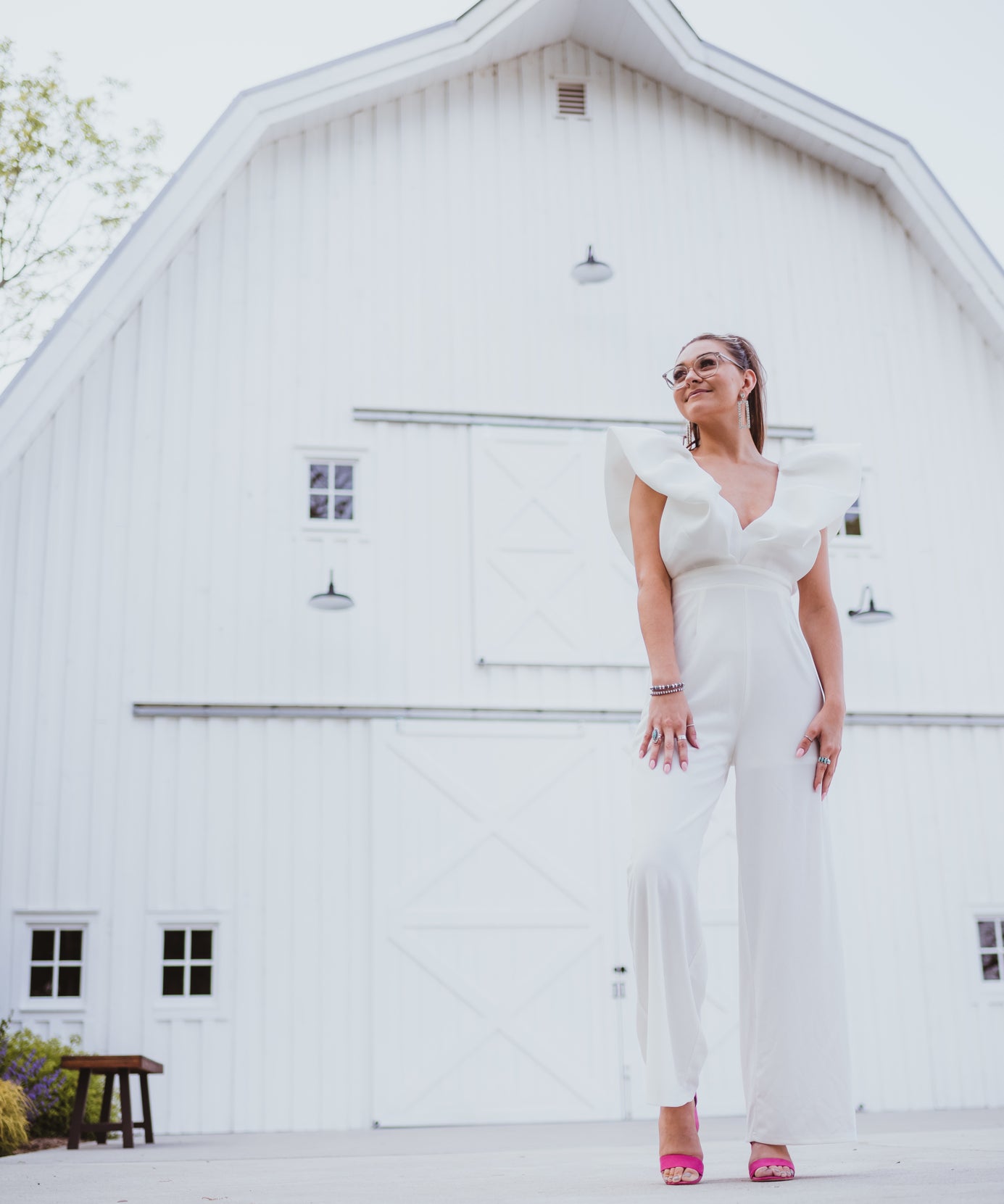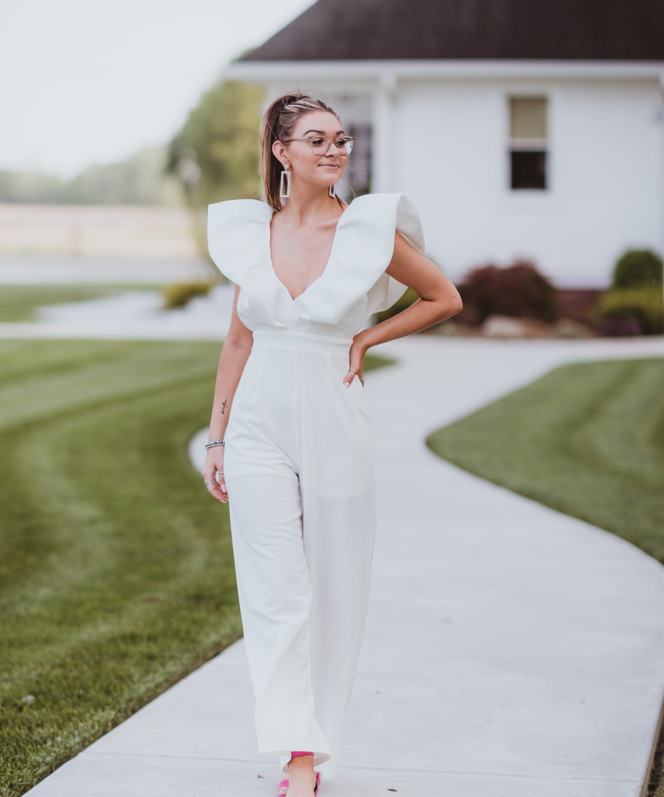 White Luxe Jumpsuit with Zipper Back + Puff Sleeve