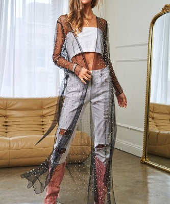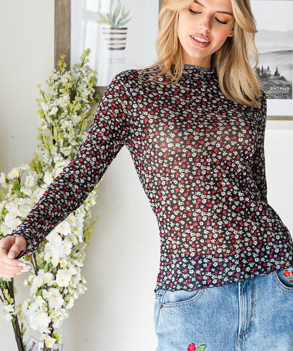 Black Long Sleeve Mesh Top With Sparkle Detail