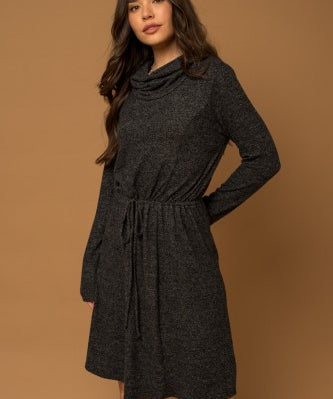 Black Long Sleeve Cowl Neck Hacci Drawstring Dress