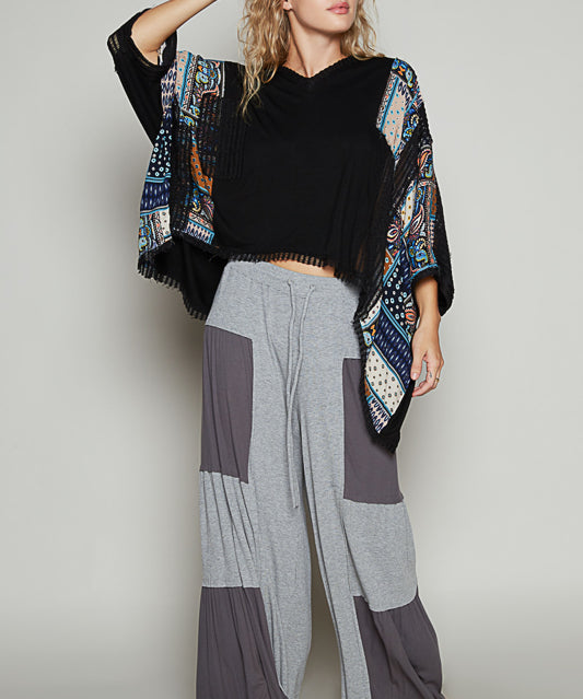 Black Mix Fabric Crochet Accent Easy Pullover