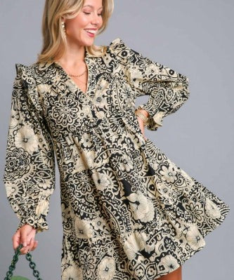 Black Mix Paisley Print L/S Tiered Dress