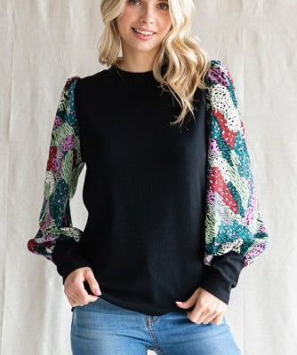 Black Mixed Print Sleeve Pullover