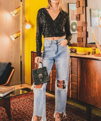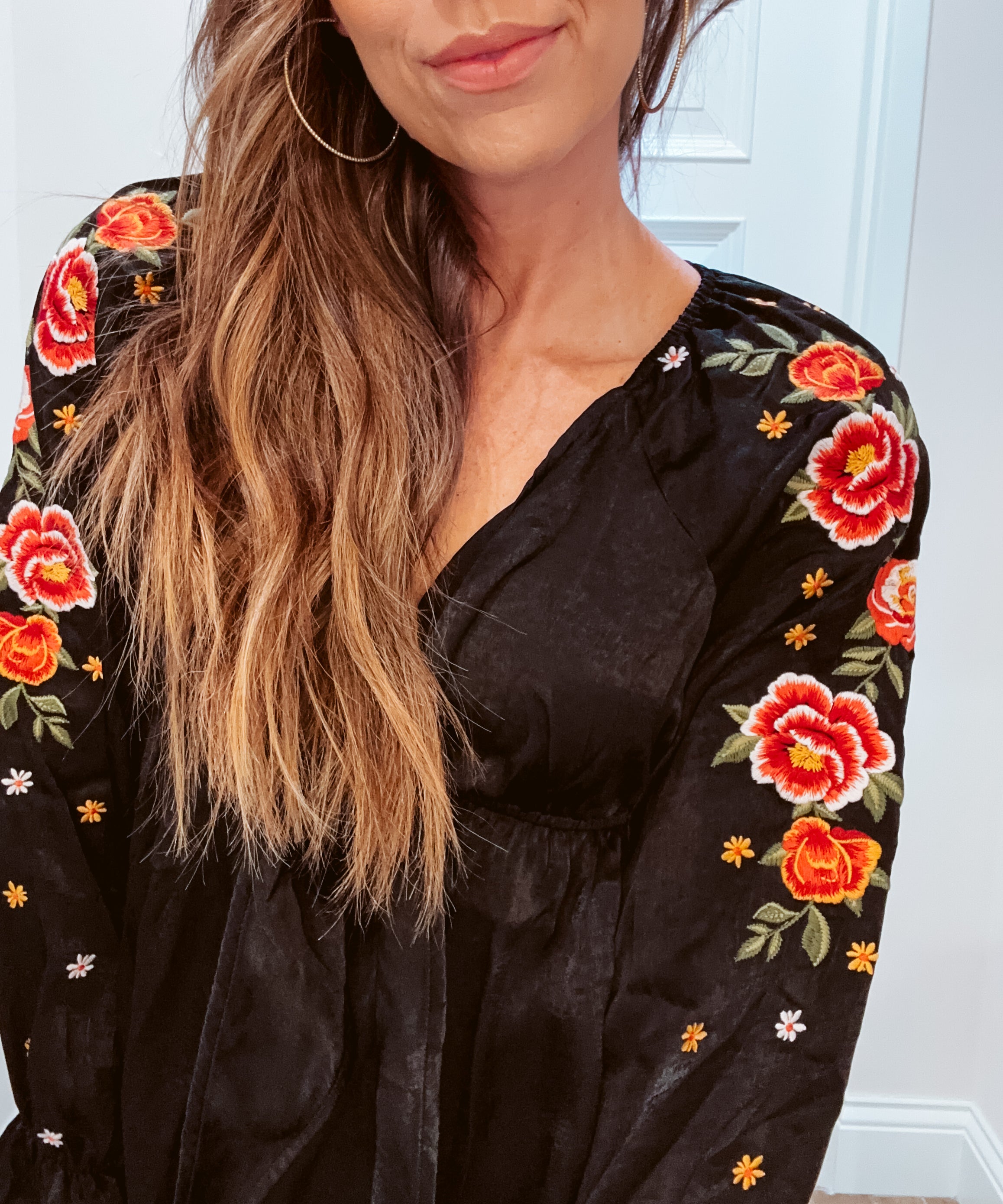 Black Silky Satin Embroidered Sleeve Babydoll Top