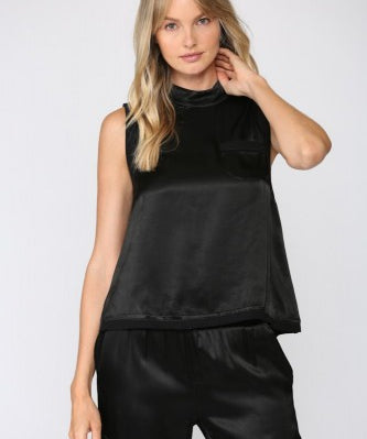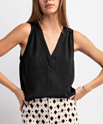 Black Silky Satin Pintuck V Neck Tank Blouse