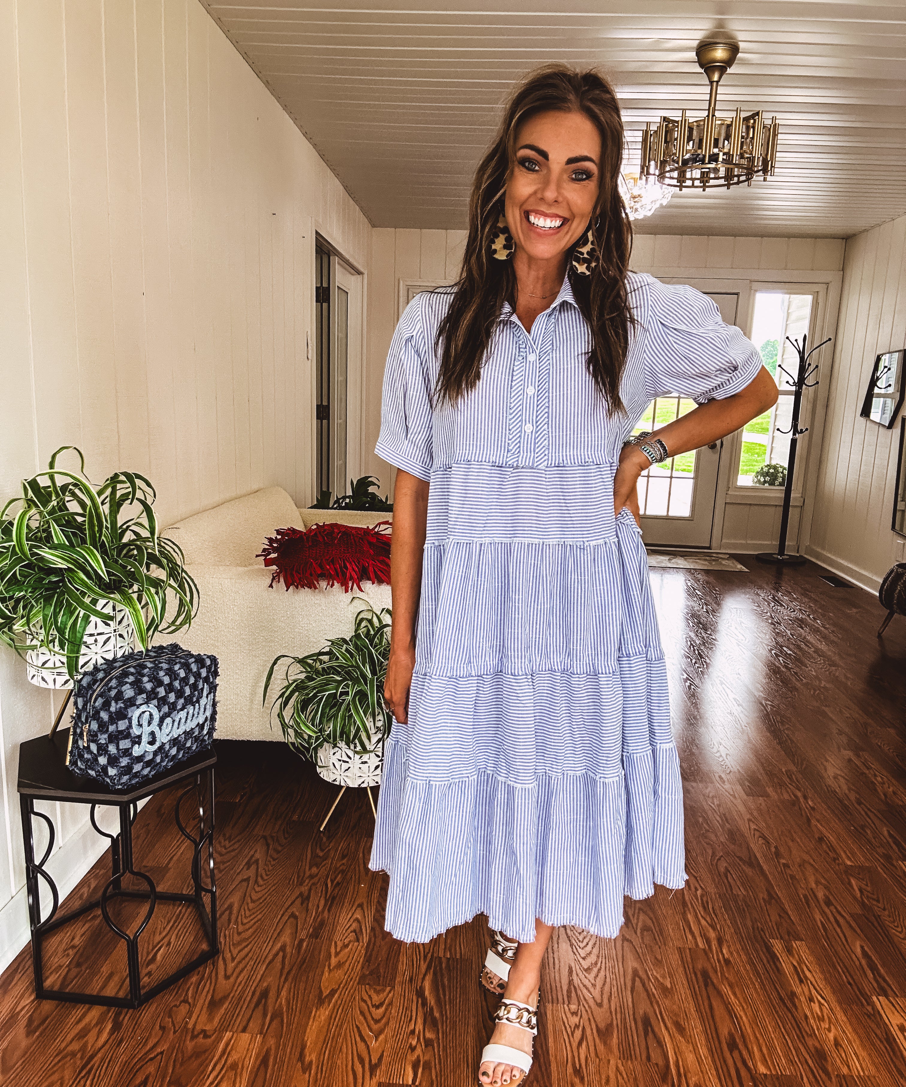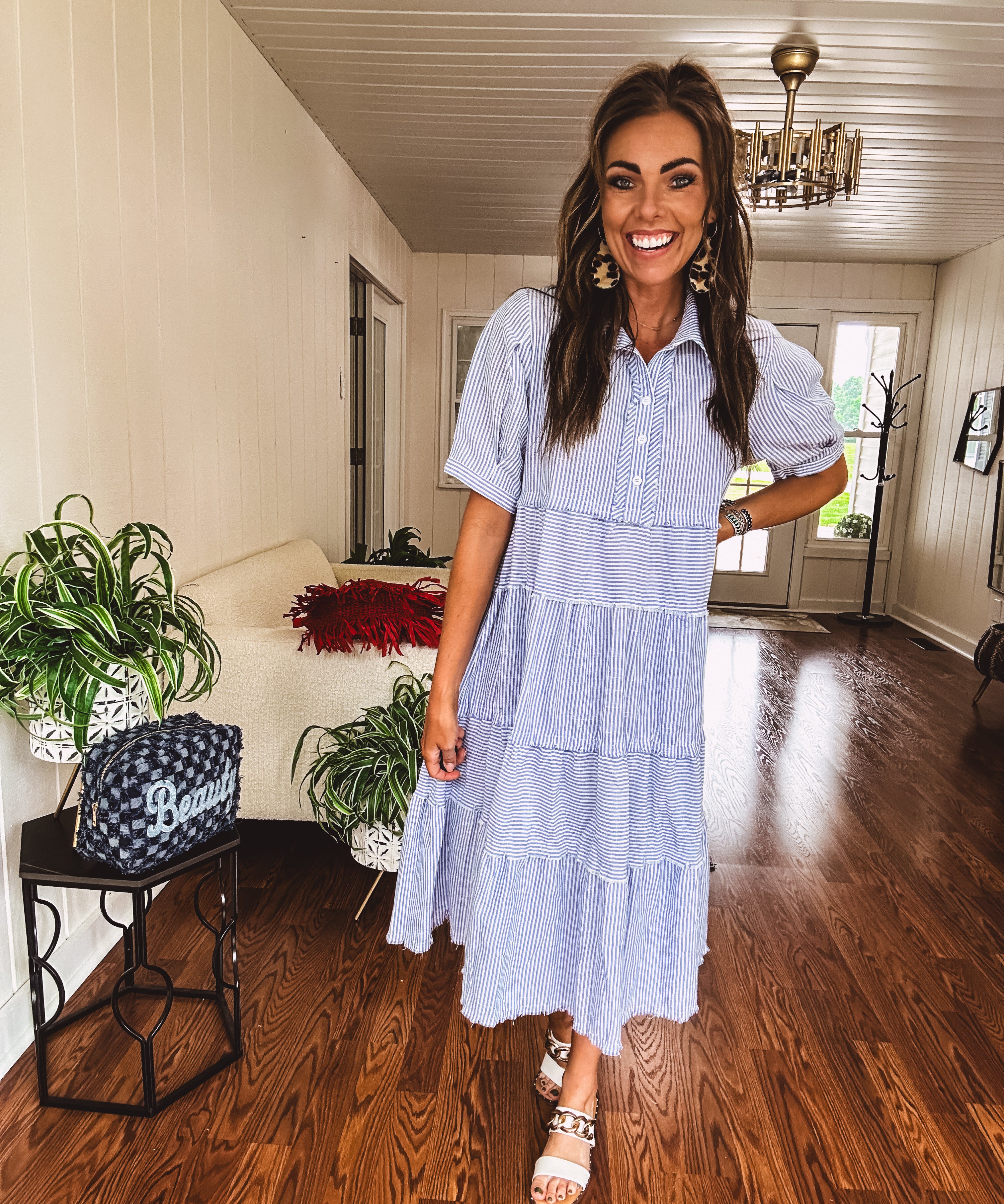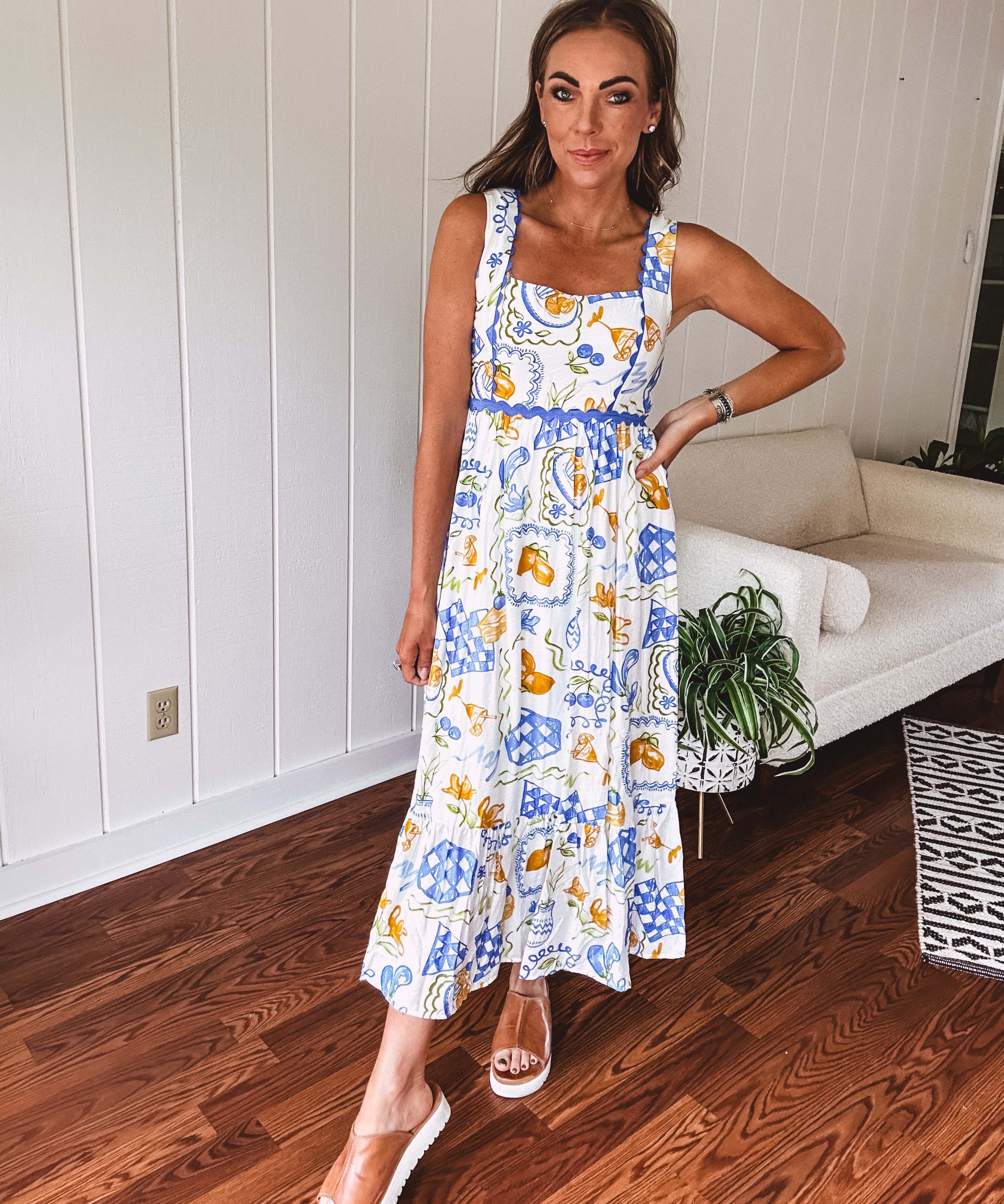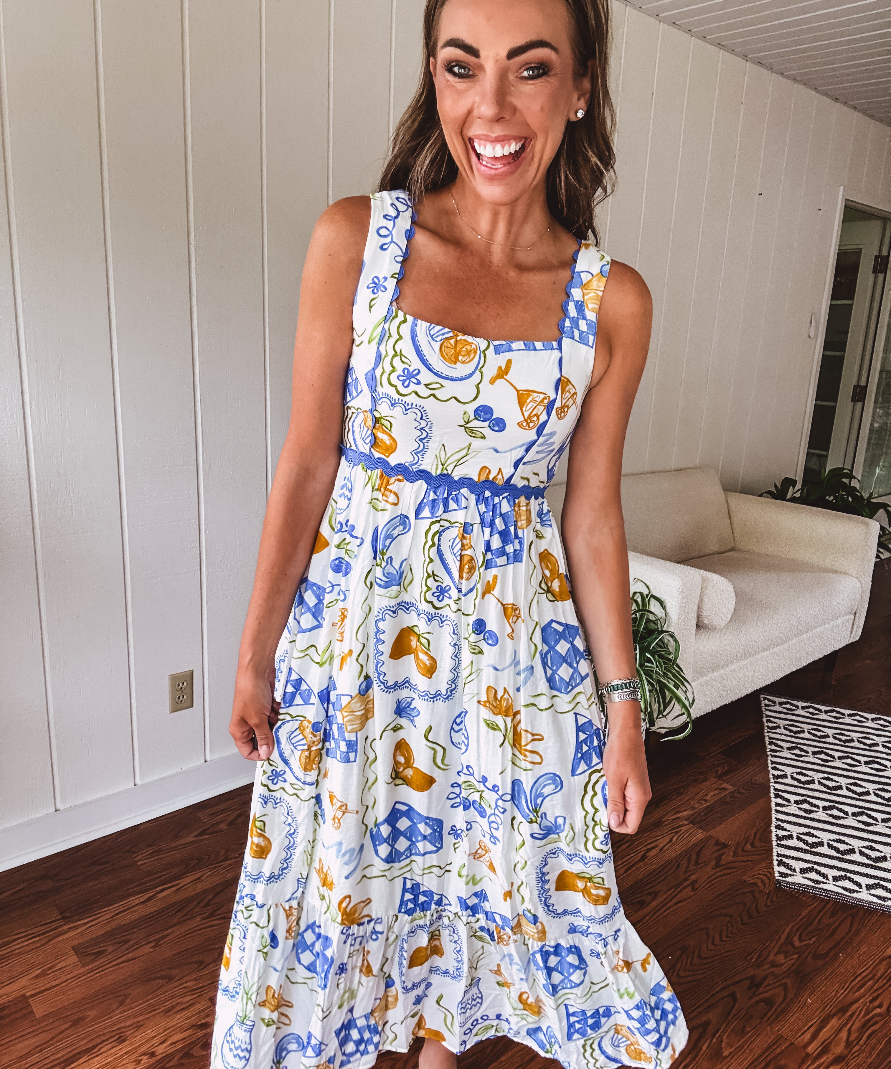 Blue + White Picnic Print Scallop Trim Midi Dress