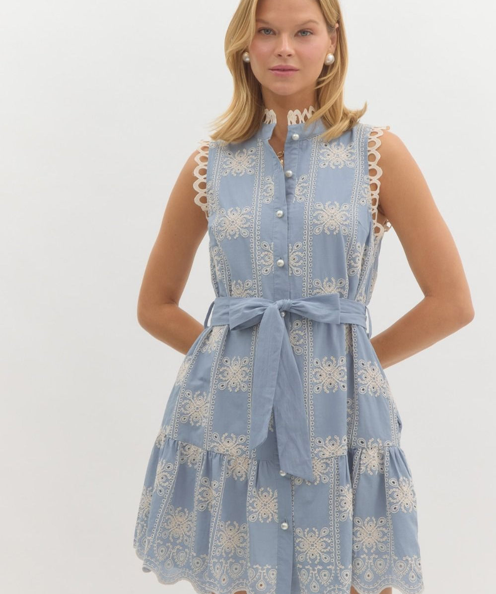 Blue Embroidered Sleeveless Mini Ruffle Dress with Crochet Trim