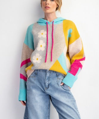 Blue Mustard Pattern Knit Floral Stripe Hooded Sweater
