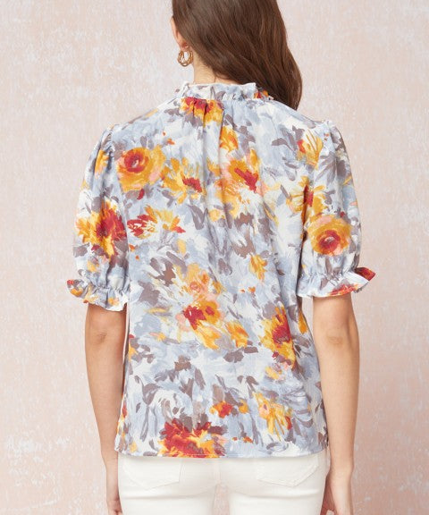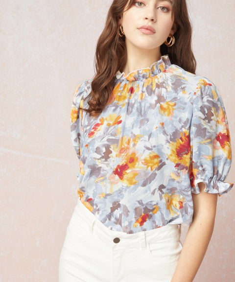 Blue Navy Floral Mix Mock Neck Sheer Mesh
