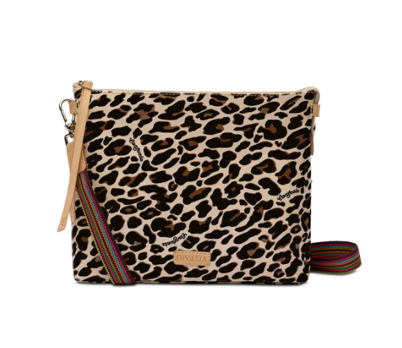 This playful Downtown Crossbody, Mona, features a zipper closure and a handy interior blue foil slide pocket. It now comes with a clip-on, adjustable, and removable woven strap for extra versatility. Crafted with natural, untreated leather trim and a Mona ConsuelaCloth™ exterior, it’s as fun as it is functional.