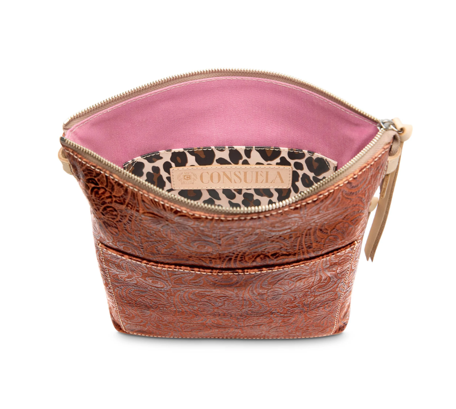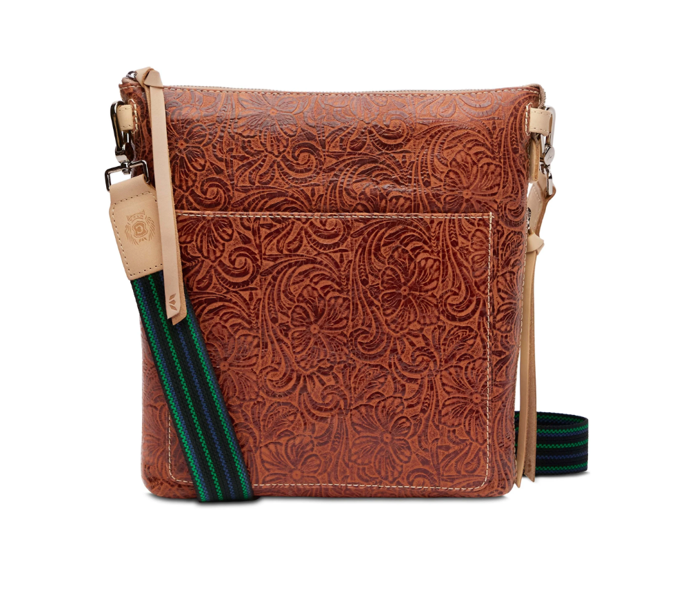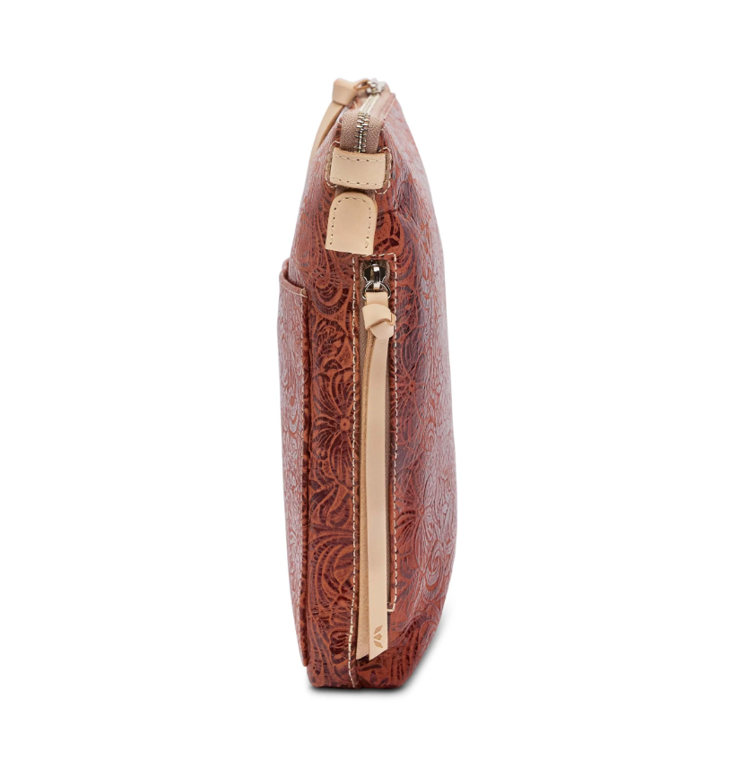 Expertly crafted in Mexico, the Tour Crossbody Sally boasts a tooled leather exterior and zip top closure for secure storage. Stay organized with front slip and secret side zip pockets, as well as interior pockets featuring a fun leo print on a pink glittery background. The adjustable crossbody strap offers a comfortable fit while on the go.