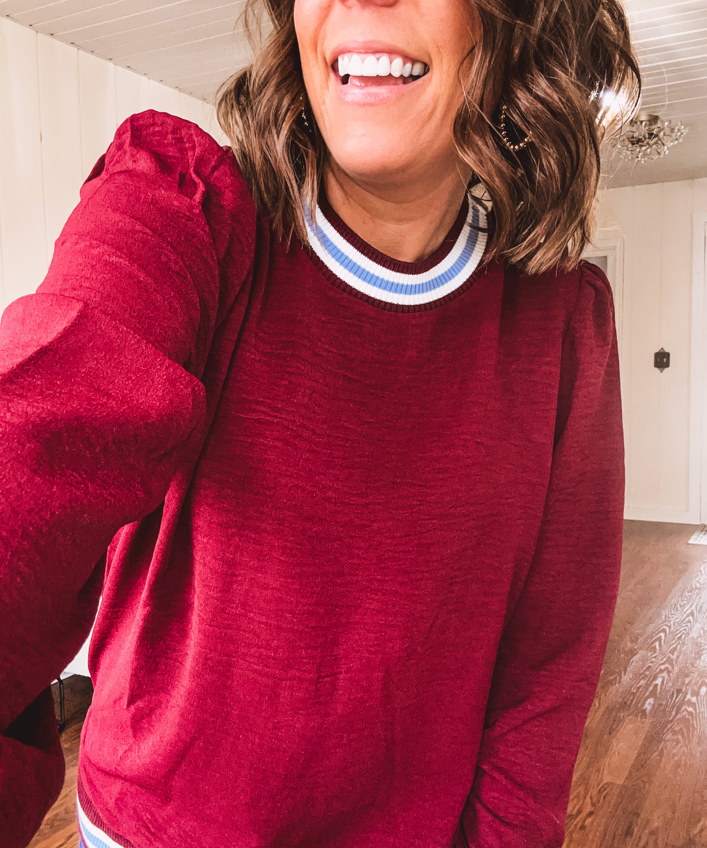 Oatmeal + White Stripe Top with Floral Embroider Sleeve