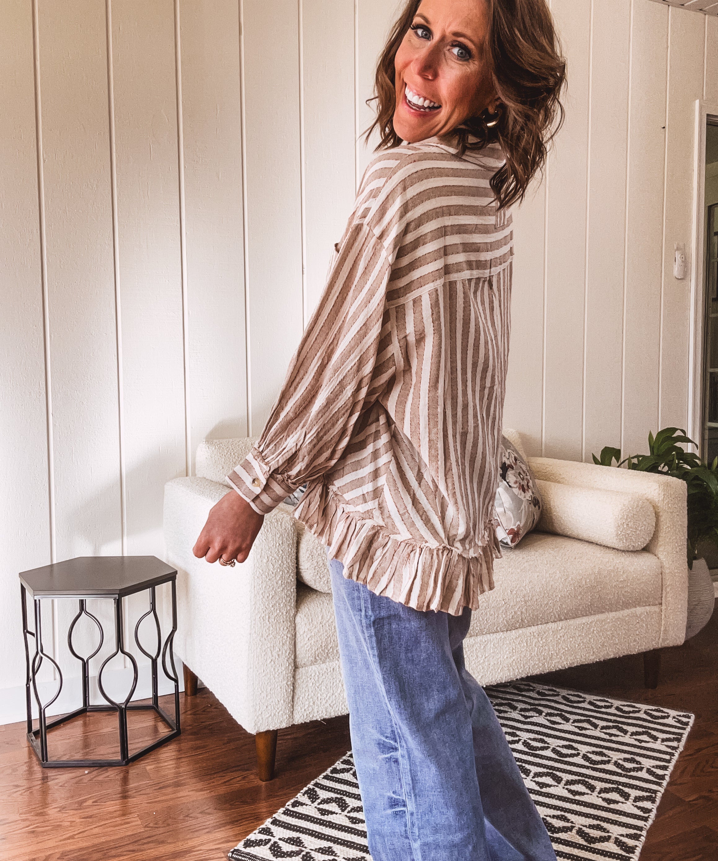 Mushroom 3/4 Sleeve Stripe Peplum Button Up