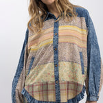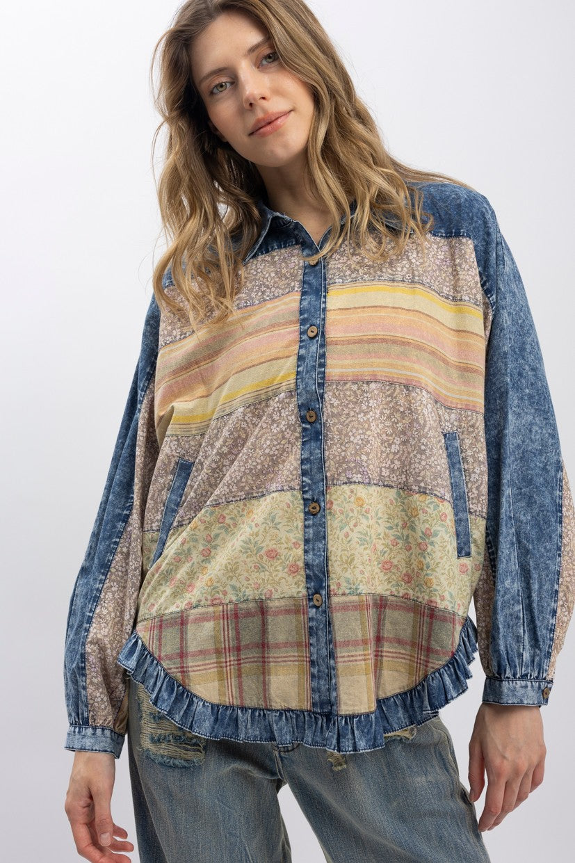 Denim Flutter Trim Mix Fabric Button Up Shirt