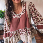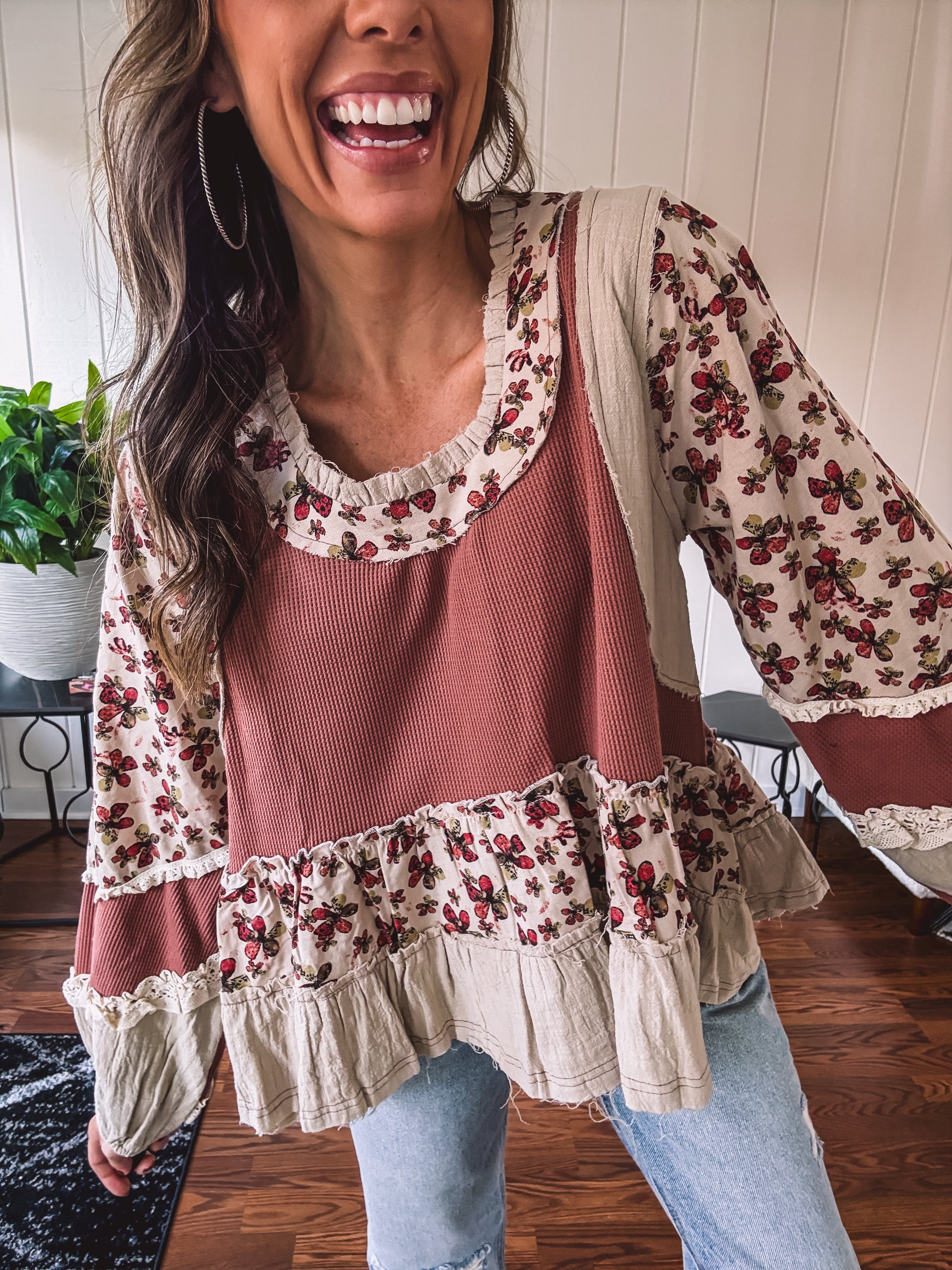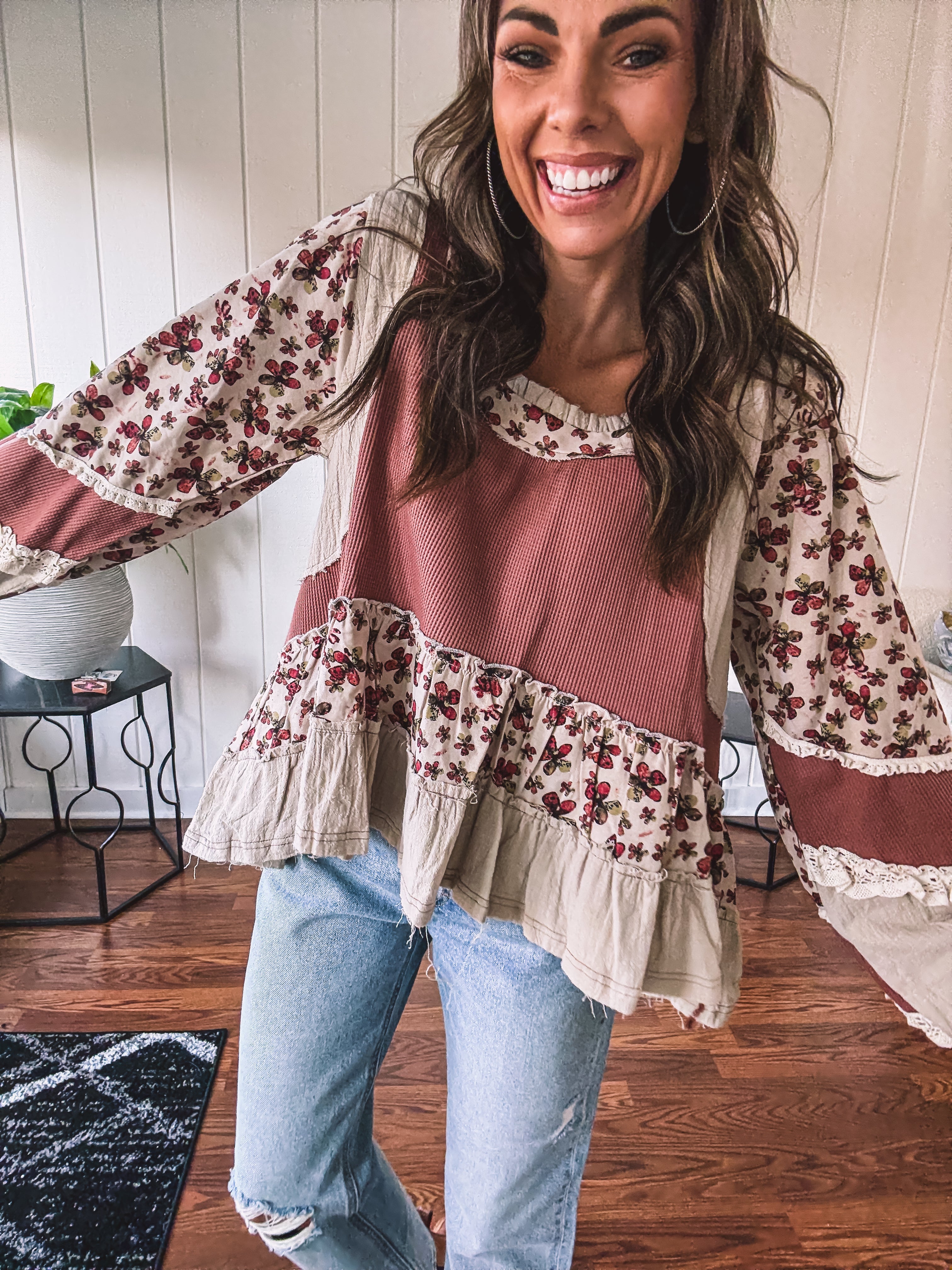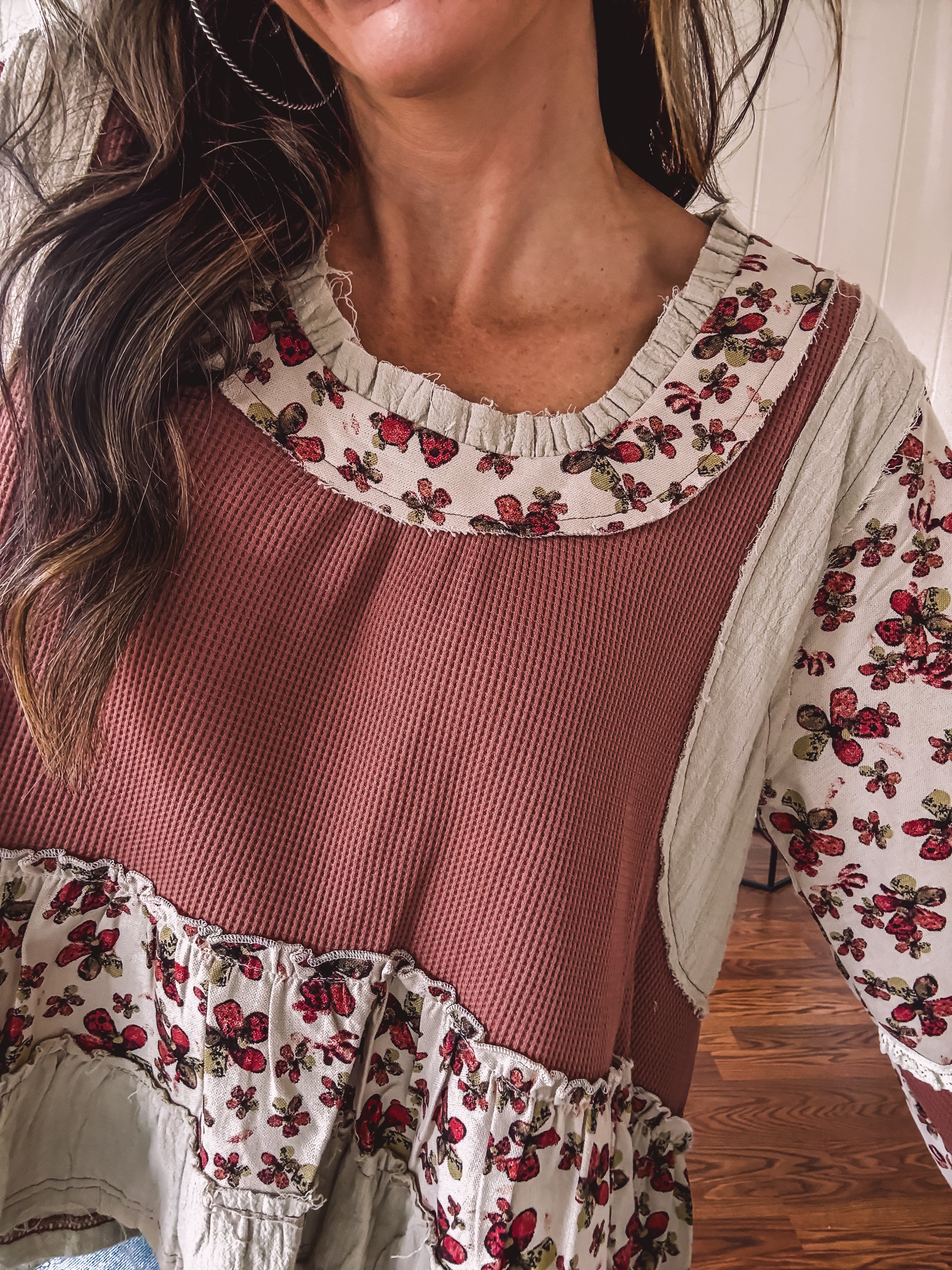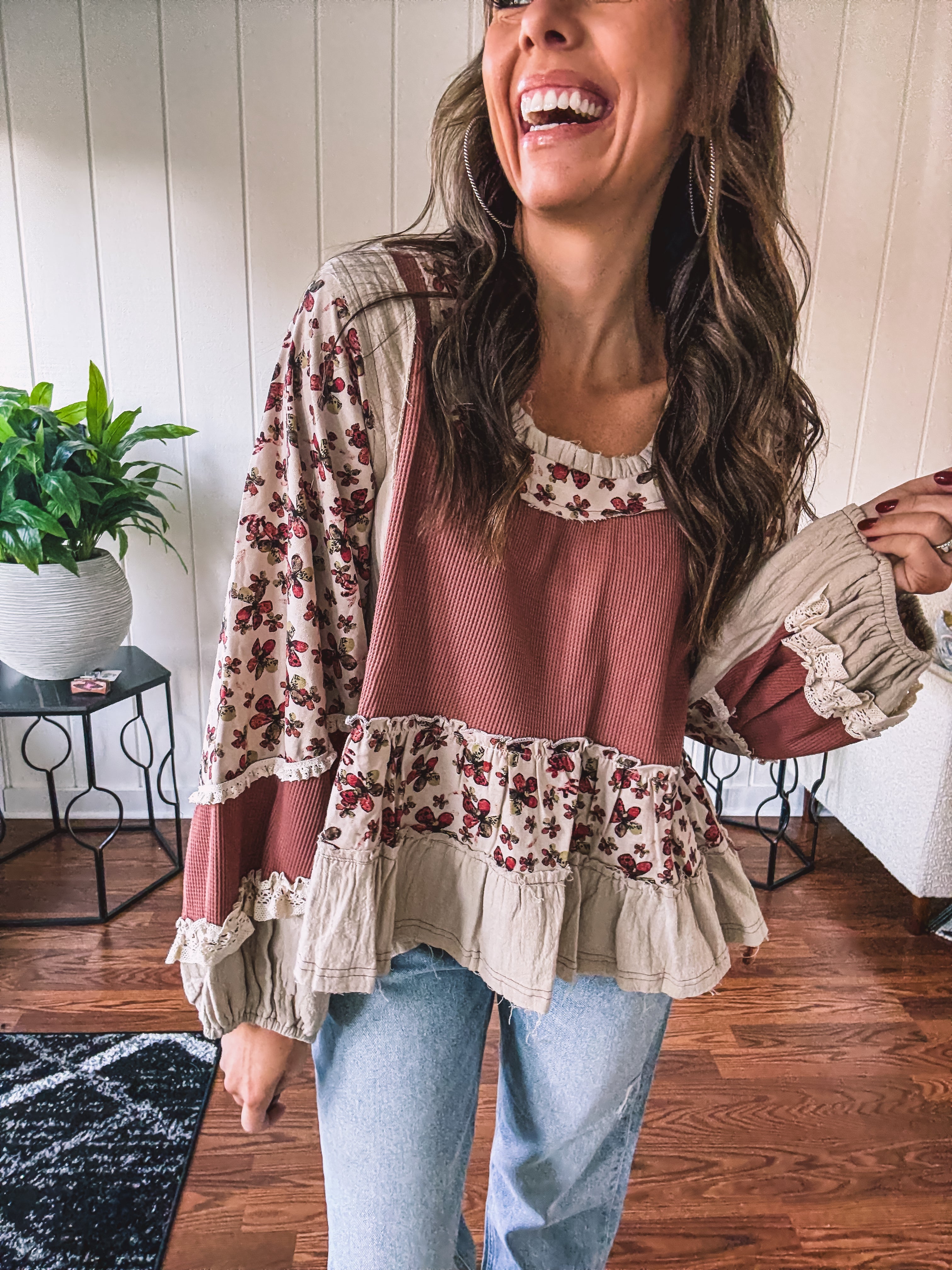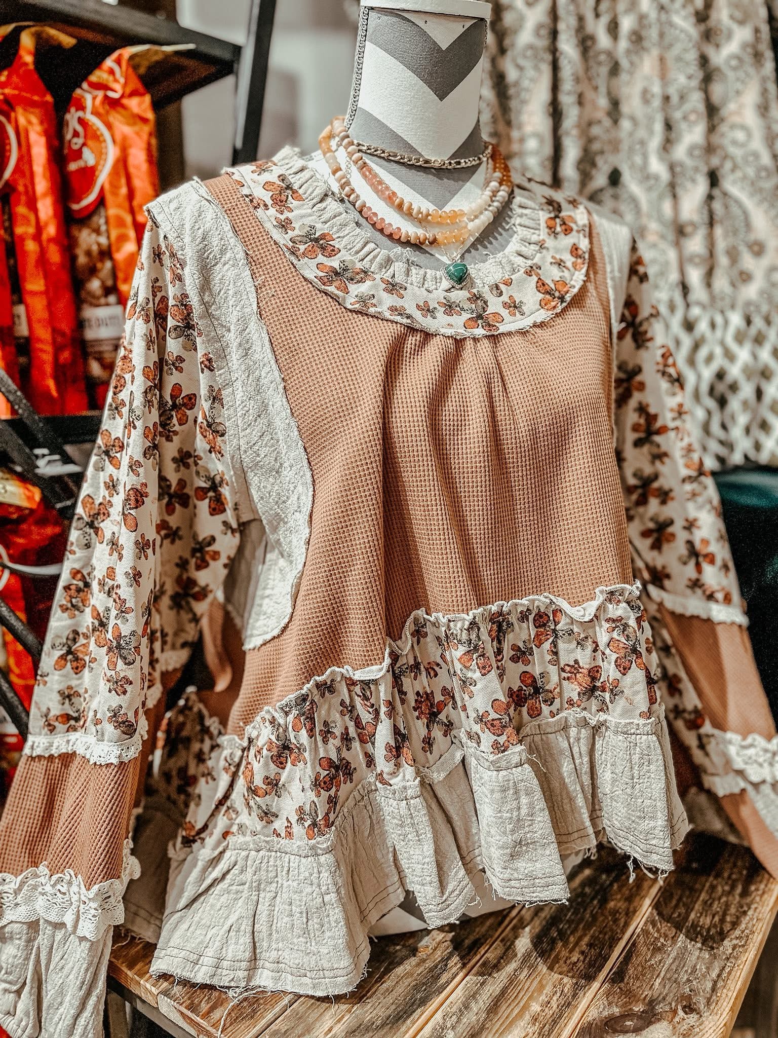 This dreamy dusty rose thermal pairs perfectly with soft taupe gauze and an enchanting floral print for a look that's totally boho-chic. Delicate lace trim, a playful ruffled hem, and stretchy cuffs create that effortless, flowy vibe you've been craving. Style it with your go-to jeans or flowing bottoms for an instant boho moment that feels like a warm hug!
