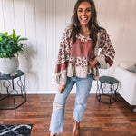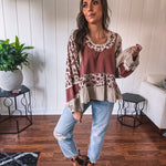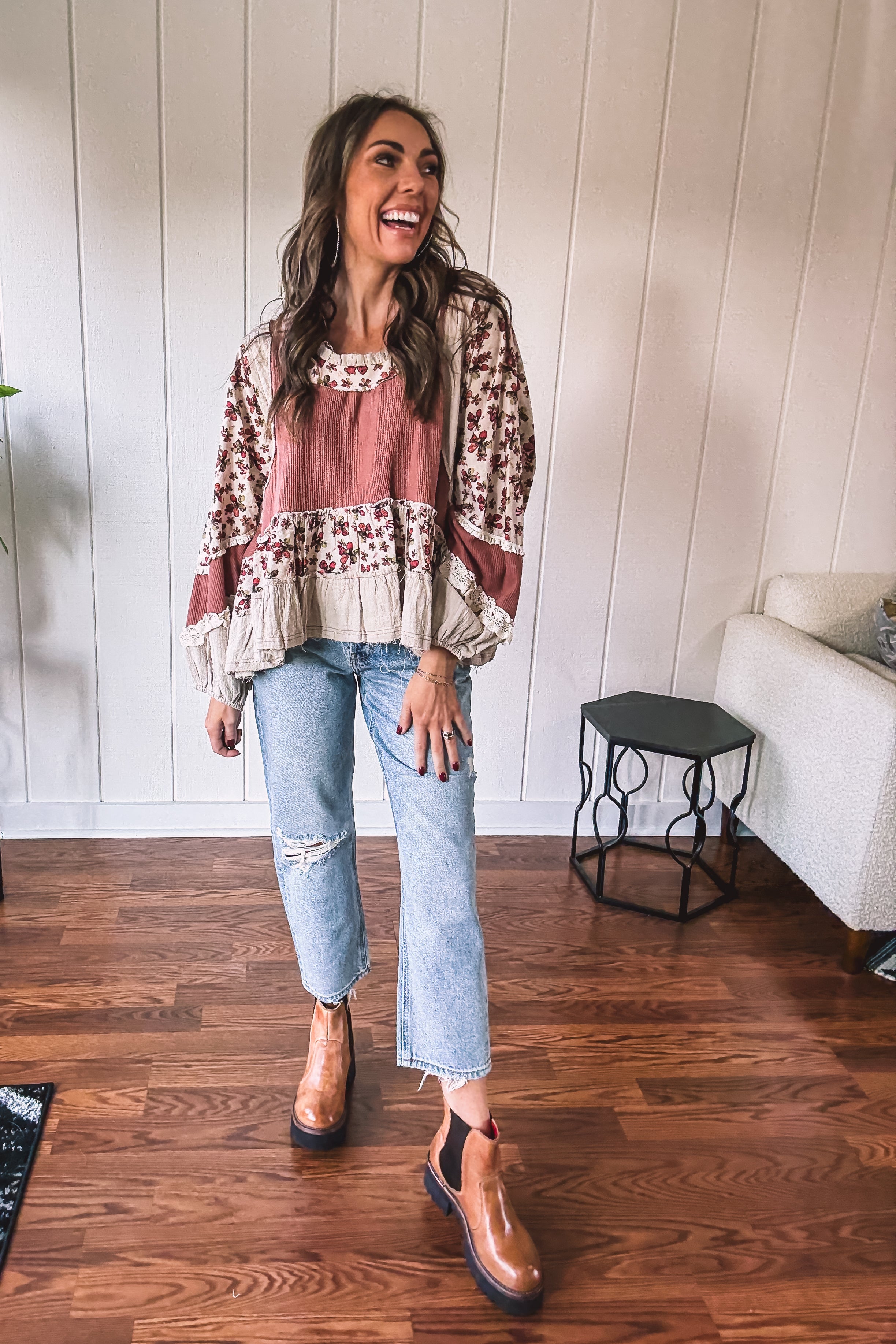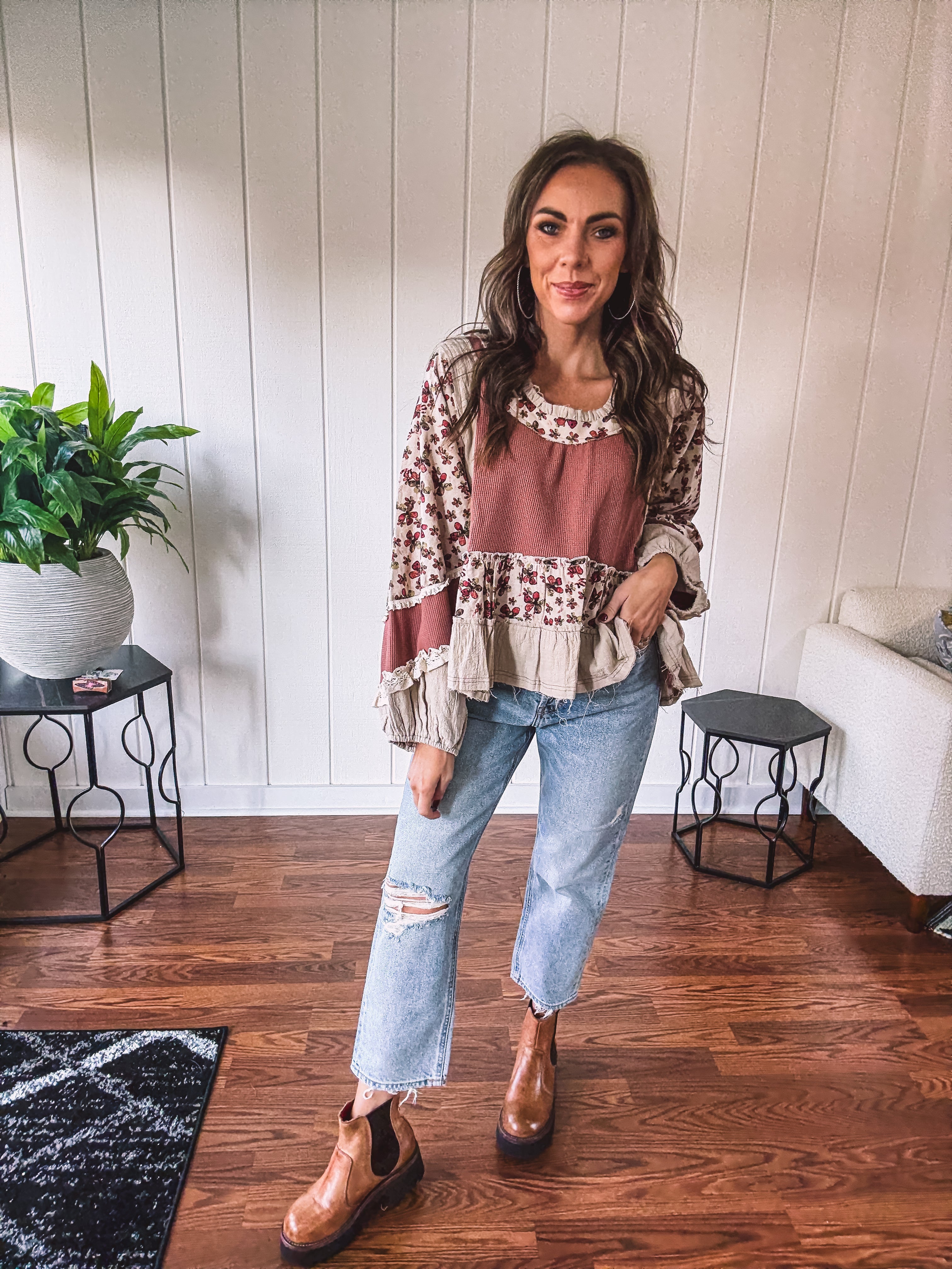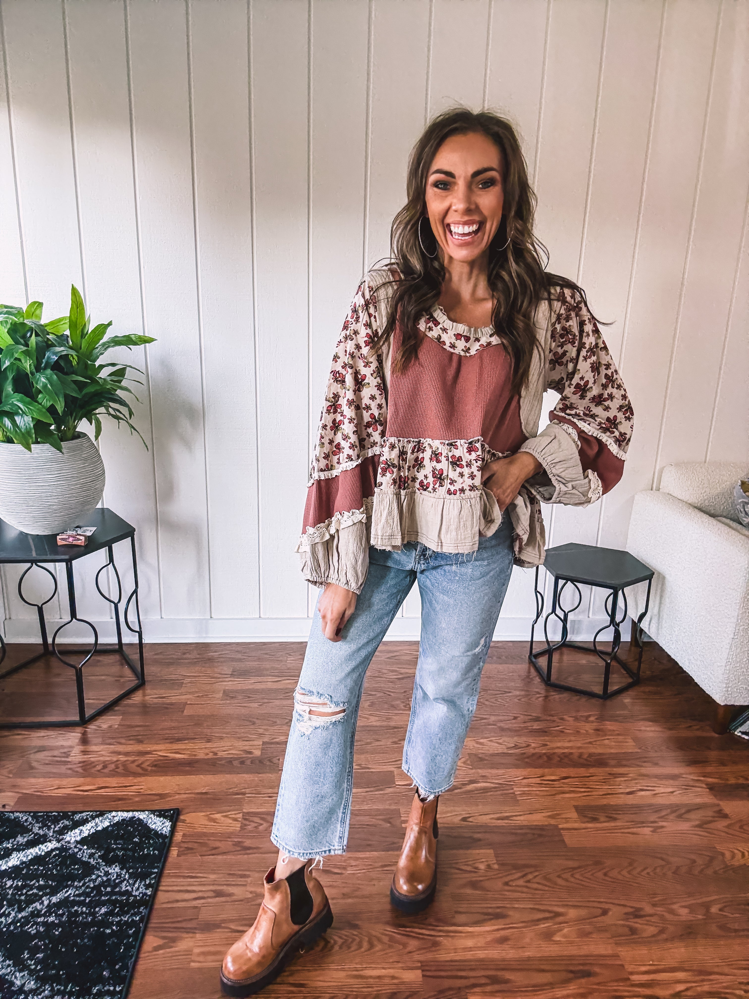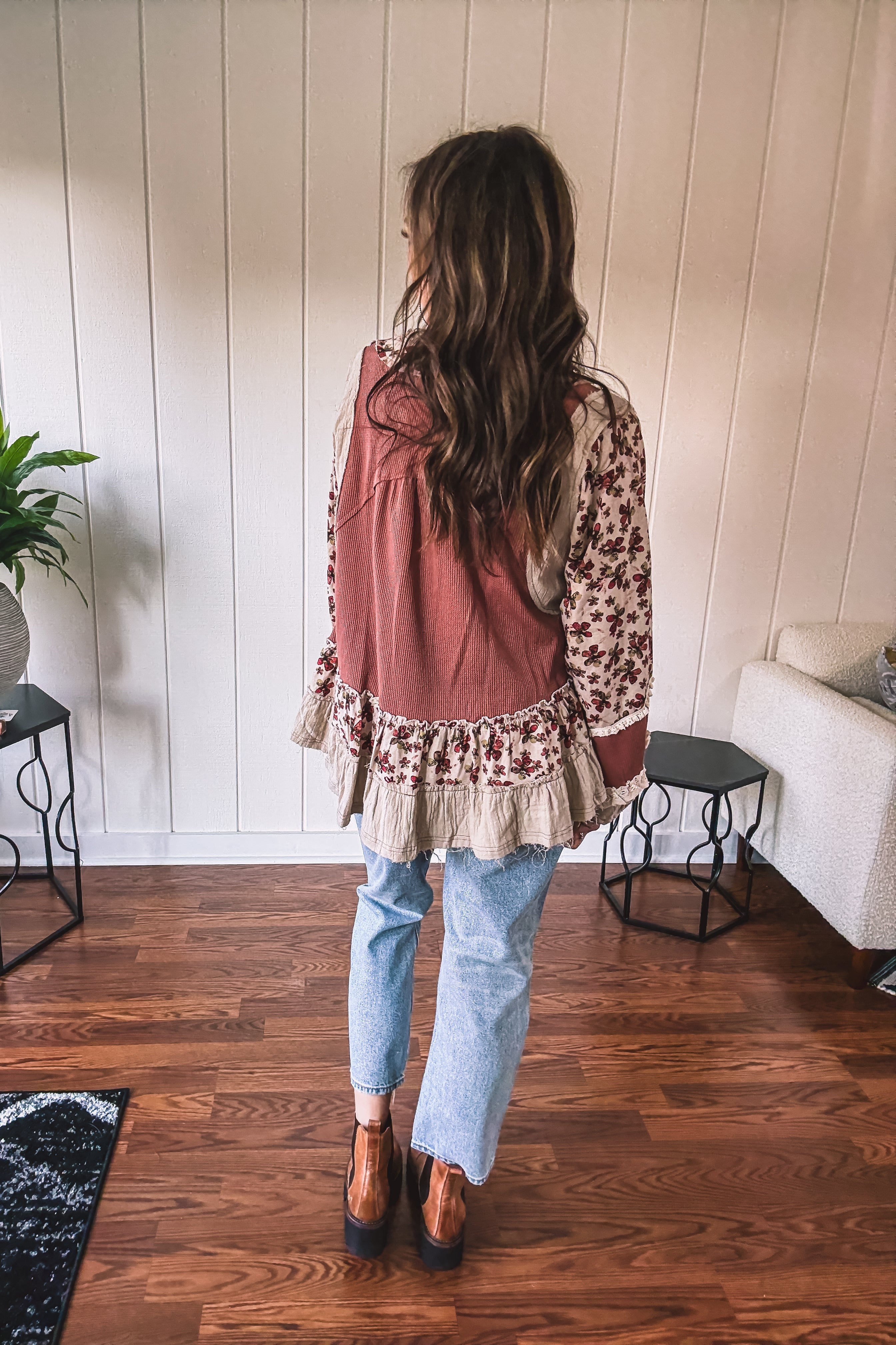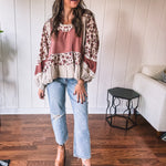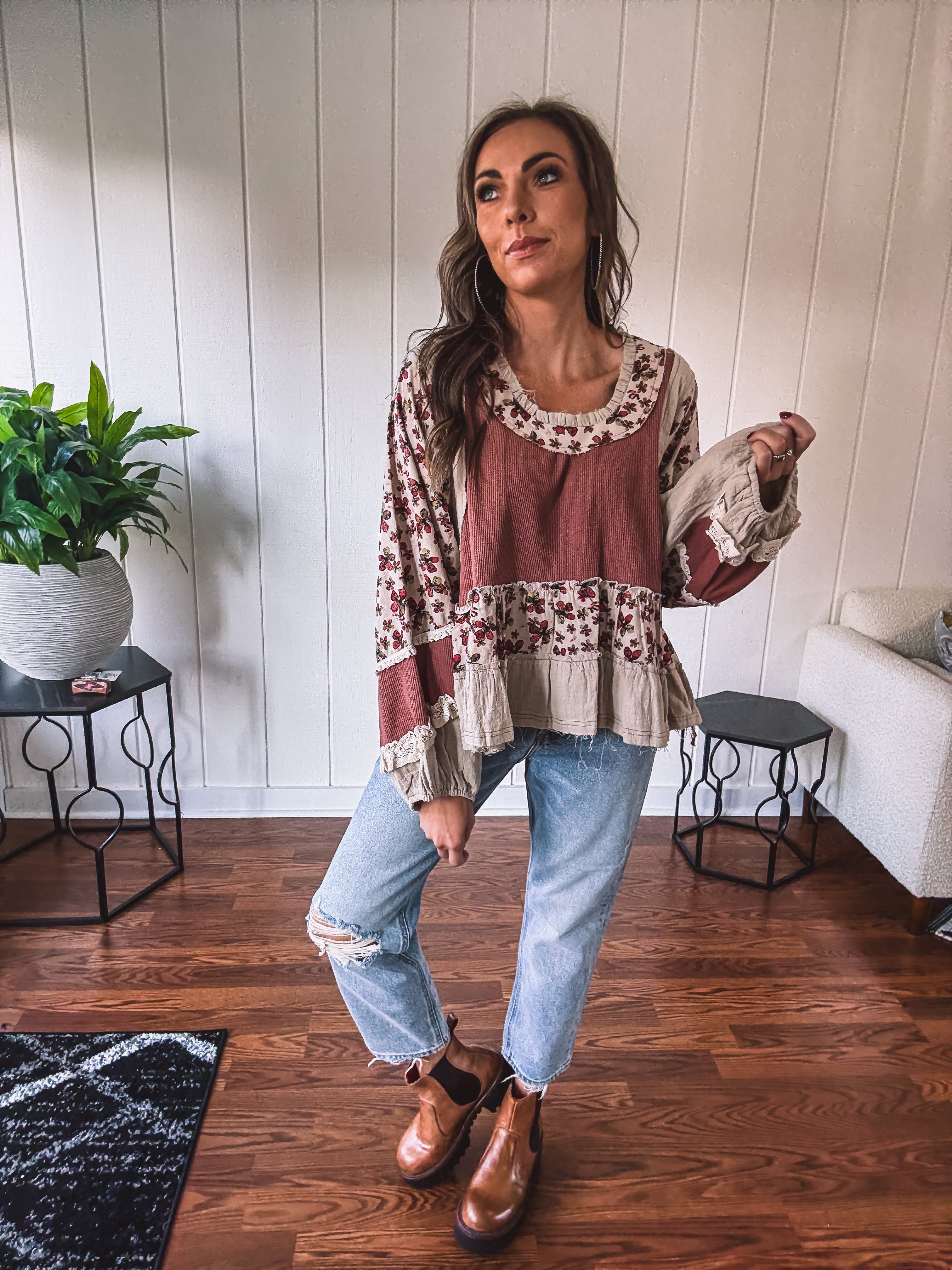This dreamy dusty rose thermal pairs perfectly with soft taupe gauze and an enchanting floral print for a look that's totally boho-chic. Delicate lace trim, a playful ruffled hem, and stretchy cuffs create that effortless, flowy vibe you've been craving. Style it with your go-to jeans or flowing bottoms for an instant boho moment that feels like a warm hug!
