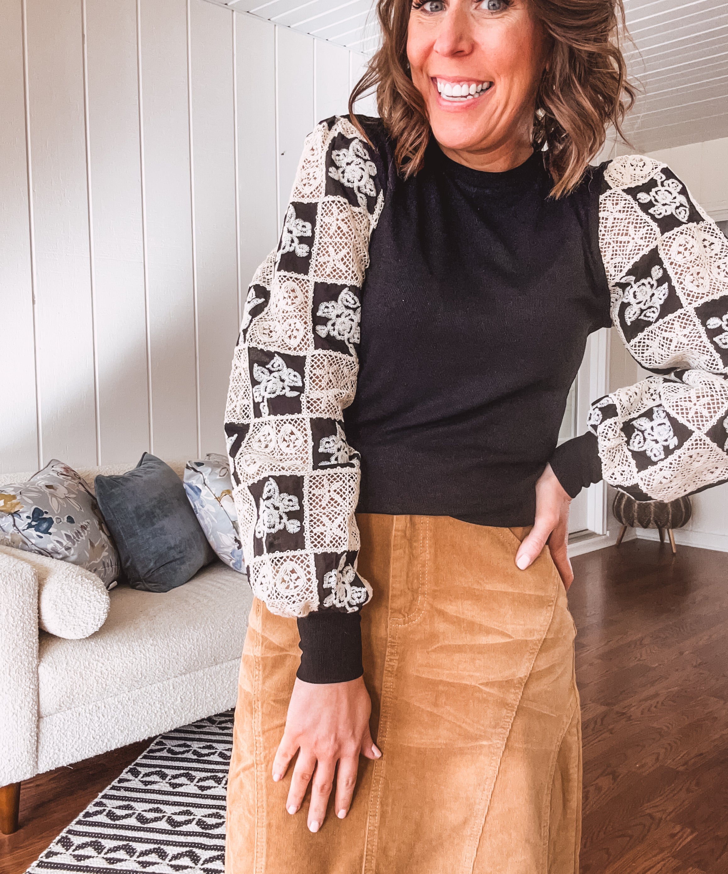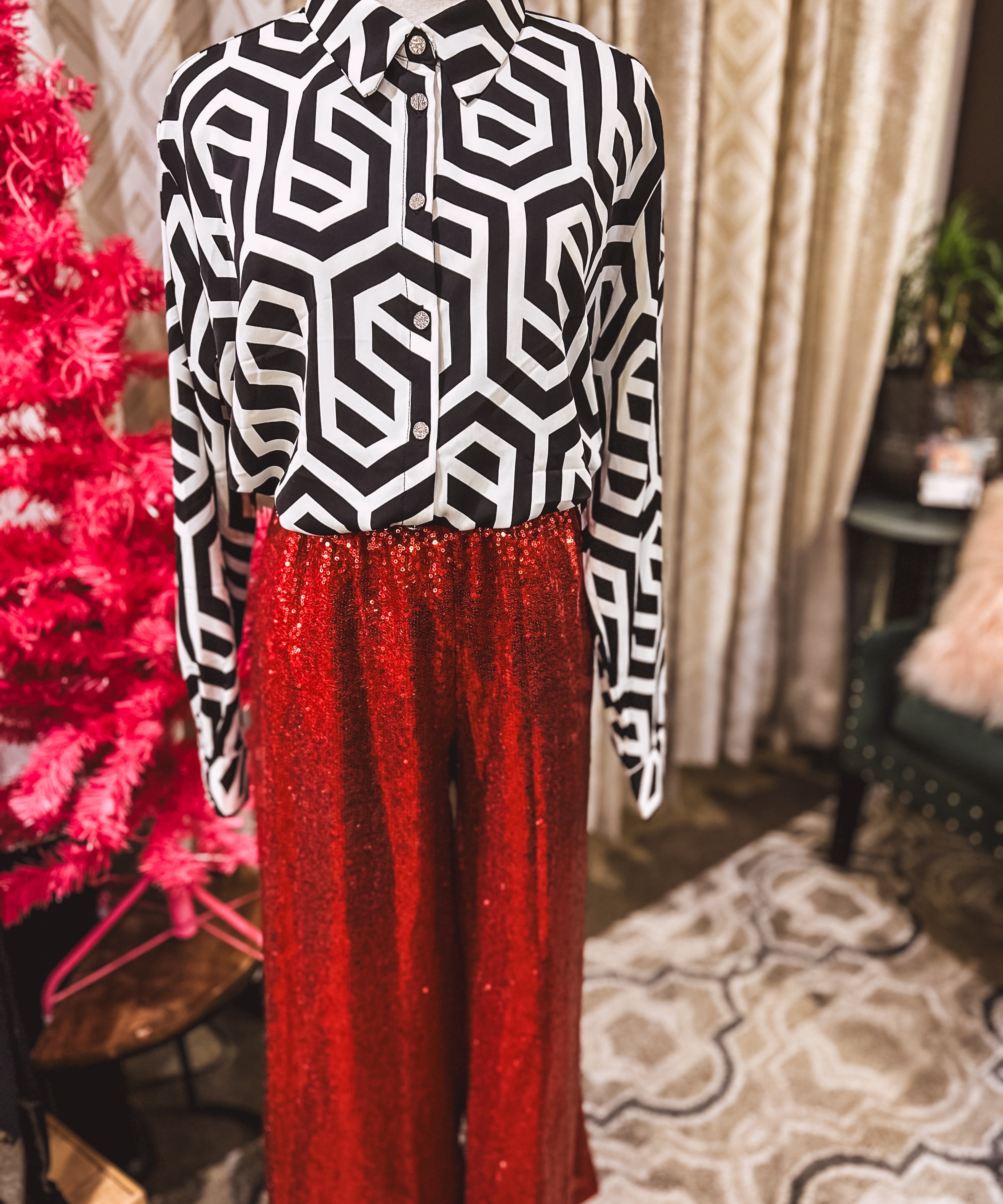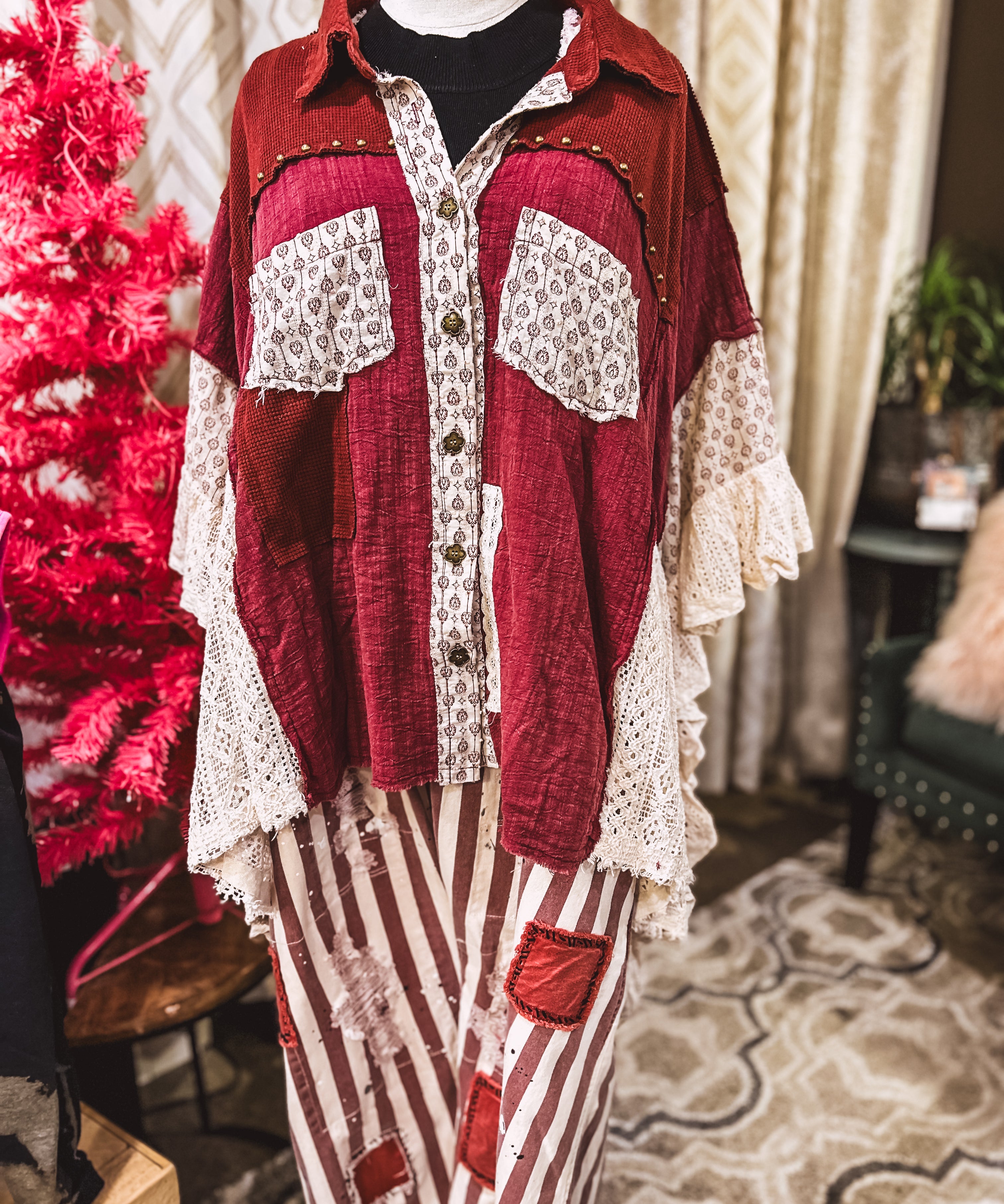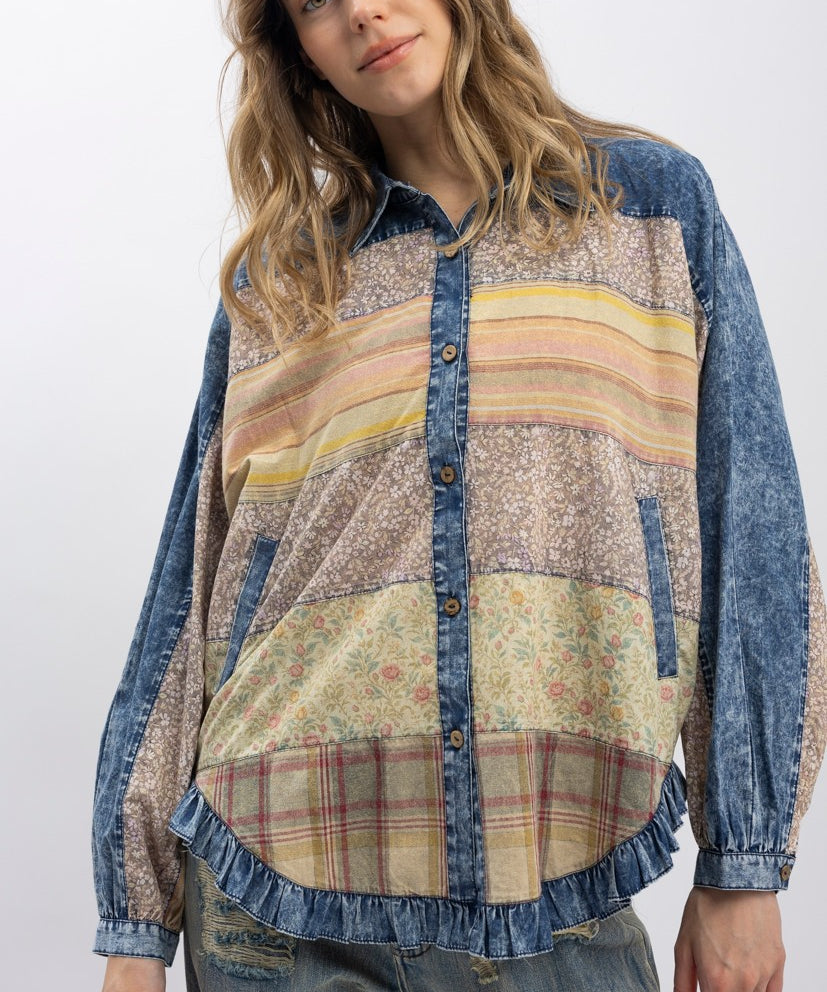 Denim Flutter Trim Mix Fabric Button Up Shirt