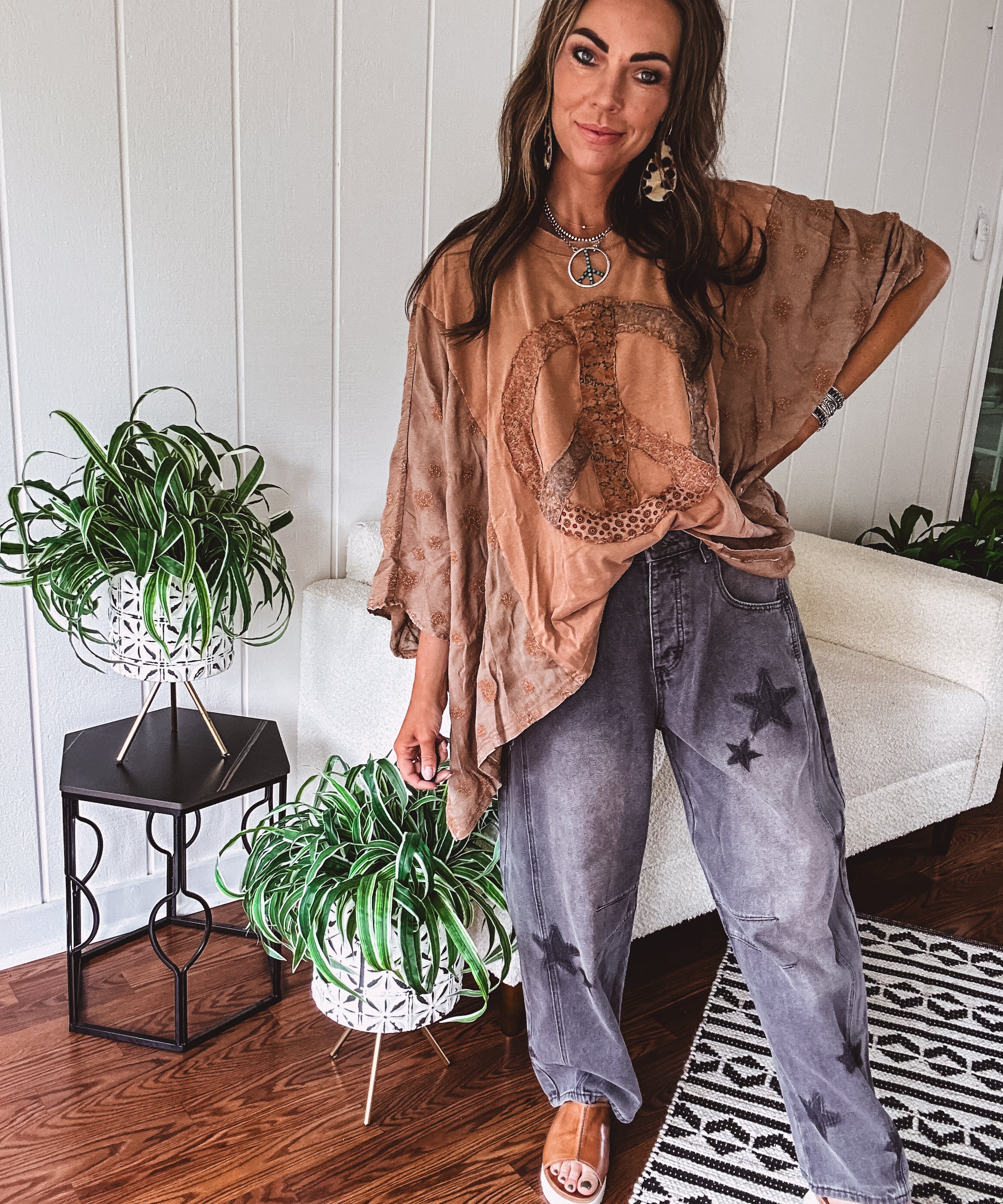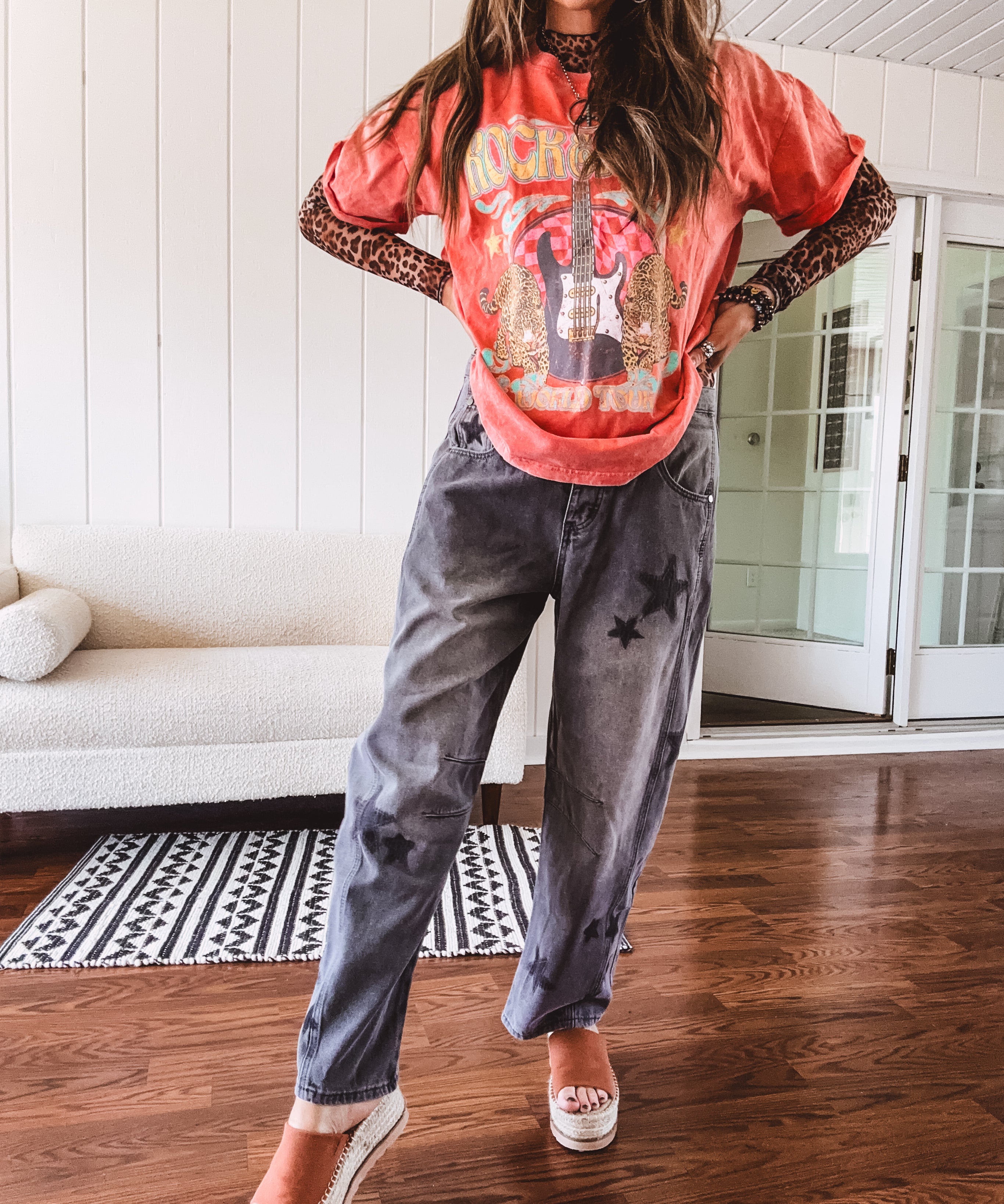 Washed Black Star Print Denim Barrel Pant