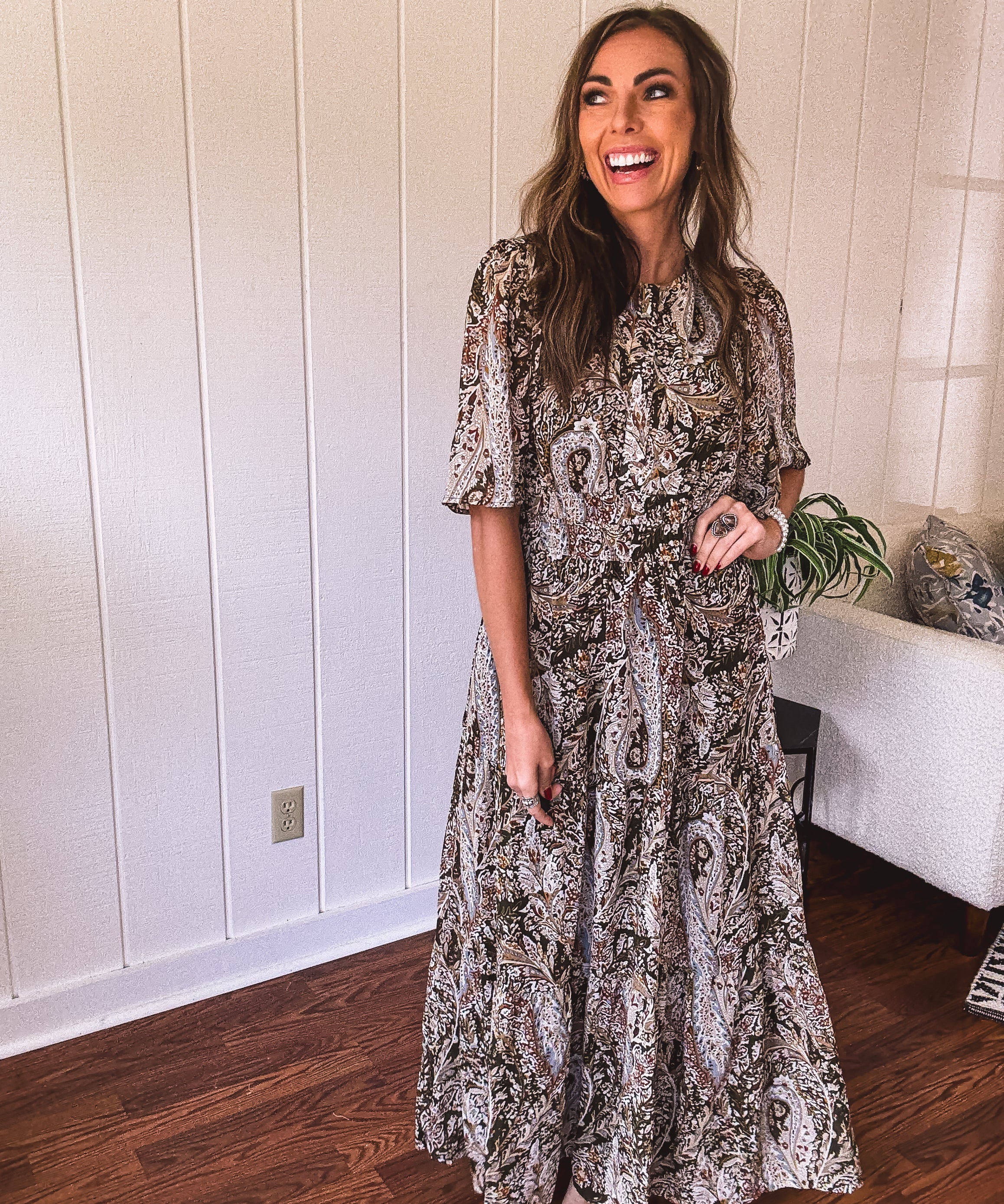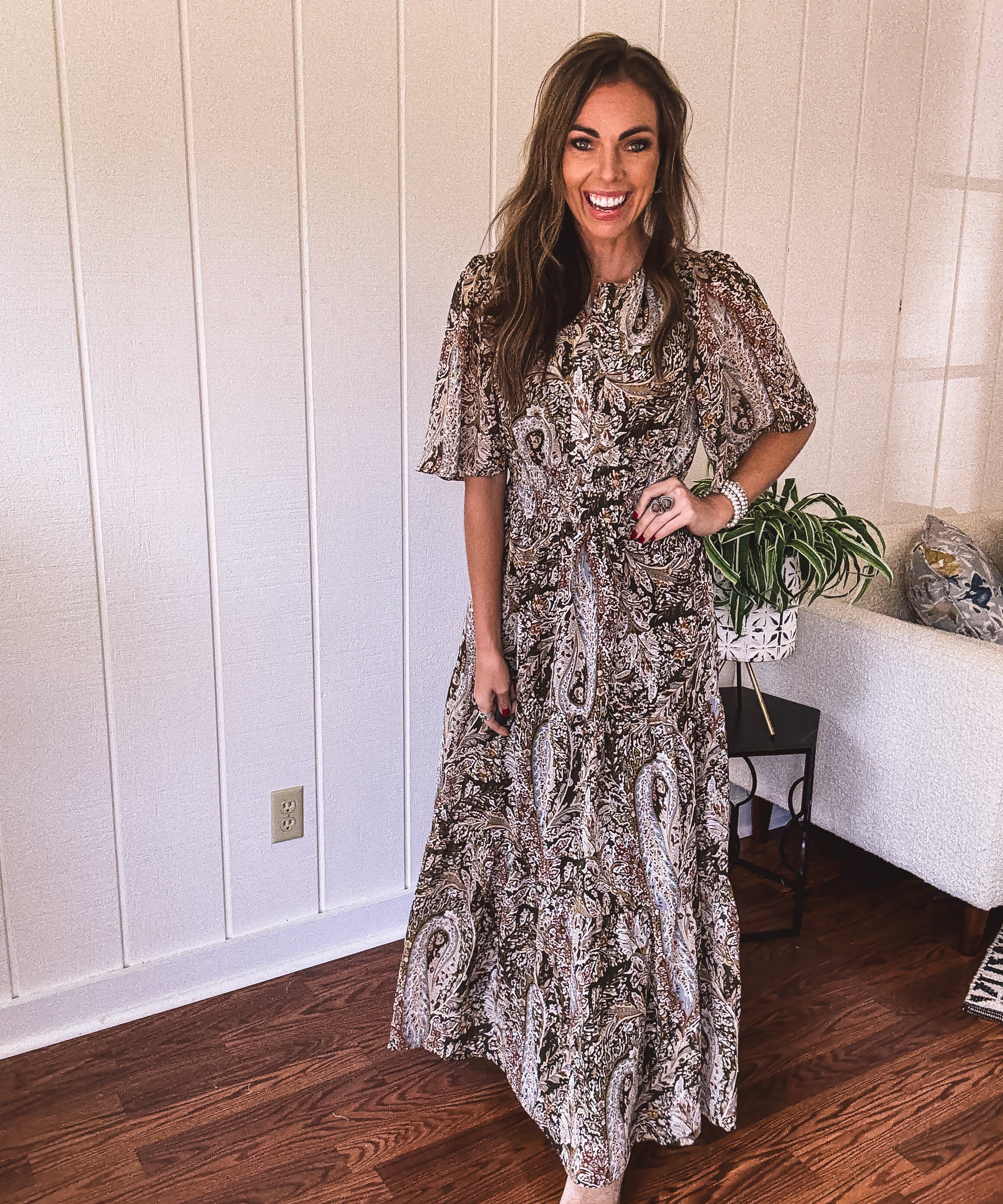 Olive Woven Print Tiered Maxi Dress Flutter Sleeve