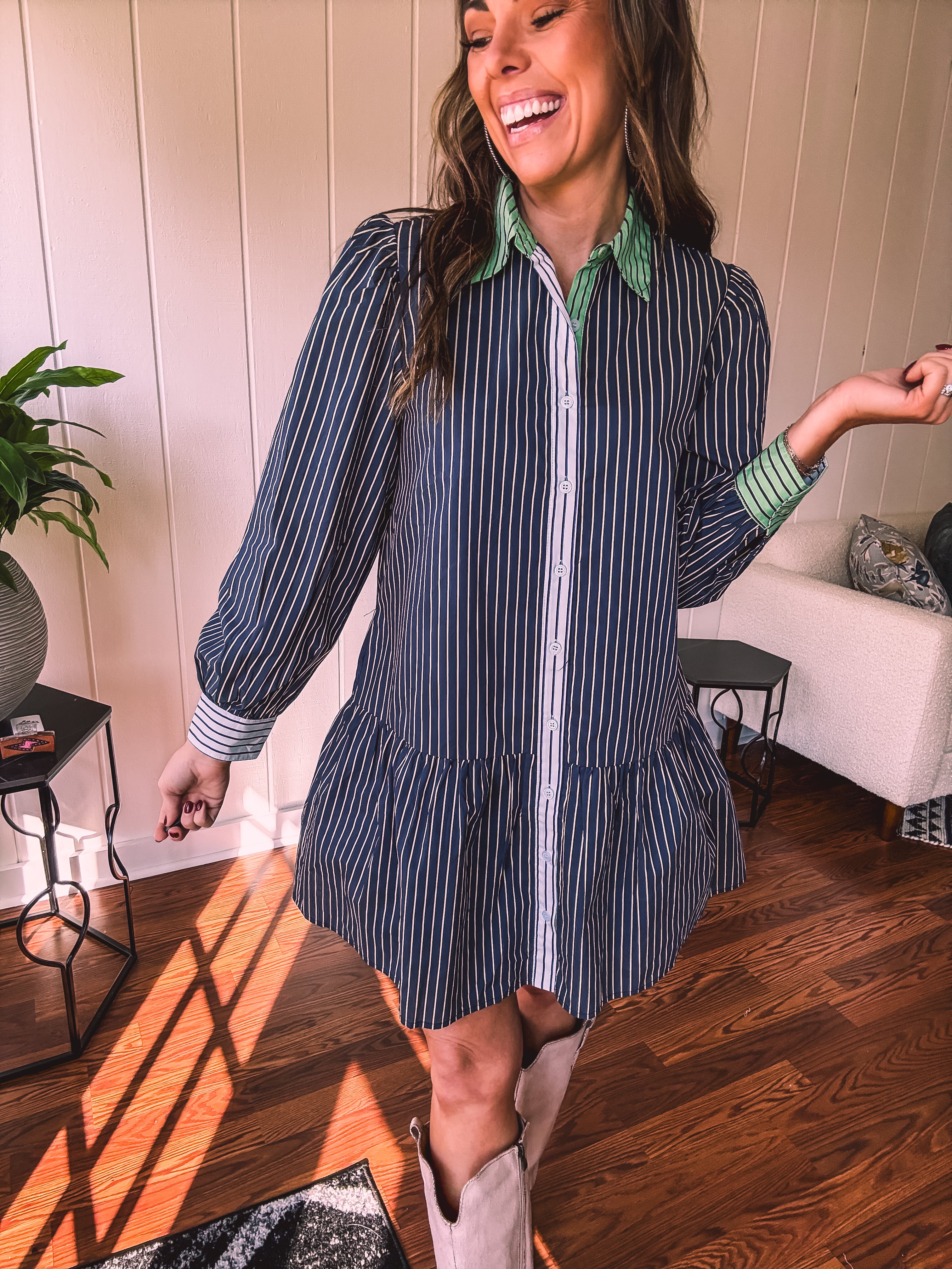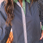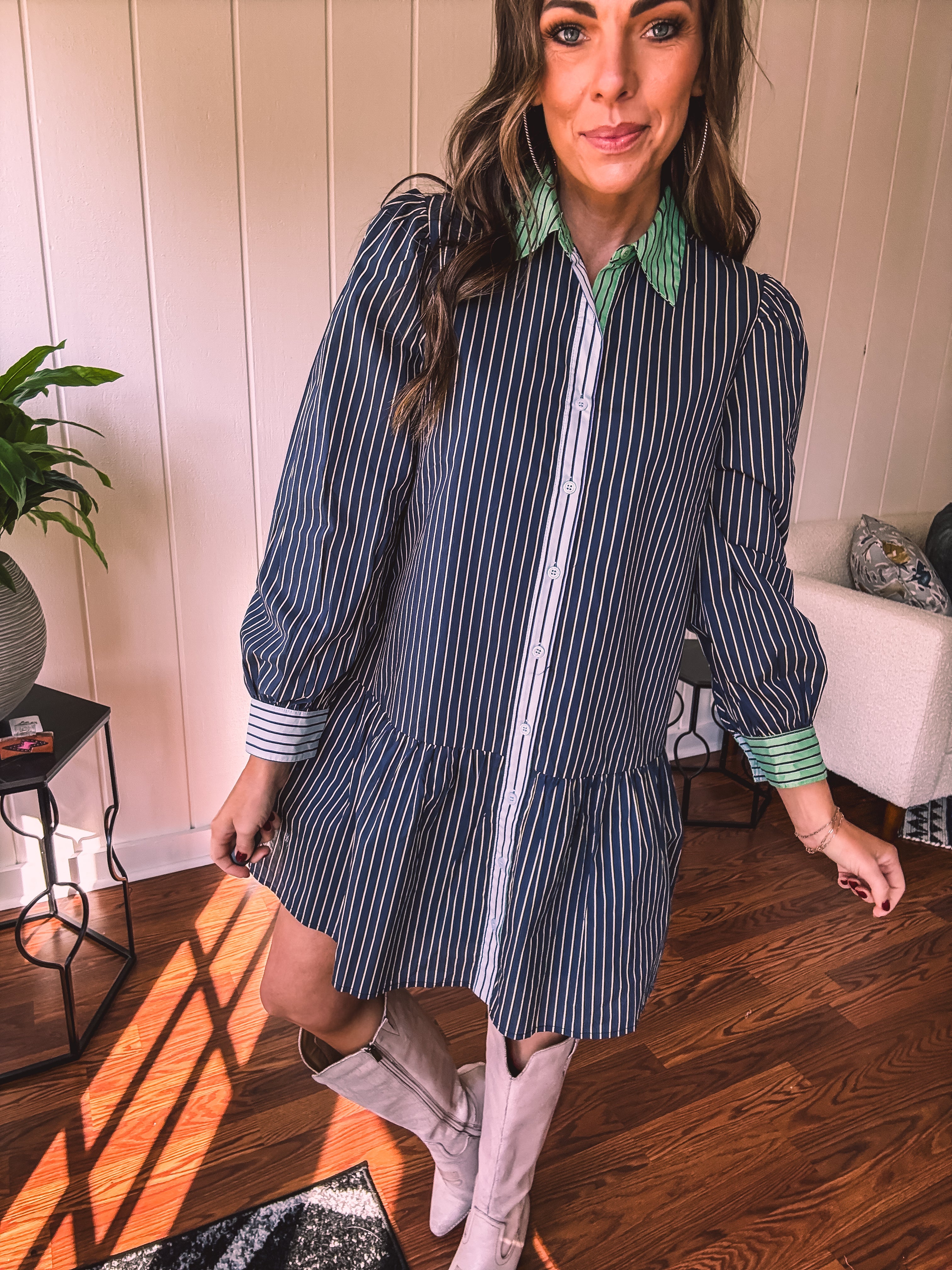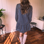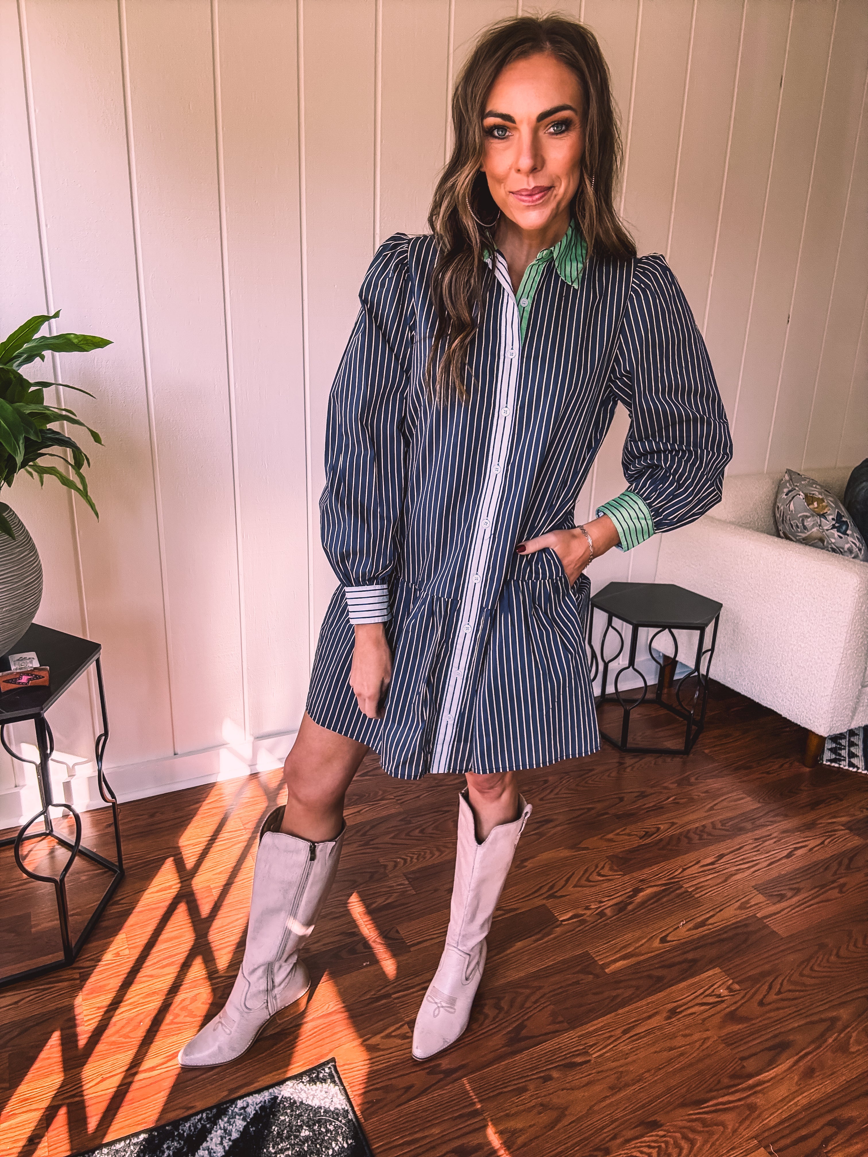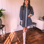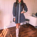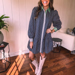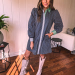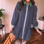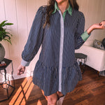 This sophisticated denim dress combines classic pinstripe detailing with contemporary styling. The navy base is elevated by cream and white striping along the button placket, cuffs, and a striking green accent at the neckline. Practical pockets and a flattering drop waist silhouette offer both function and fashion-forward appeal. Fully lined for comfort, this versatile piece transitions seamlessly from season to season—style with booties, tall boots, leggings, or sandals depending on the occasion.