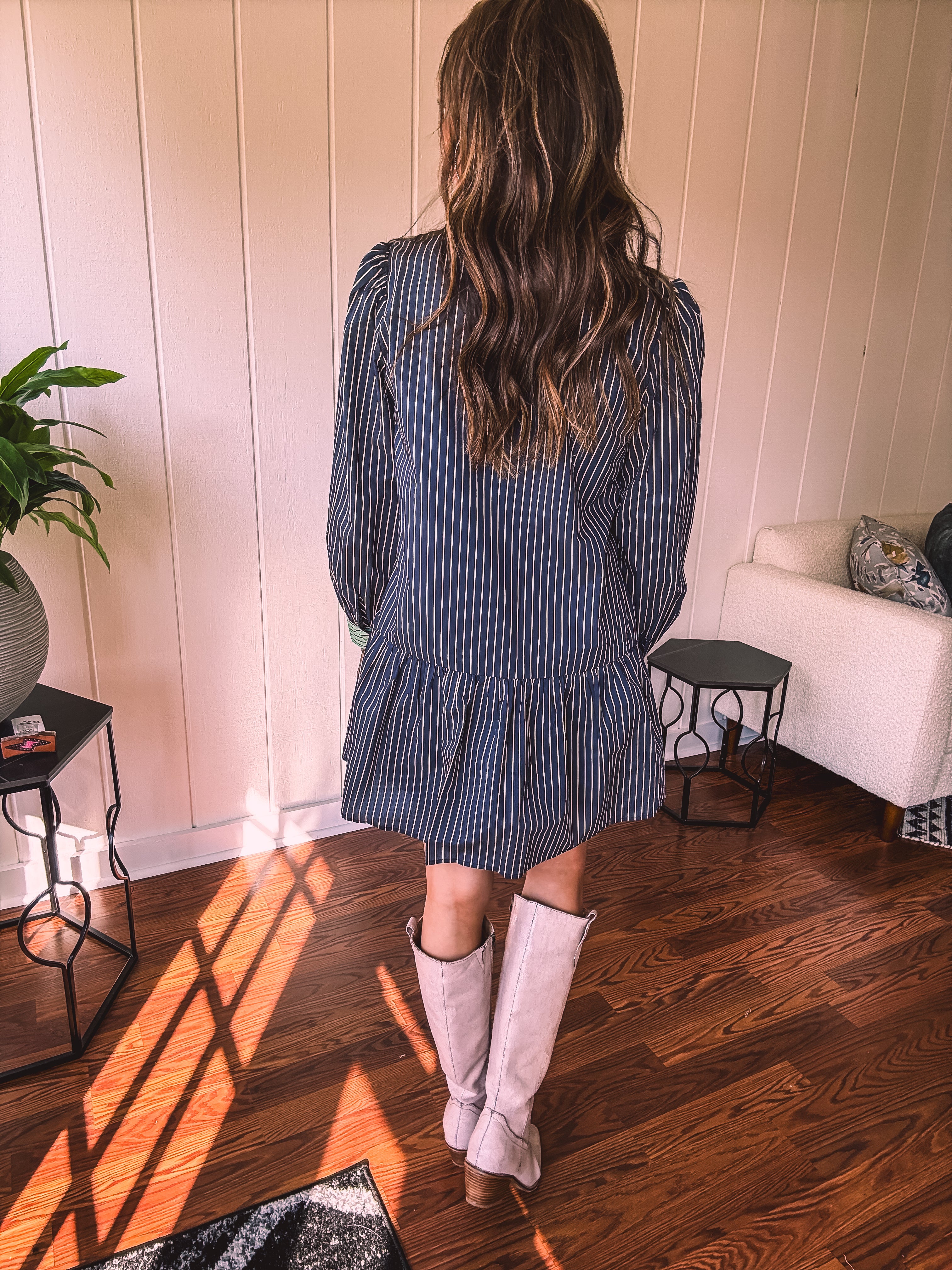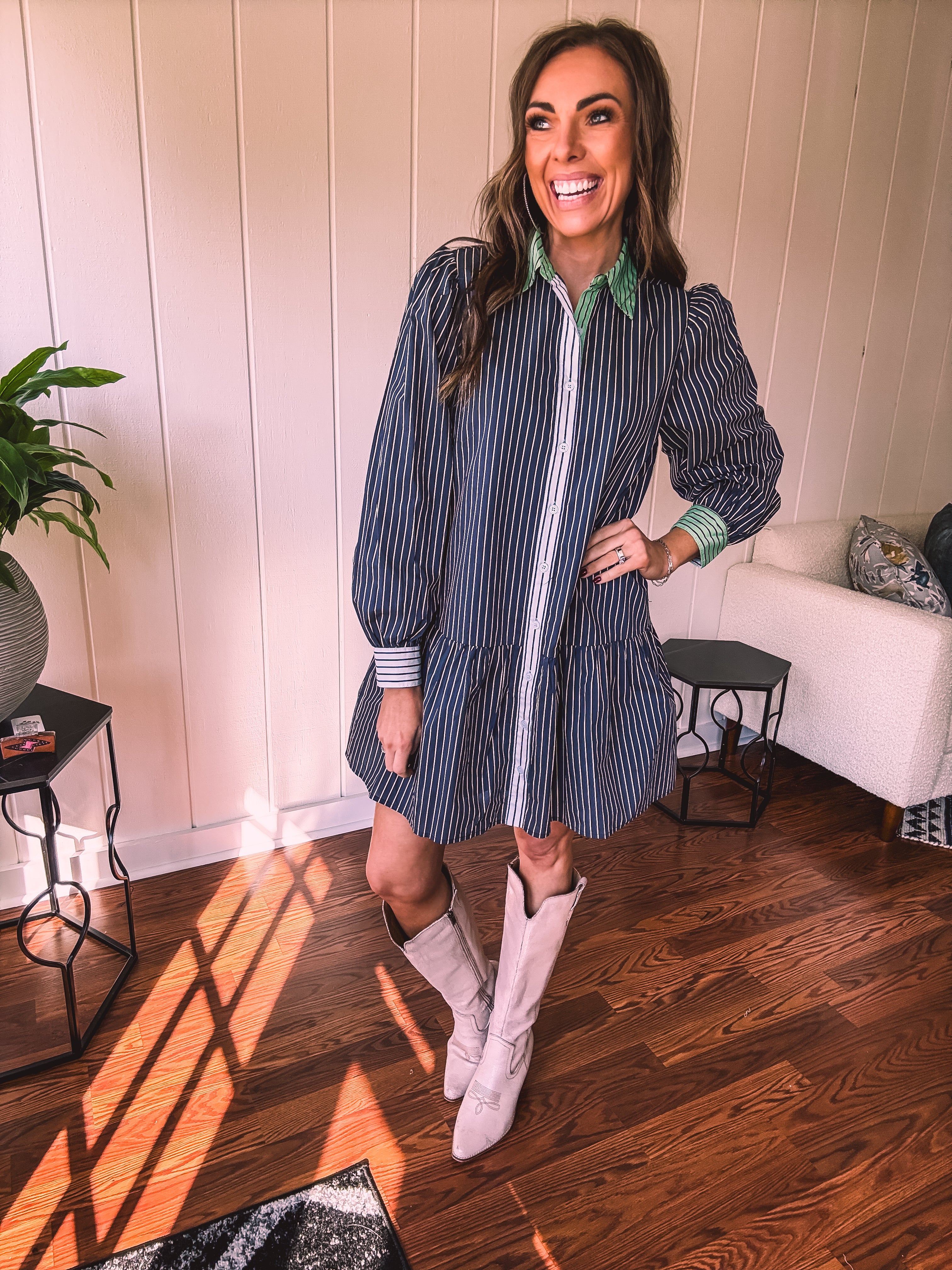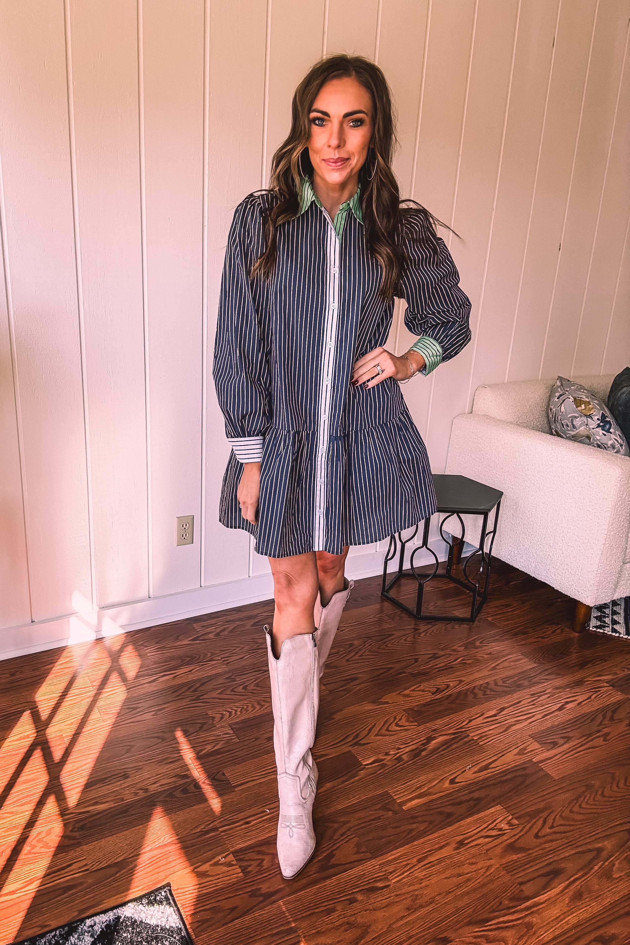 This sophisticated denim dress combines classic pinstripe detailing with contemporary styling. The navy base is elevated by cream and white striping along the button placket, cuffs, and a striking green accent at the neckline. Practical pockets and a flattering drop waist silhouette offer both function and fashion-forward appeal. Fully lined for comfort, this versatile piece transitions seamlessly from season to season—style with booties, tall boots, leggings, or sandals depending on the occasion.