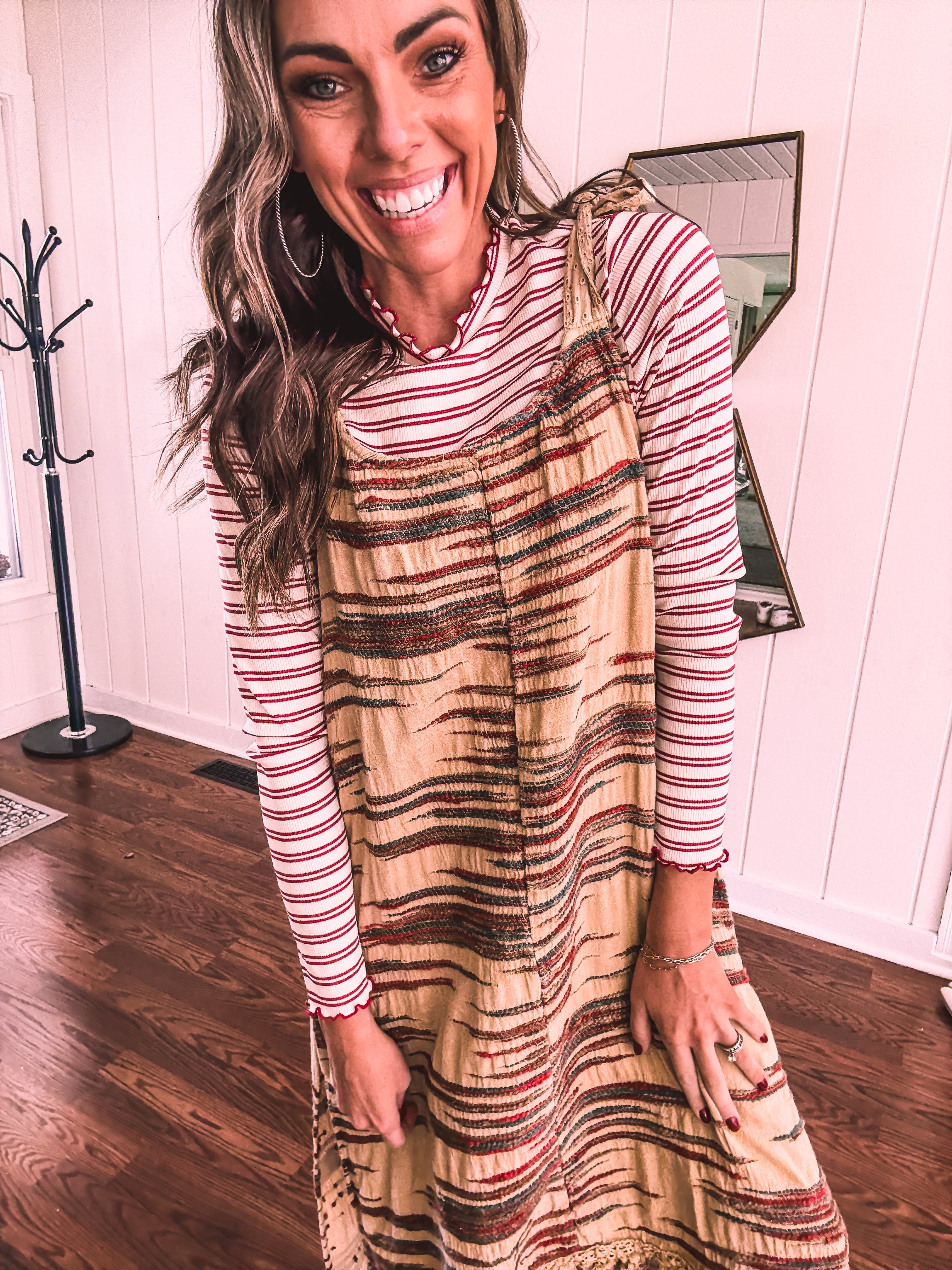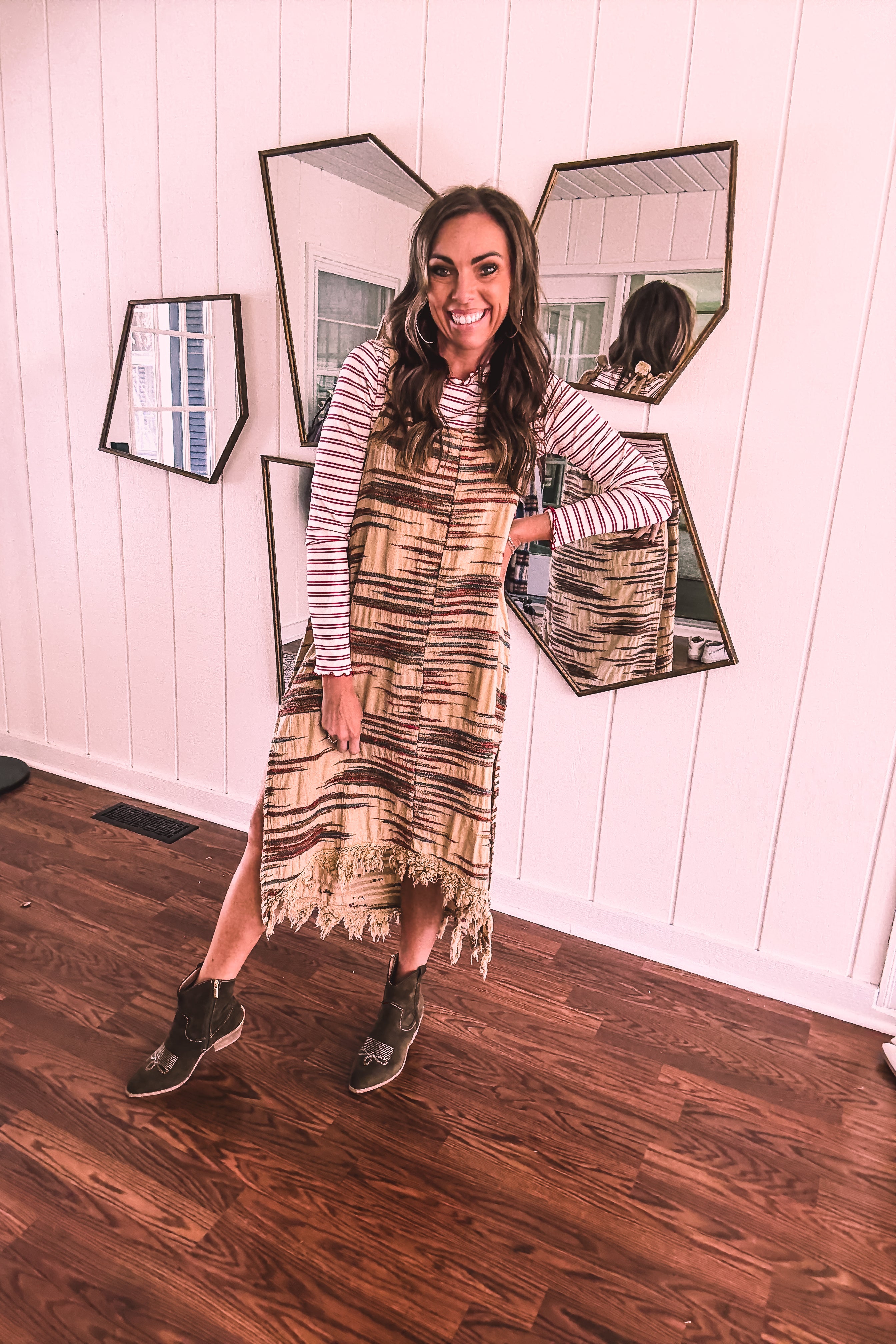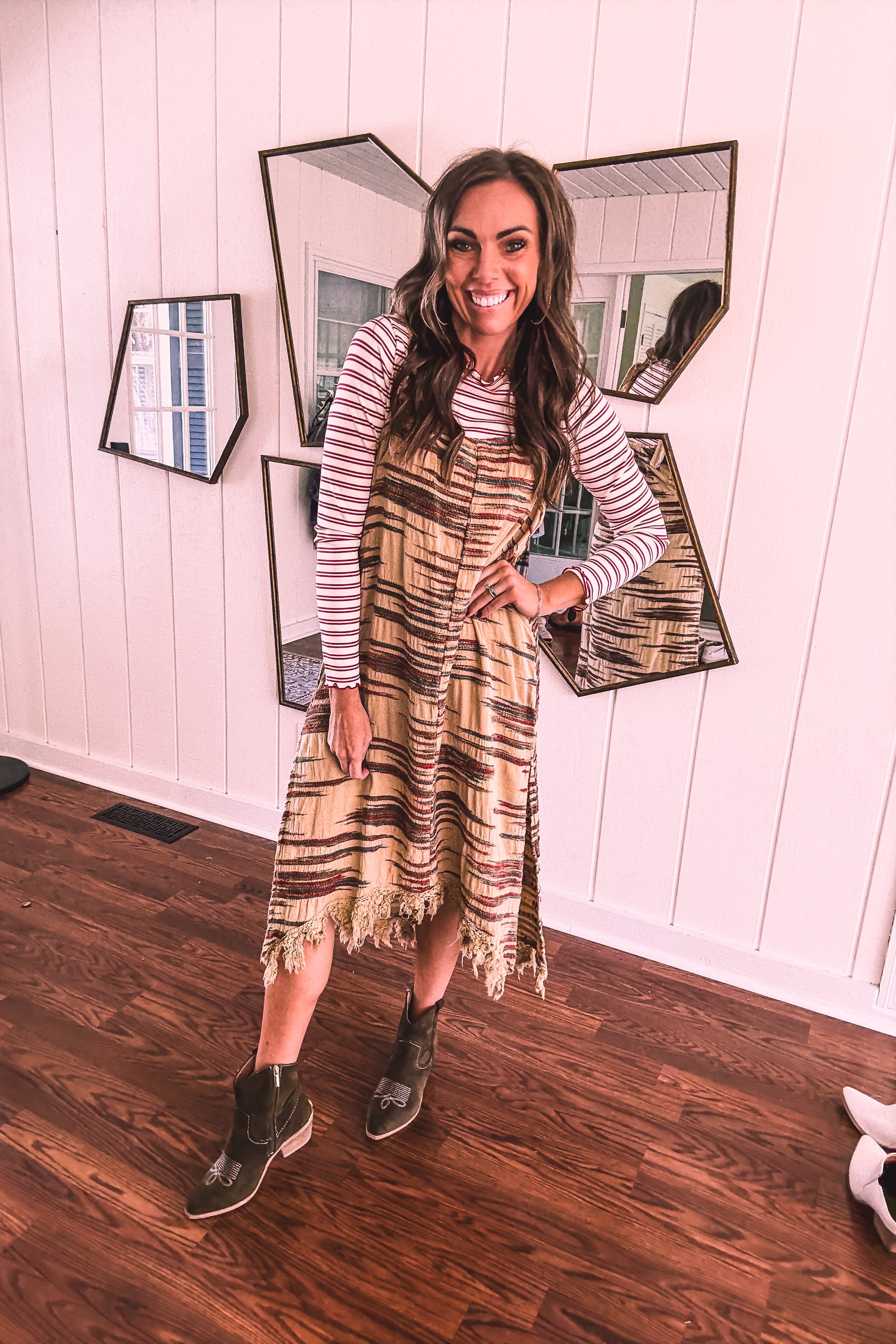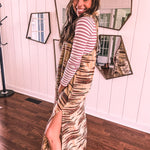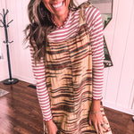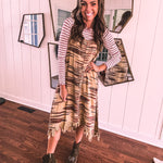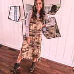 Embrace your free-spirited side in this show-stopping twill dress that's bursting with personality. The warm taupe canvas comes alive with vibrant spice, teal, and brown embroidery that tells its own story, while delicate lace crochet straps and a playful fringe hem add those boho touches you crave. Strategic side slits keep things flirty and fun. Layer it with a long-sleeved mesh top or mock neck for cooler days, throw on your favorite cardigan, slip into some booties, and you're ready to turn heads wherever you go.
