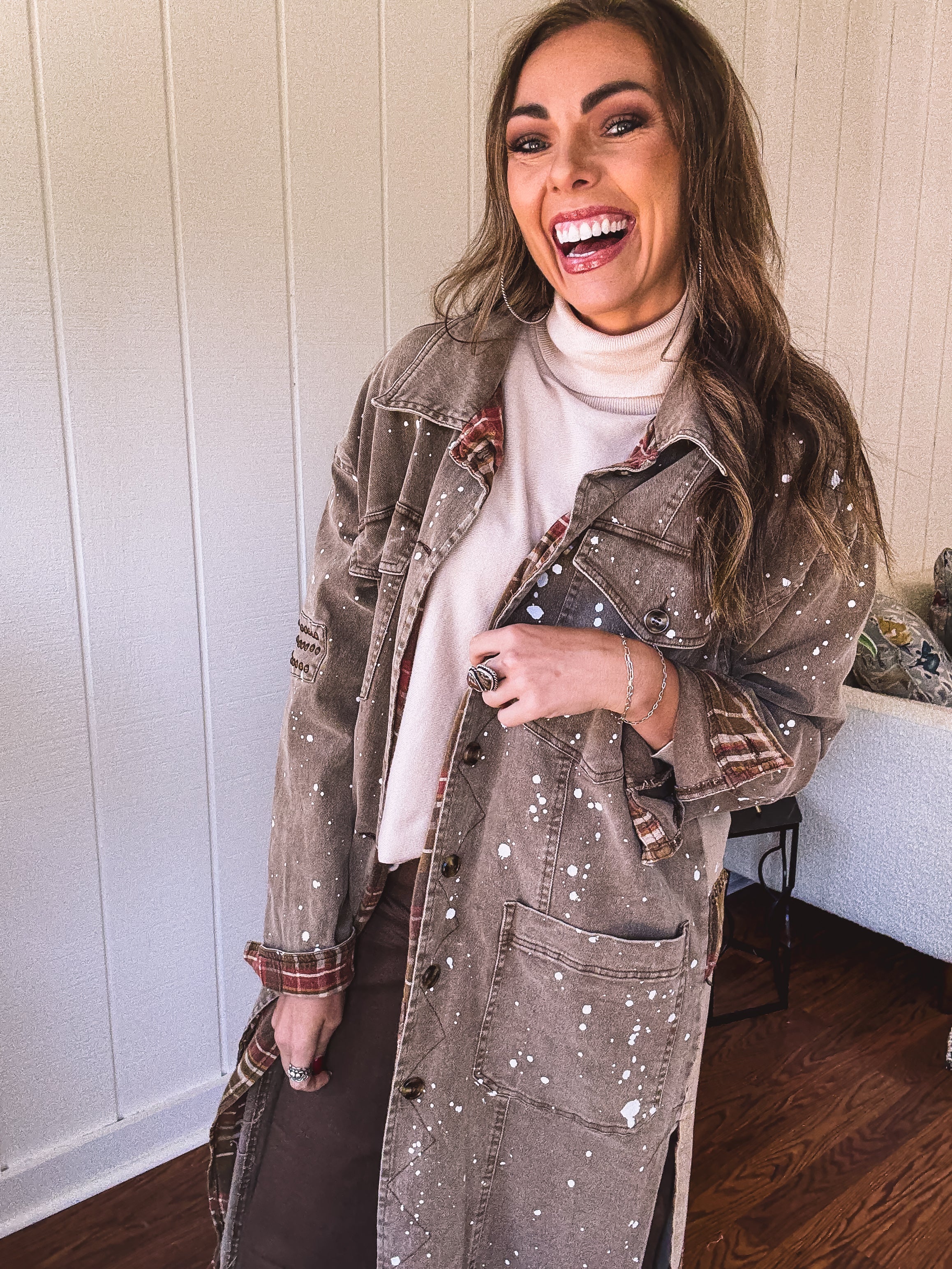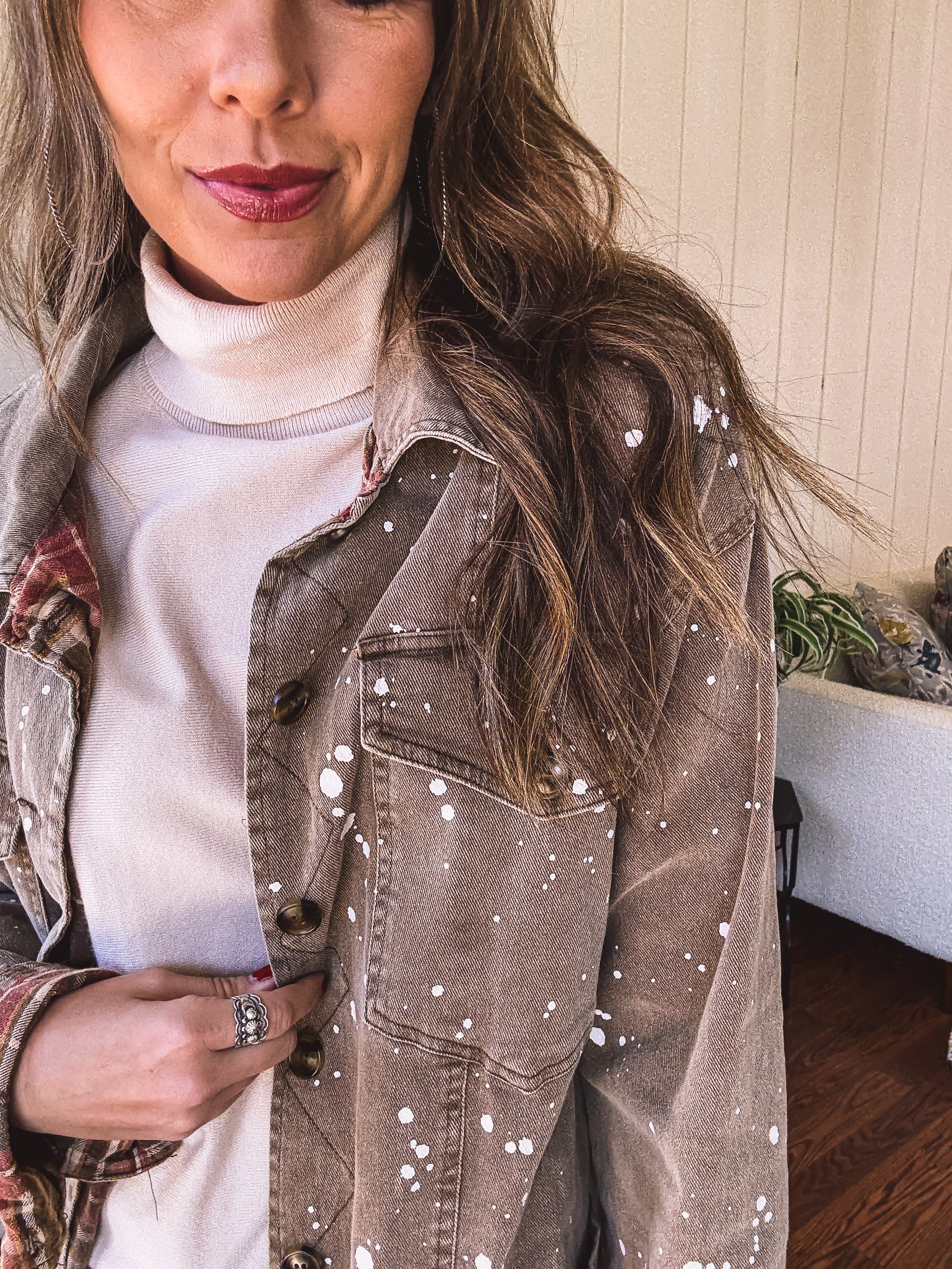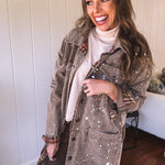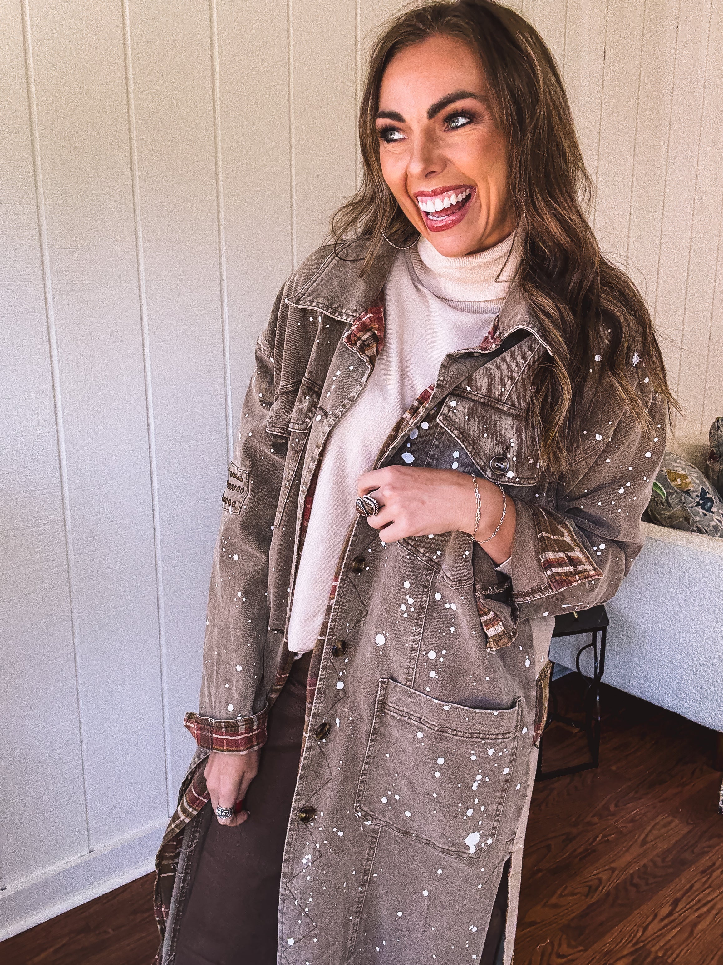 Embrace vintage vibes with this Brown Mineral Wash Paint Splatter Starburst Jacket—perfect for playful layering. Its casual yet bold design effortlessly adds character to any outfit, making your style stand out with a fun, artistic edge.