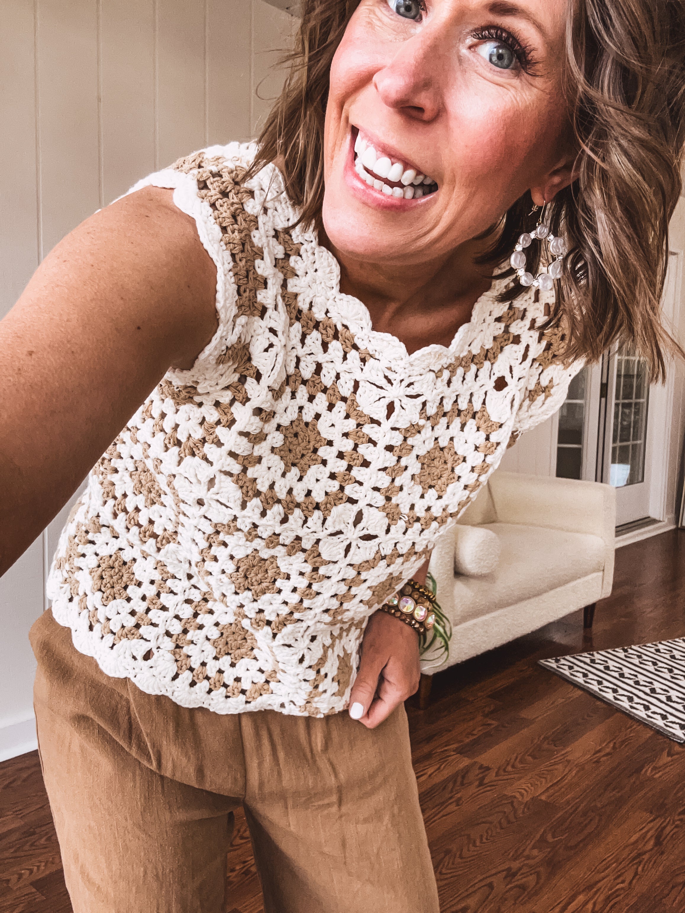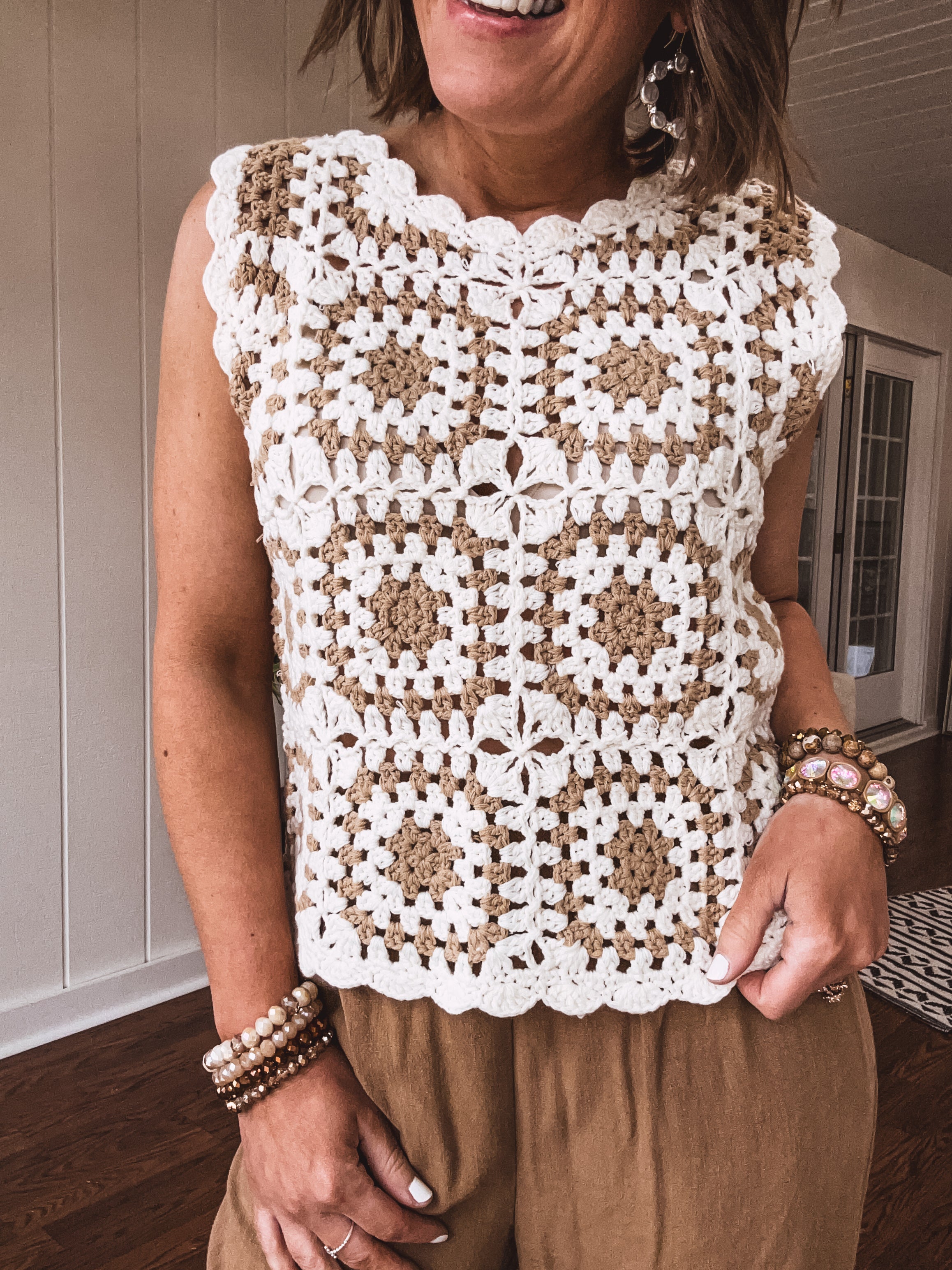 Slay in style with this cream and taupe crochet sweater tank that effortlessly combines the classic and boho vibes! The cute peek-a-boo design adds a touch of playfulness to this versatile top - perfect for pairing with linen pants, denim jeans, or shorts. It's a must-have for any 'fit and any figure!