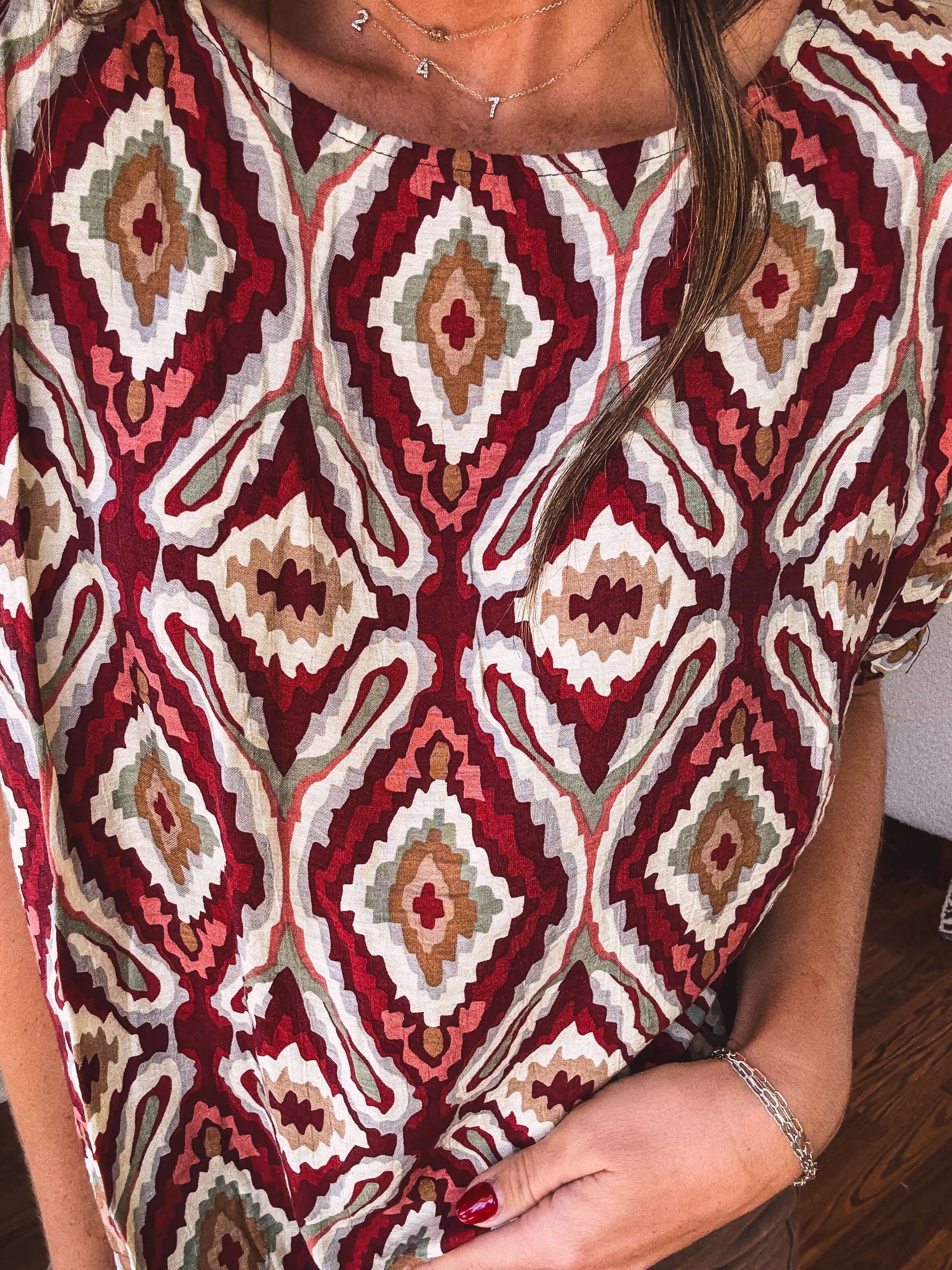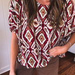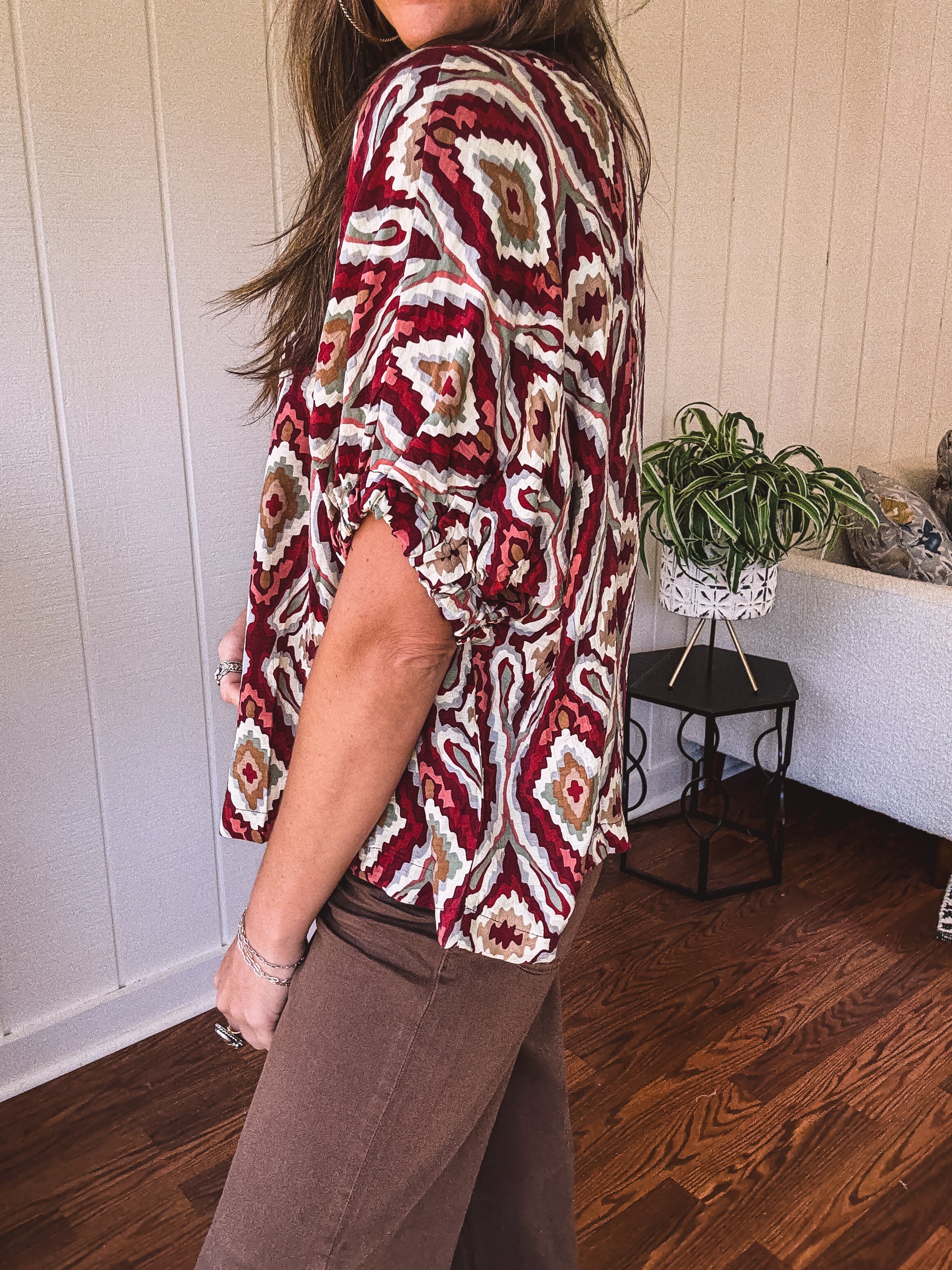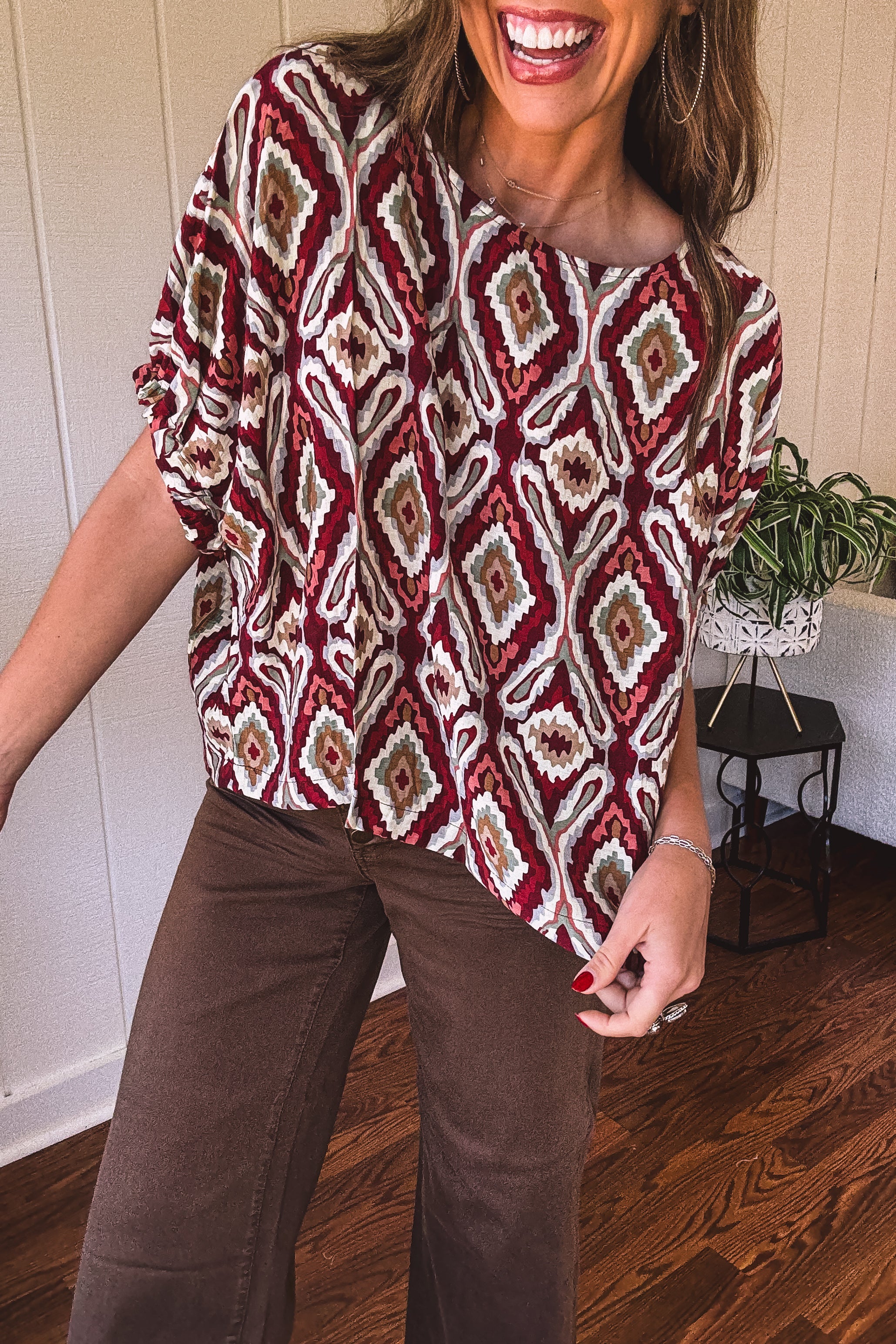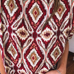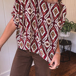 Make a statement with the Crimson Ikat Blouse, boasting a vibrant deep red colorway blended with sage and ivory in a timeless Ikat pattern. Its light, breezy fabric combined with a boxy dolman shape and elastic sleeves create a one-of-a-kind style. Pair it with your go-to jeans or dress pants for a pop of personality, or throw on a cardigan or denim jacket to mix things up.