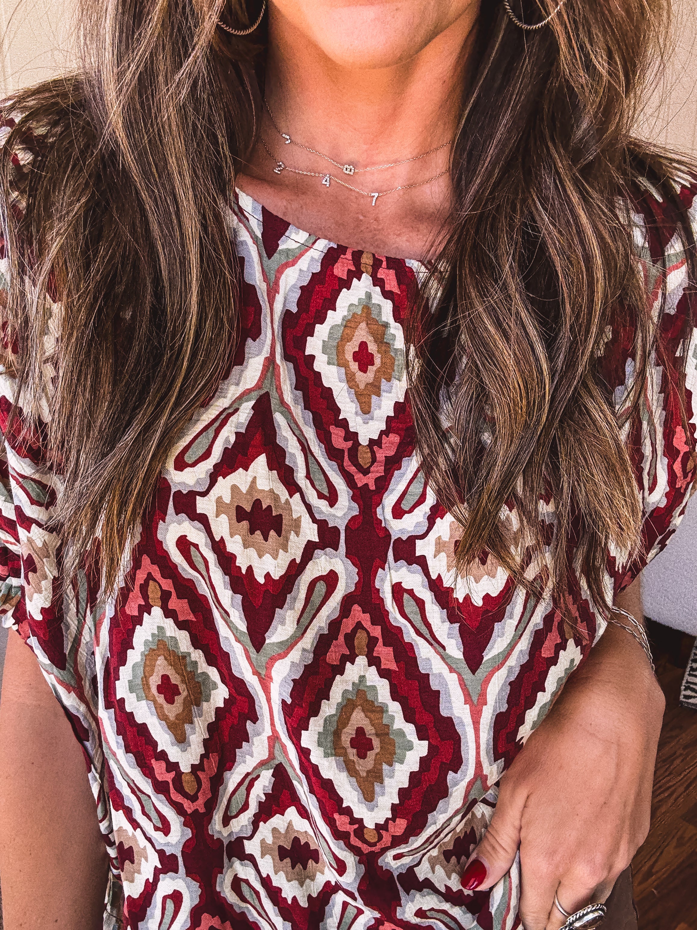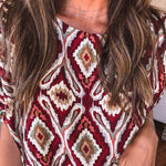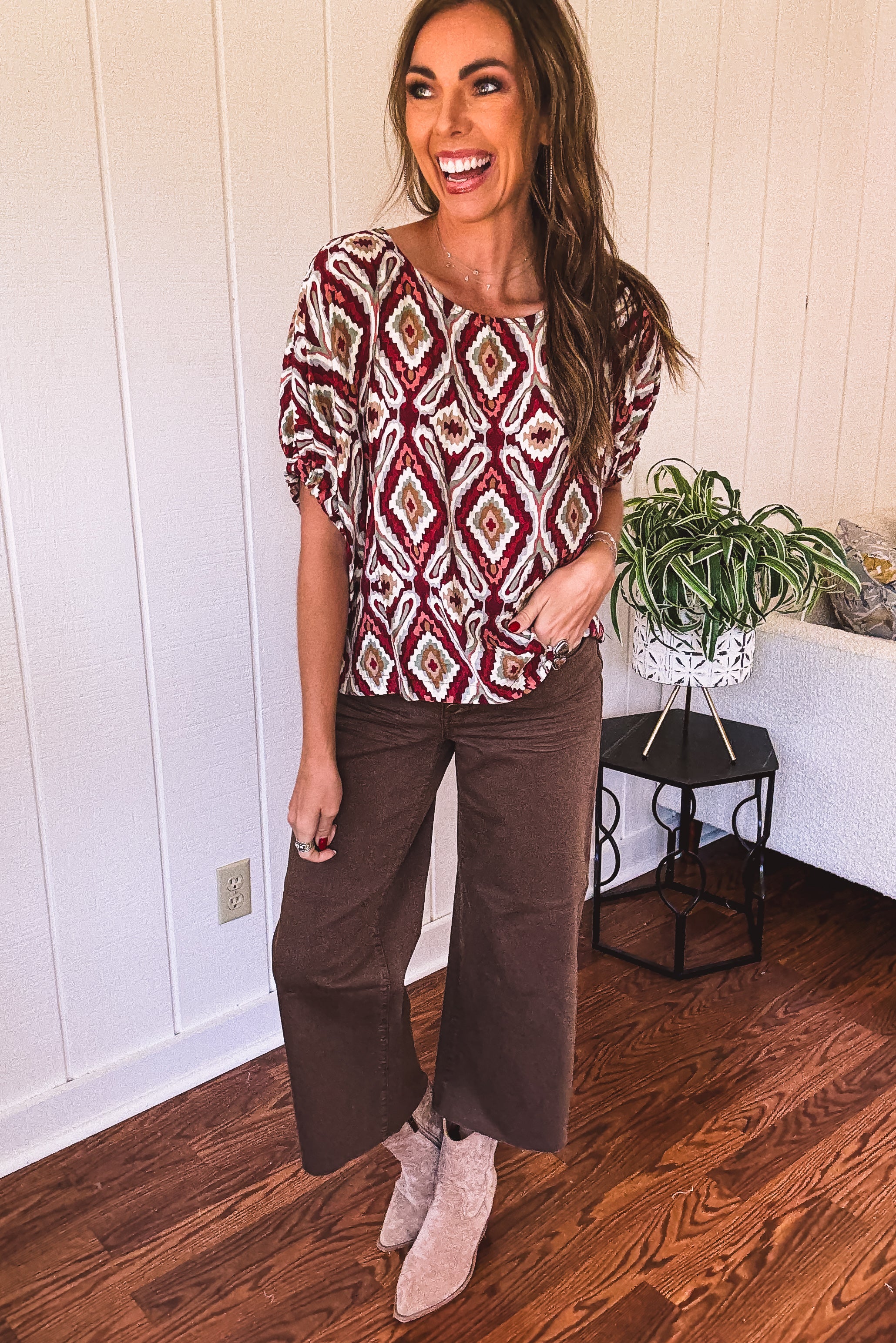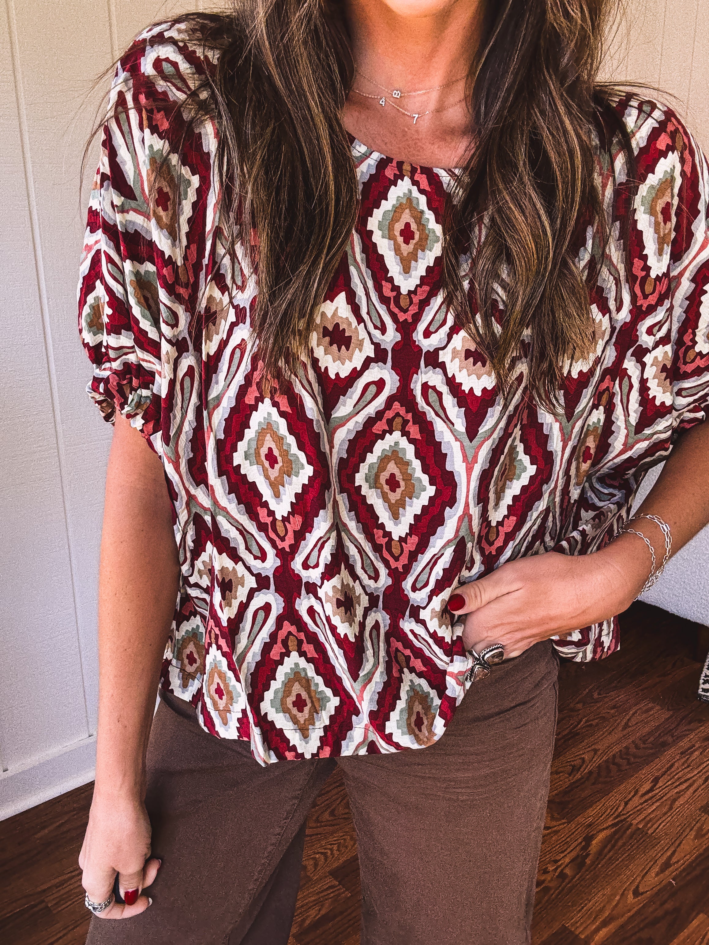 Make a statement with the Crimson Ikat Blouse, boasting a vibrant deep red colorway blended with sage and ivory in a timeless Ikat pattern. Its light, breezy fabric combined with a boxy dolman shape and elastic sleeves create a one-of-a-kind style. Pair it with your go-to jeans or dress pants for a pop of personality, or throw on a cardigan or denim jacket to mix things up.
