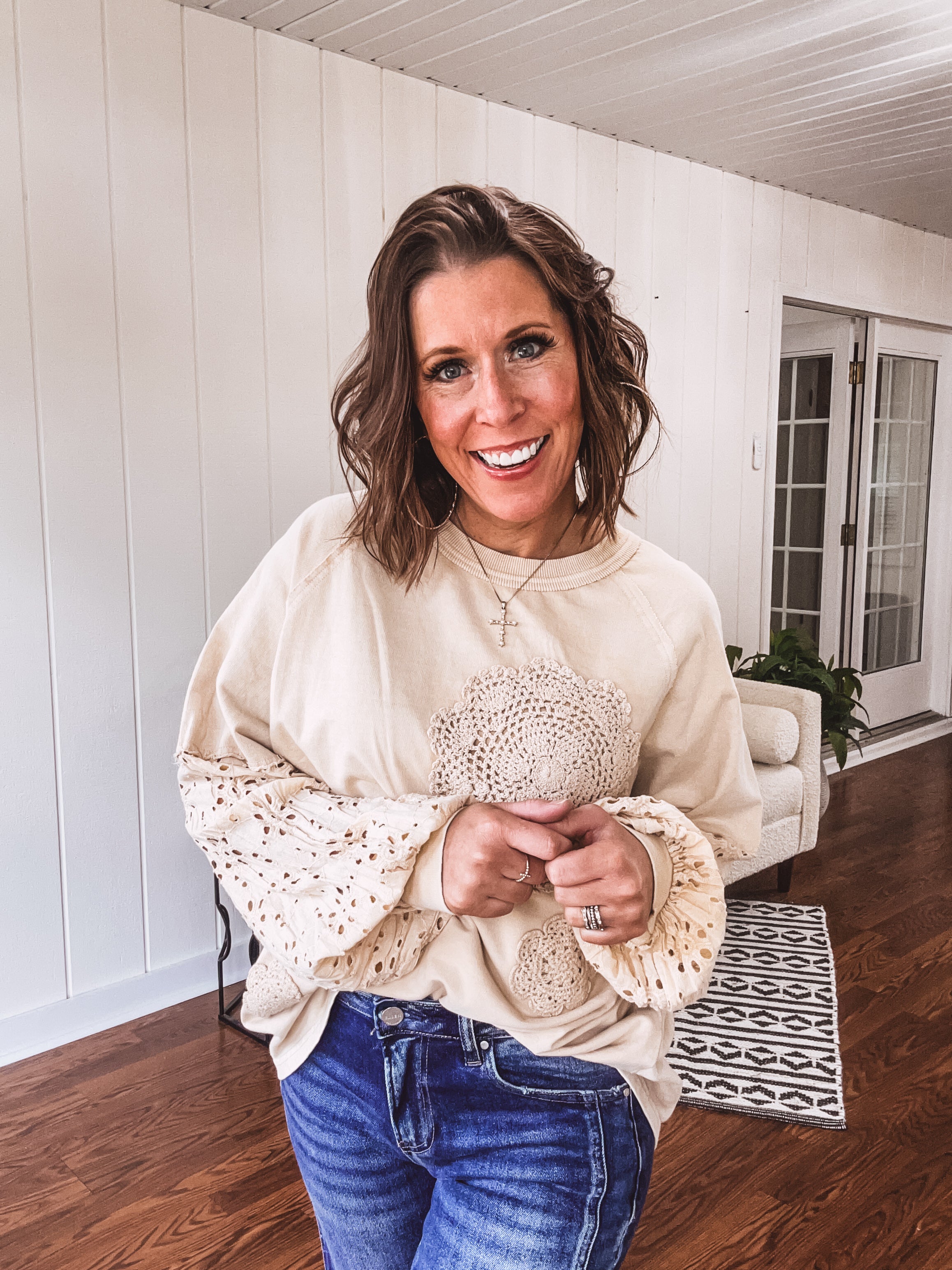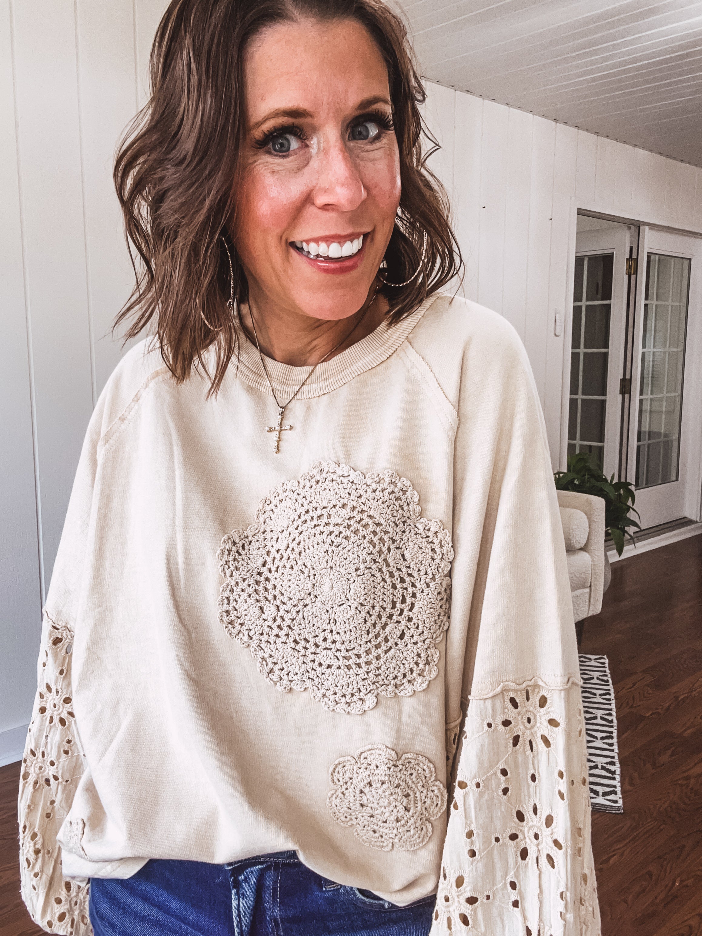 Sink into the yummy ecru shade blended with super-soft cotton in this Eyelet Lace Contrast Sleeve Pullover. Featuring charming lace eyelet sleeves and playful patchwork, it’s a boho-chic top that pairs perfectly with your favorite denim for a comfy, stylish vibe.