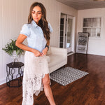 This skirt is a total showstopper! Crafted from 100% Cotton, it offers a soft and airy feel, and is lined to the mid-thigh slit. The paisley crochet design in a dreamy ivory shade, complete with scalloped edges, adds a touch of boho charm. Perfect for the beach, date night, or a day out with your girlfriends!