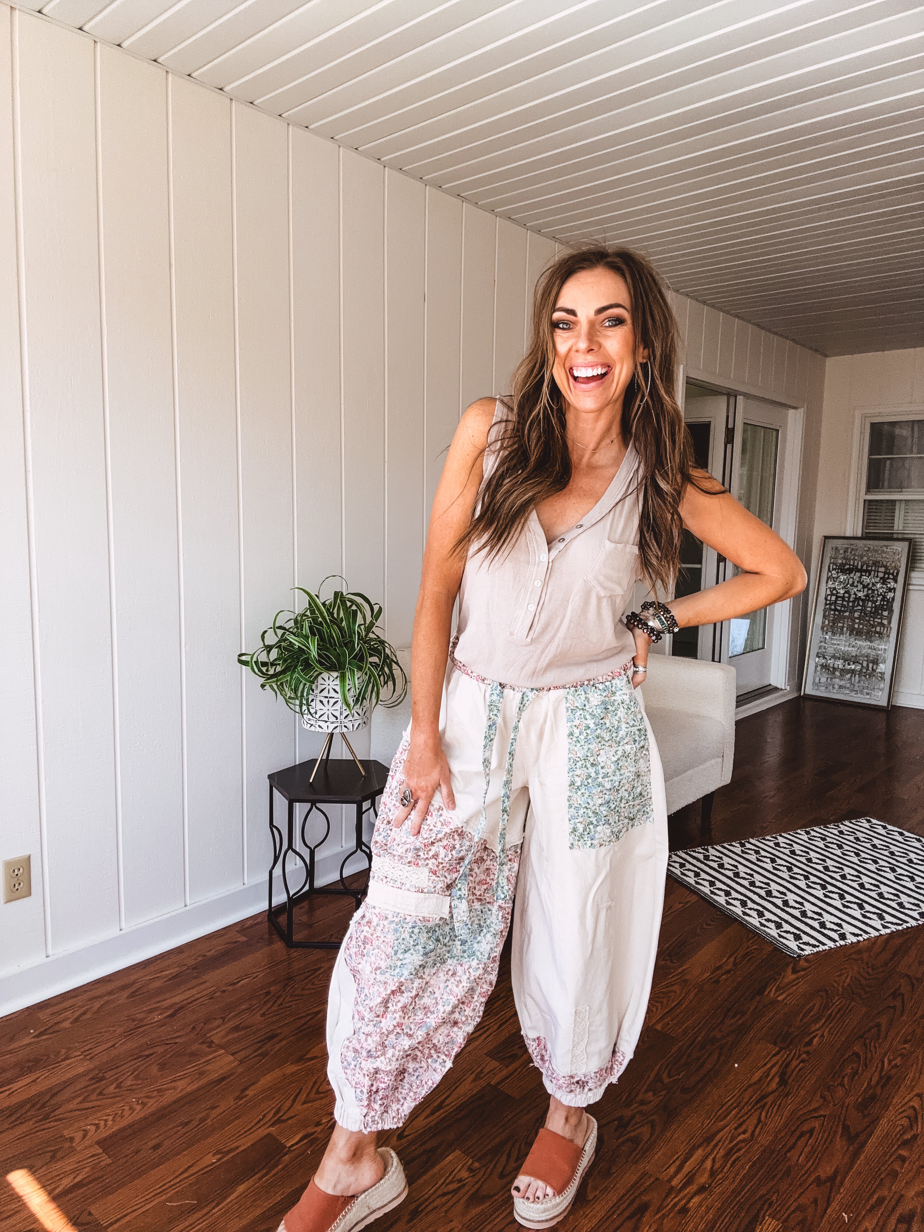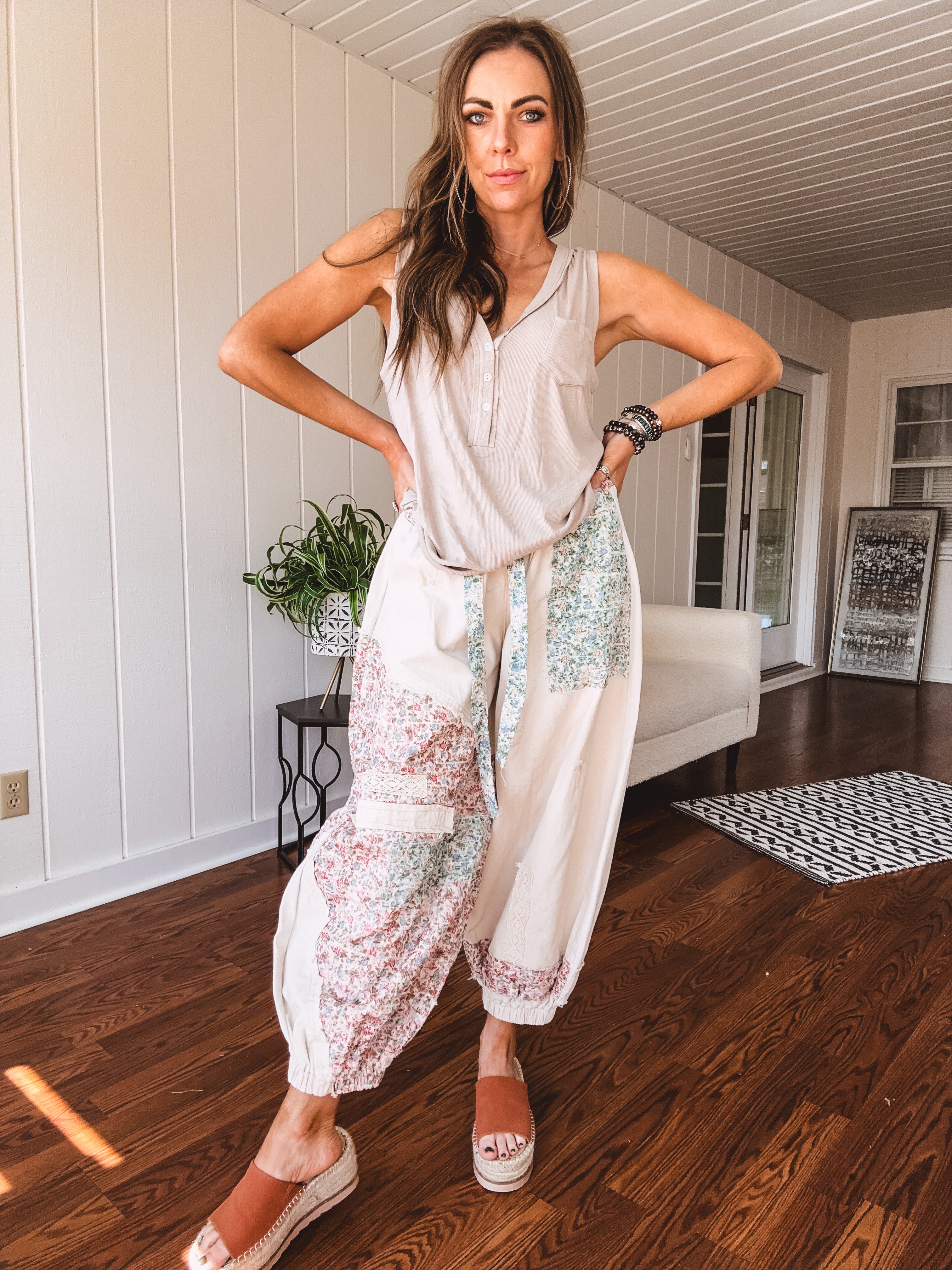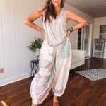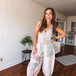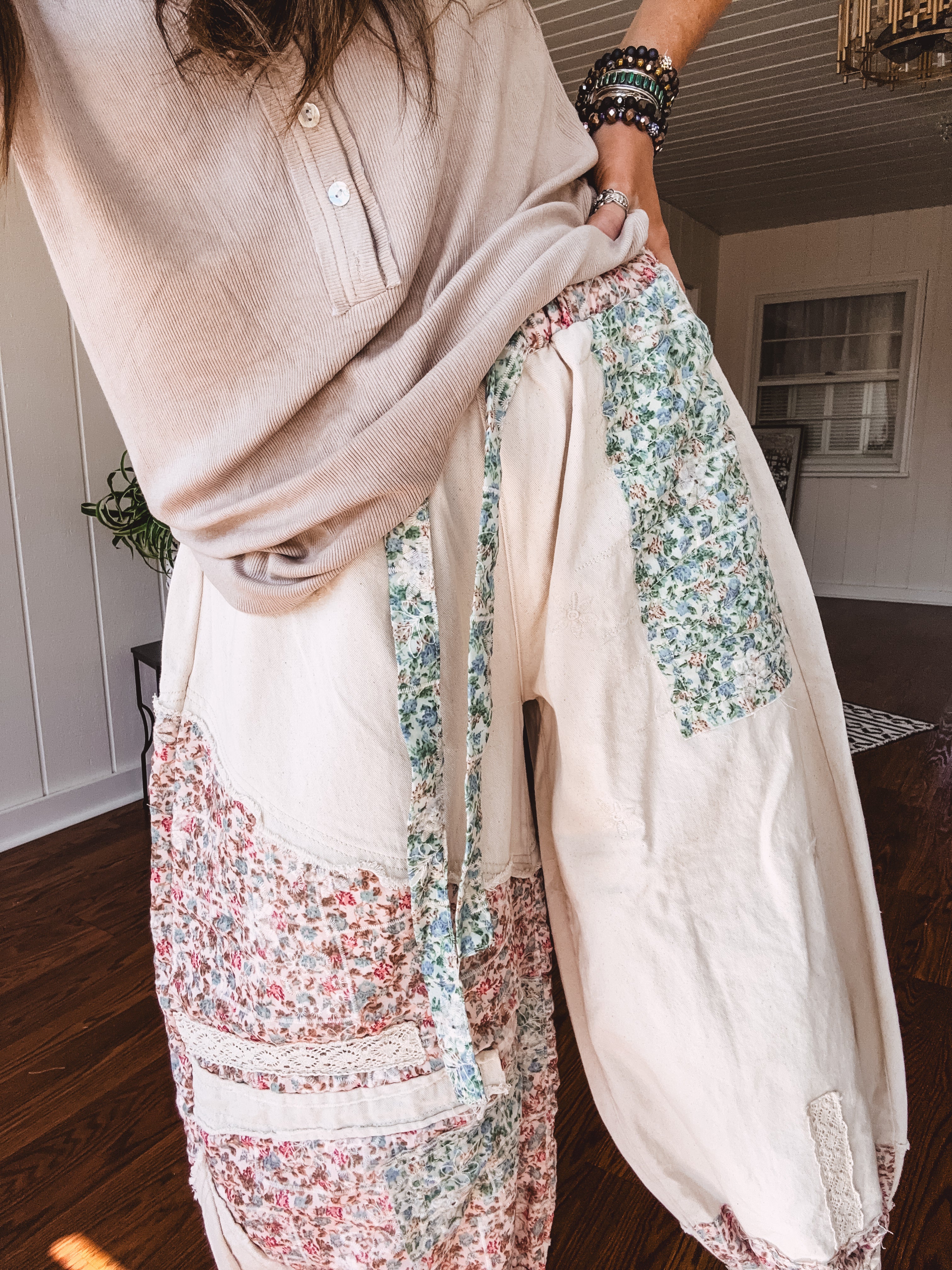 Make a statement this summer with these 100% cotton pants! They're super soft and ultra-breathable, and they showcase the cutest floral patchwork in pink and teal. With a drawstring waist and elastic cuffs, these pants are the perfect blend of joggers and barrel pants. Pair them with tanks, tees, or any of our crochet tops for a playful and fashionable look.
