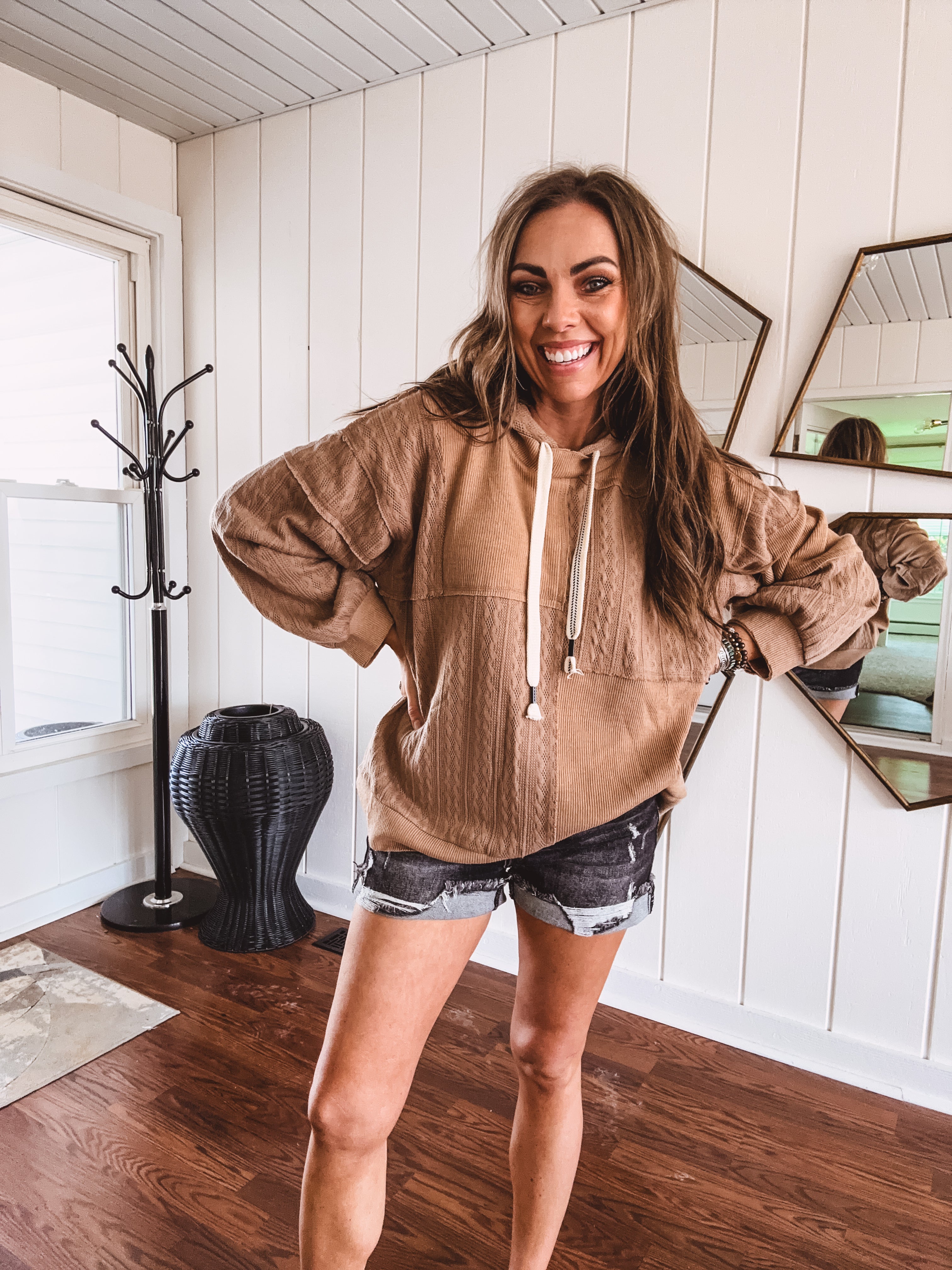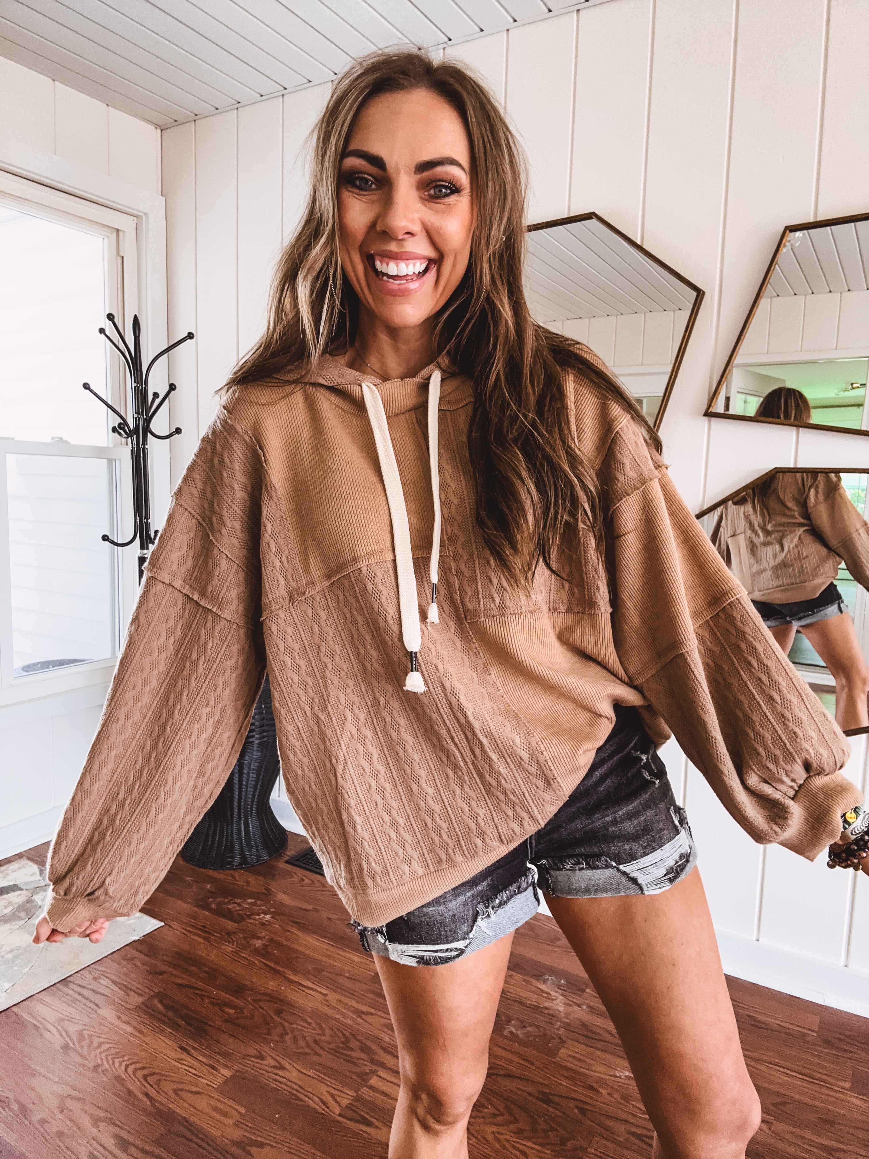 Get cozy and stylish with this one-of-a-kind Patchwork Cable Mix Hoodie. Its lightweight, oversized design provides ultimate comfort, and its mix of cable knit and ribbed textures make it a perfect choice for any cool spring morning or summer night around the campfire. And don't forget the playful details of a hoodie and contrasting strings for added flair!