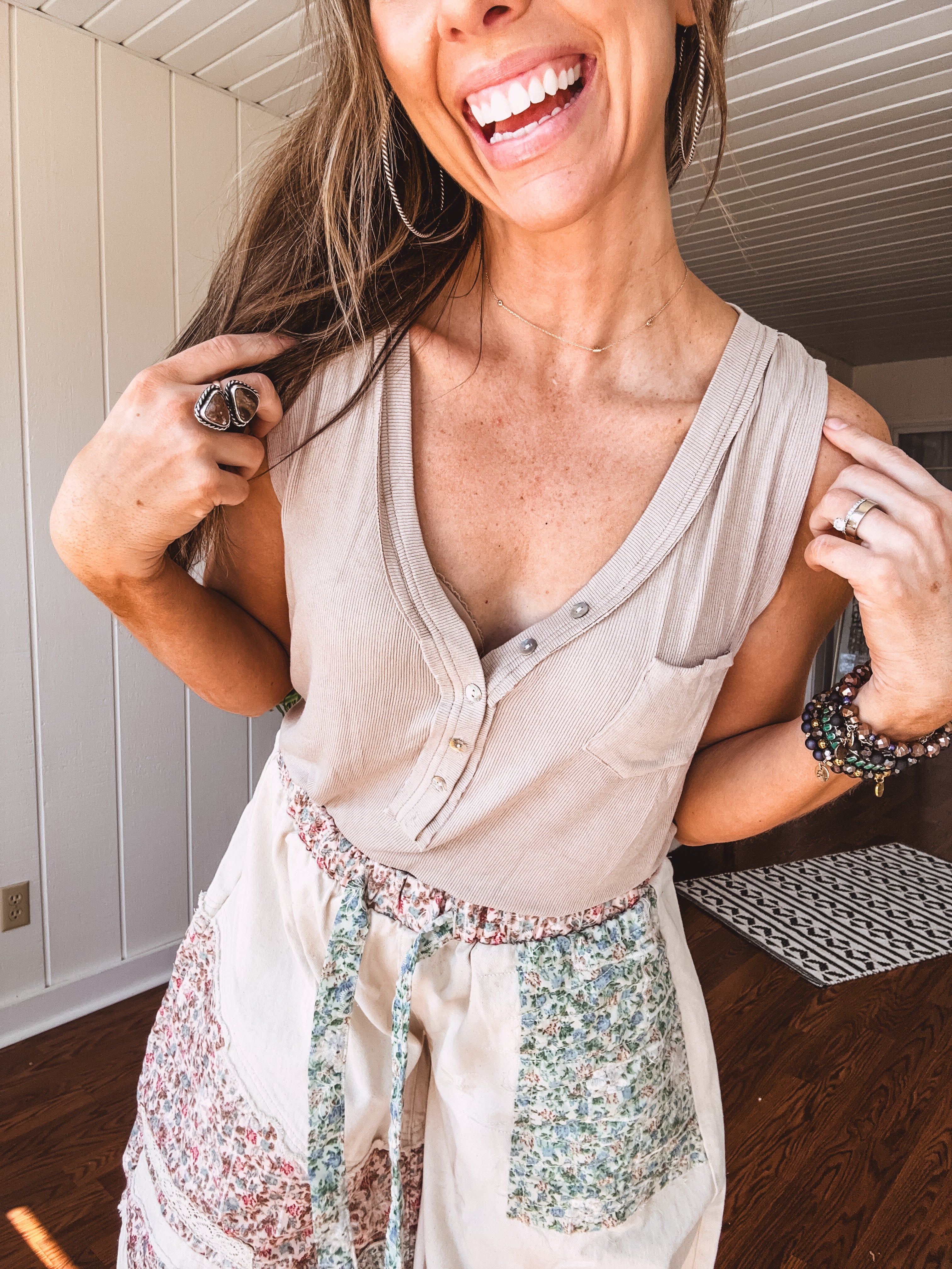 This truly is the Perfect Easy Button V Neck Mini Pocket Tank! It features butter soft, ribbed fabric, is non-clingy, refreshingly flowy and breathable. The deep V neck and functional abalone buttons add a trendy and customizable option. This is ideal for layering under your favorite jacket or blazer, but looks amazing as a stand alone piece. So versatile you'll want one in every color!