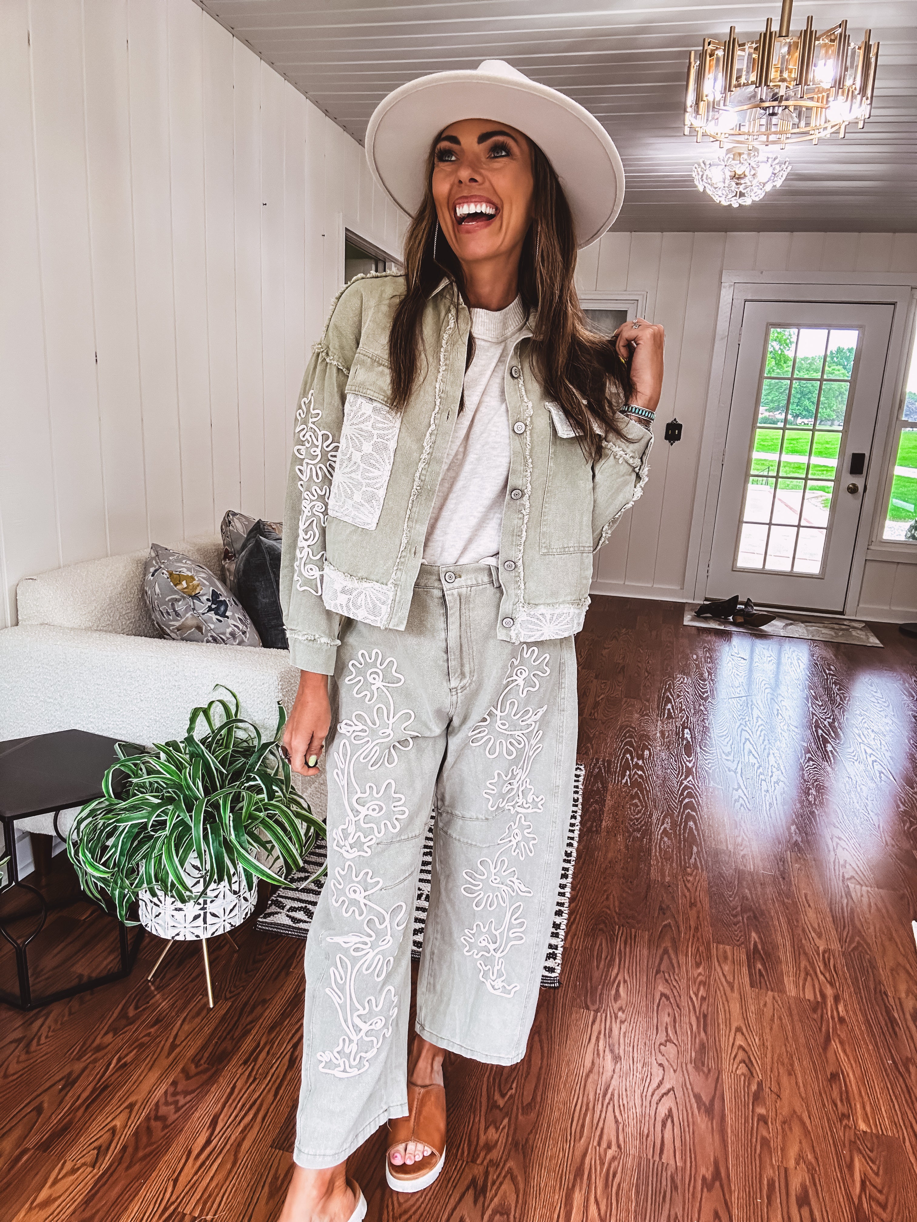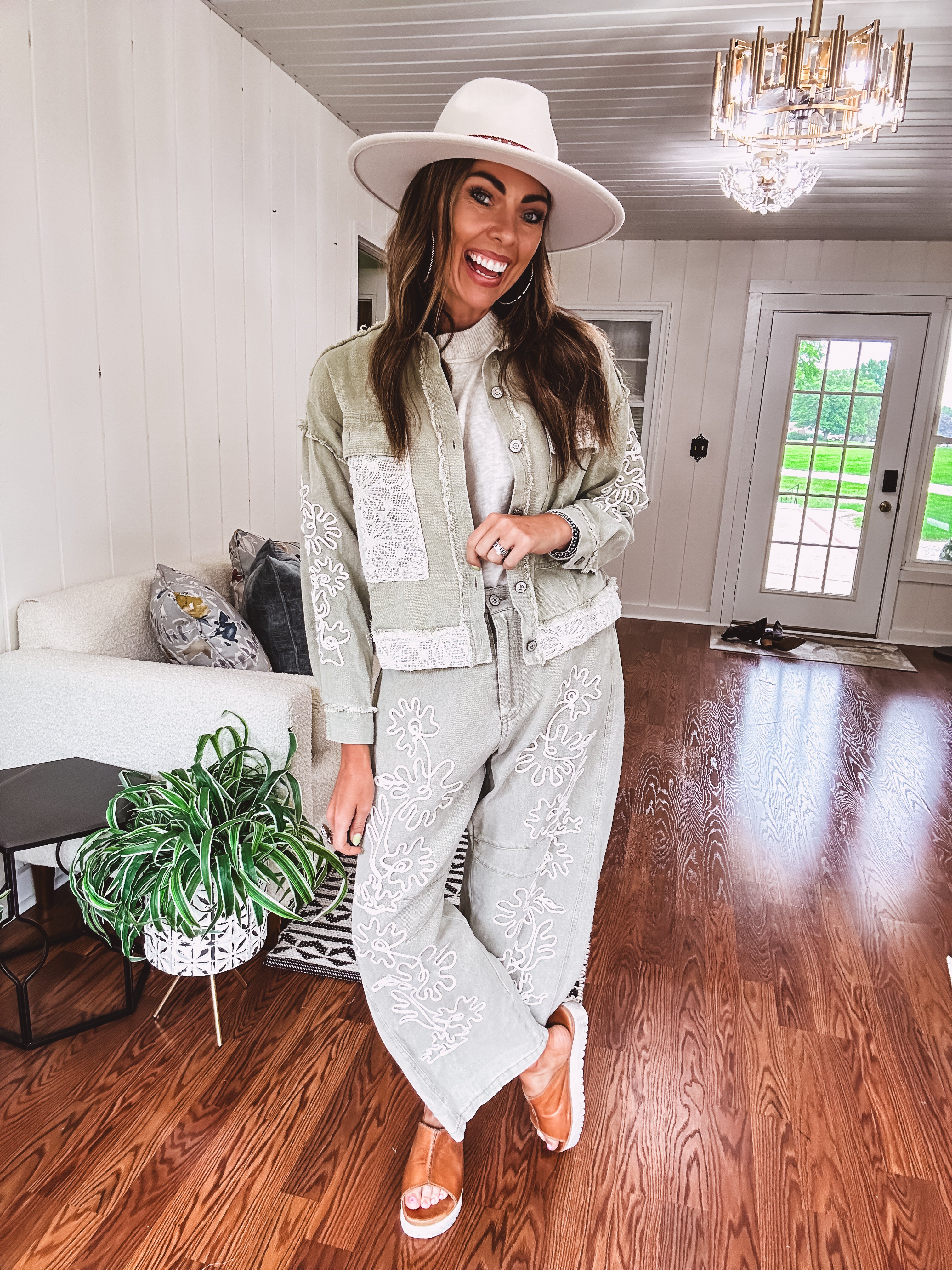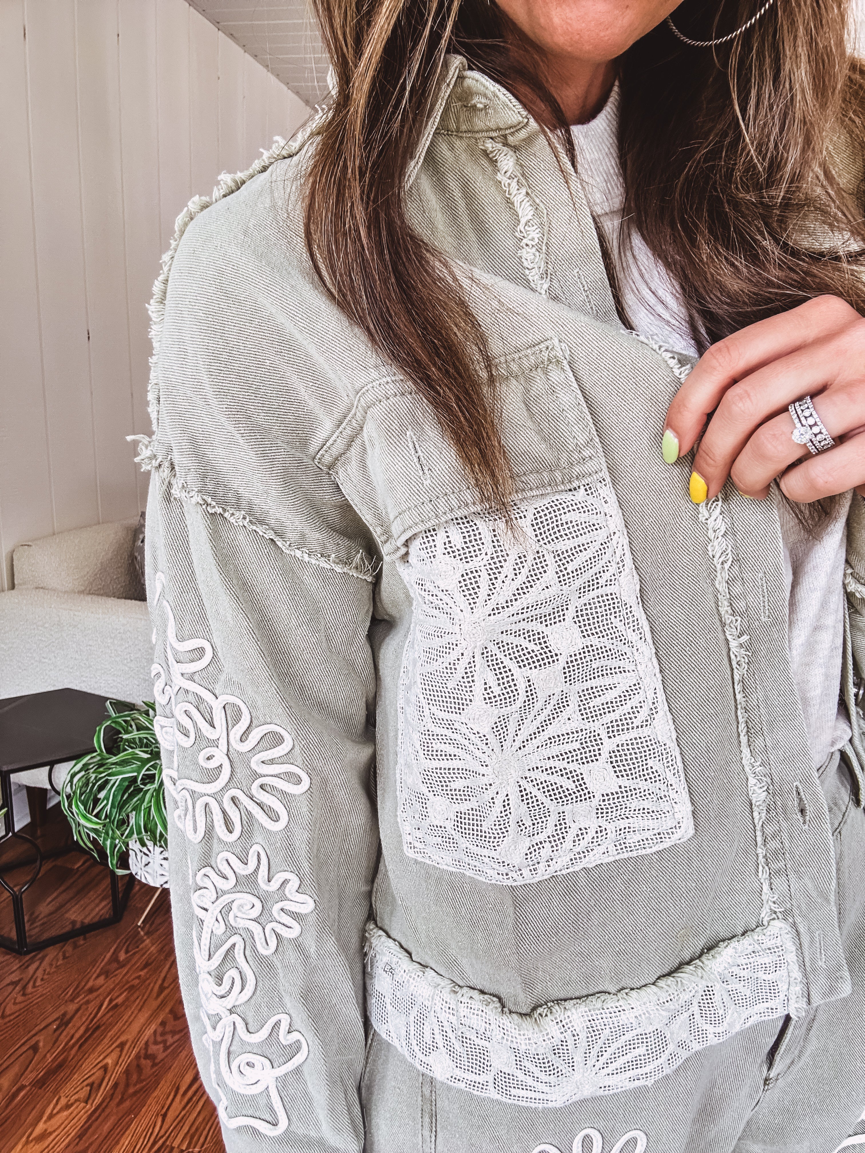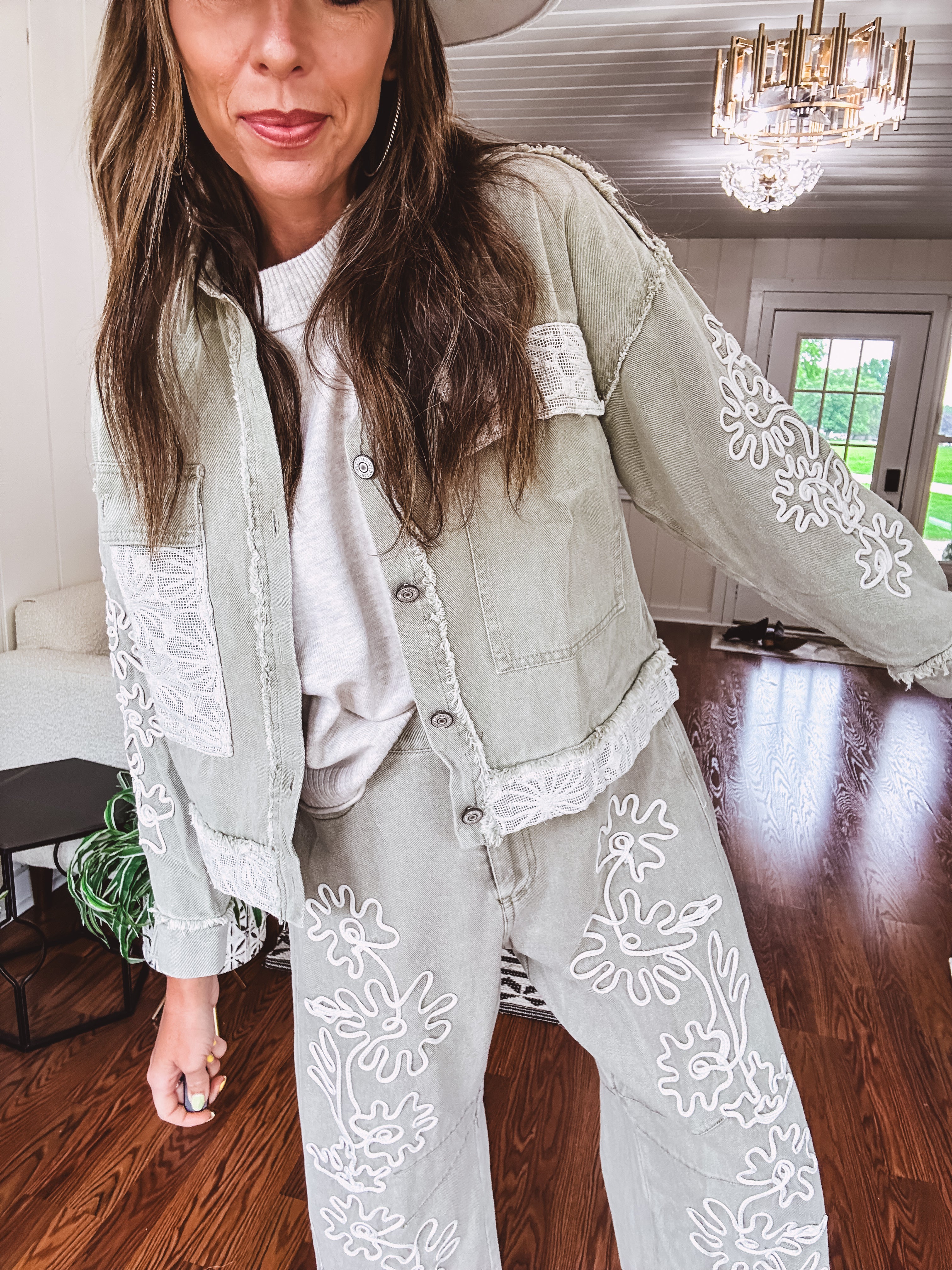 A true denim jacket, thin, lightweight feel in a soft, washed sage featuring a contrasting ivory floral cord embroidery down sleeves and a lace crochet detail on the pockets and hem. This is so unique, so on trend and can be easily transitioned from summer to fall by adding a tank and shorts and when the weather cools, add the matching Sage Cord Floral Embroidered pants and some booties for a unique and toasty vibe!
