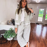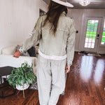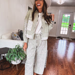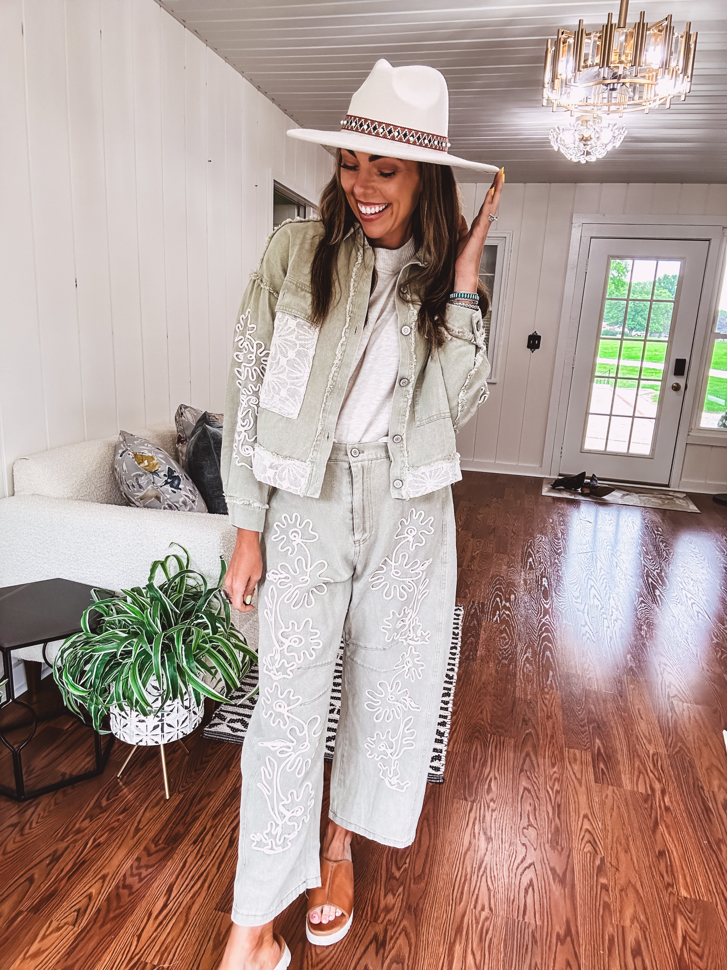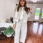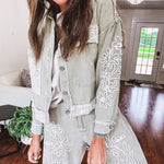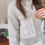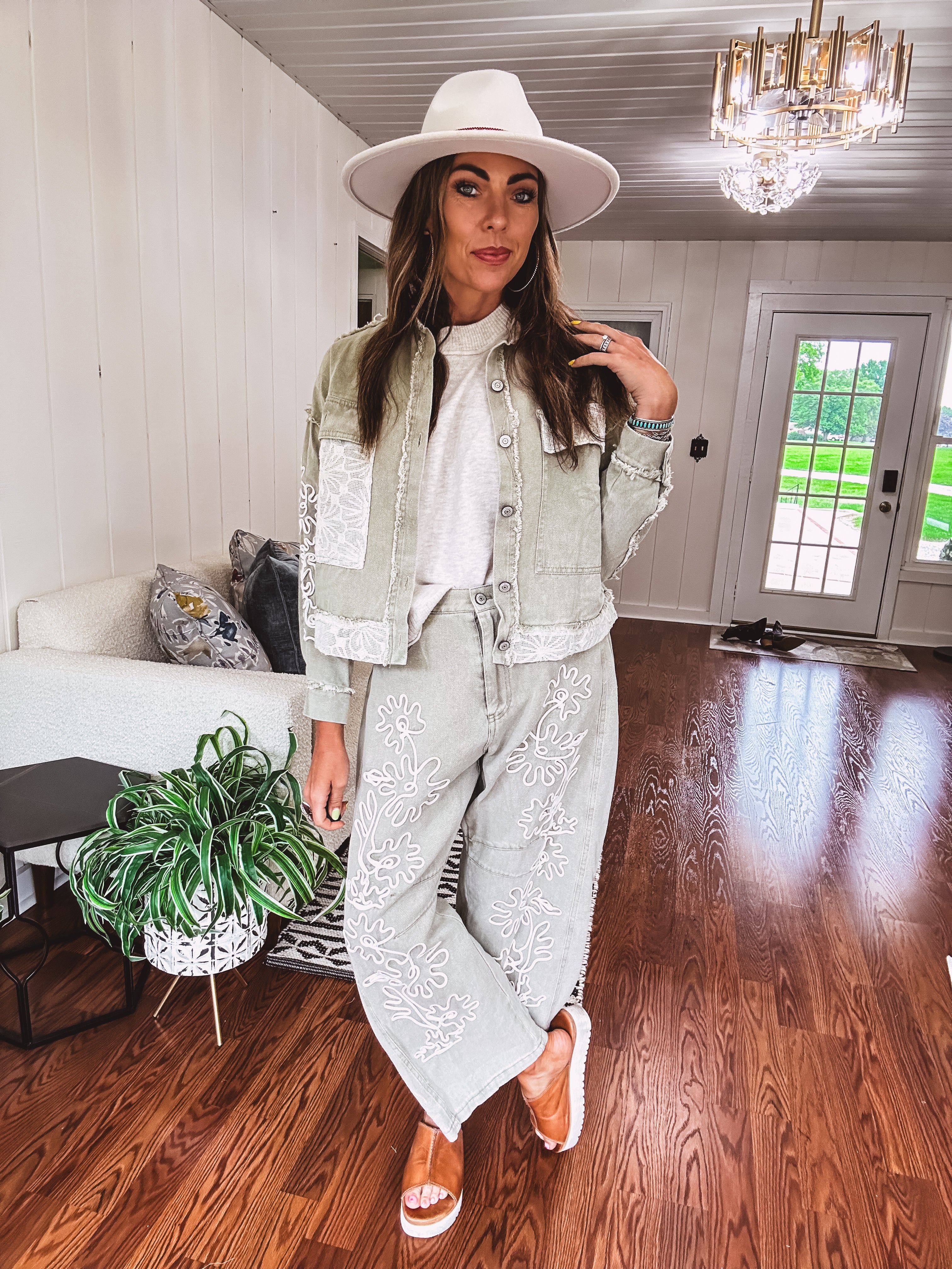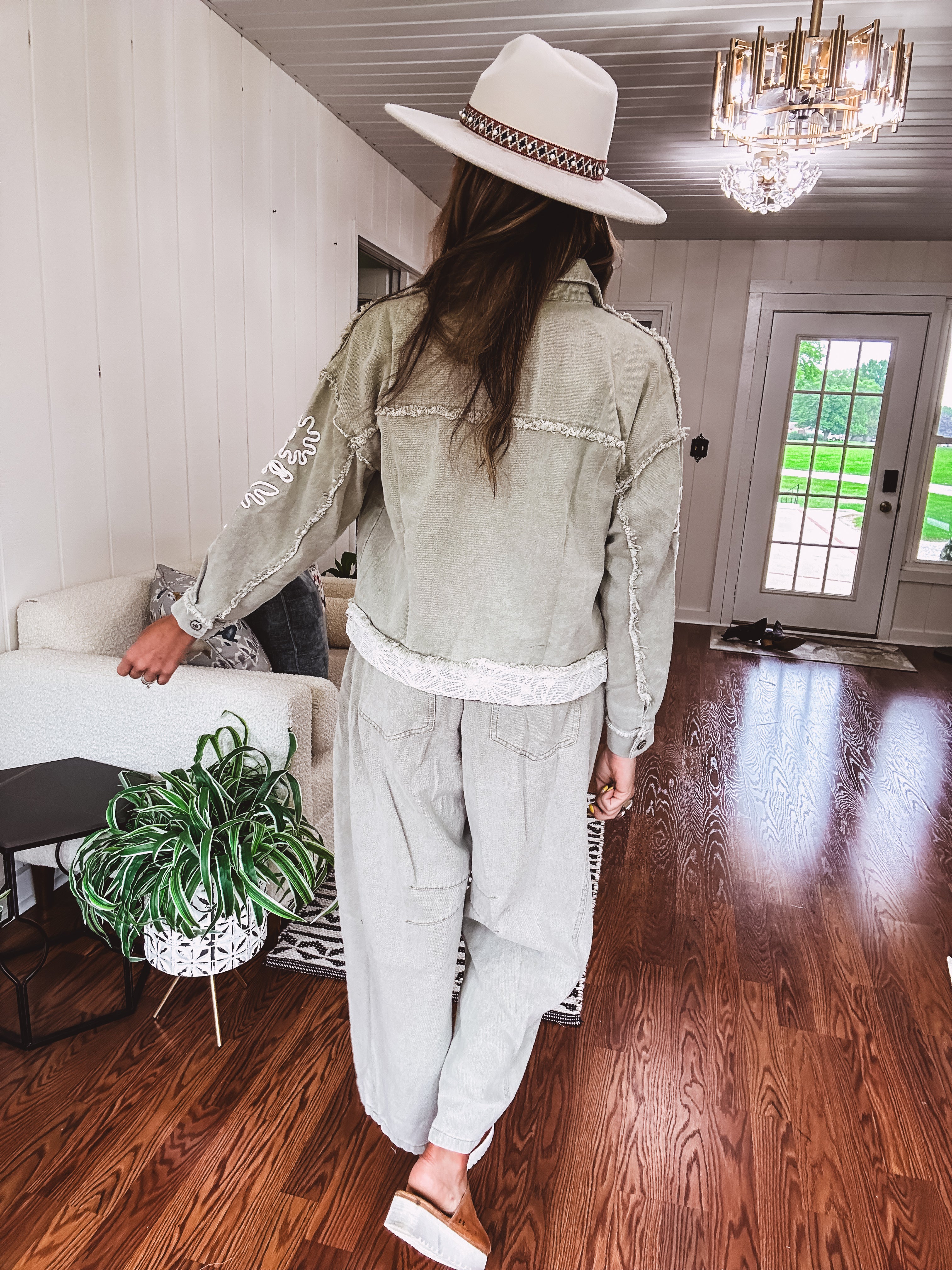 A true denim jacket, thin, lightweight feel in a soft, washed sage featuring a contrasting ivory floral cord embroidery down sleeves and a lace crochet detail on the pockets and hem. This is so unique, so on trend and can be easily transitioned from summer to fall by adding a tank and shorts and when the weather cools, add the matching Sage Cord Floral Embroidered pants and some booties for a unique and toasty vibe!