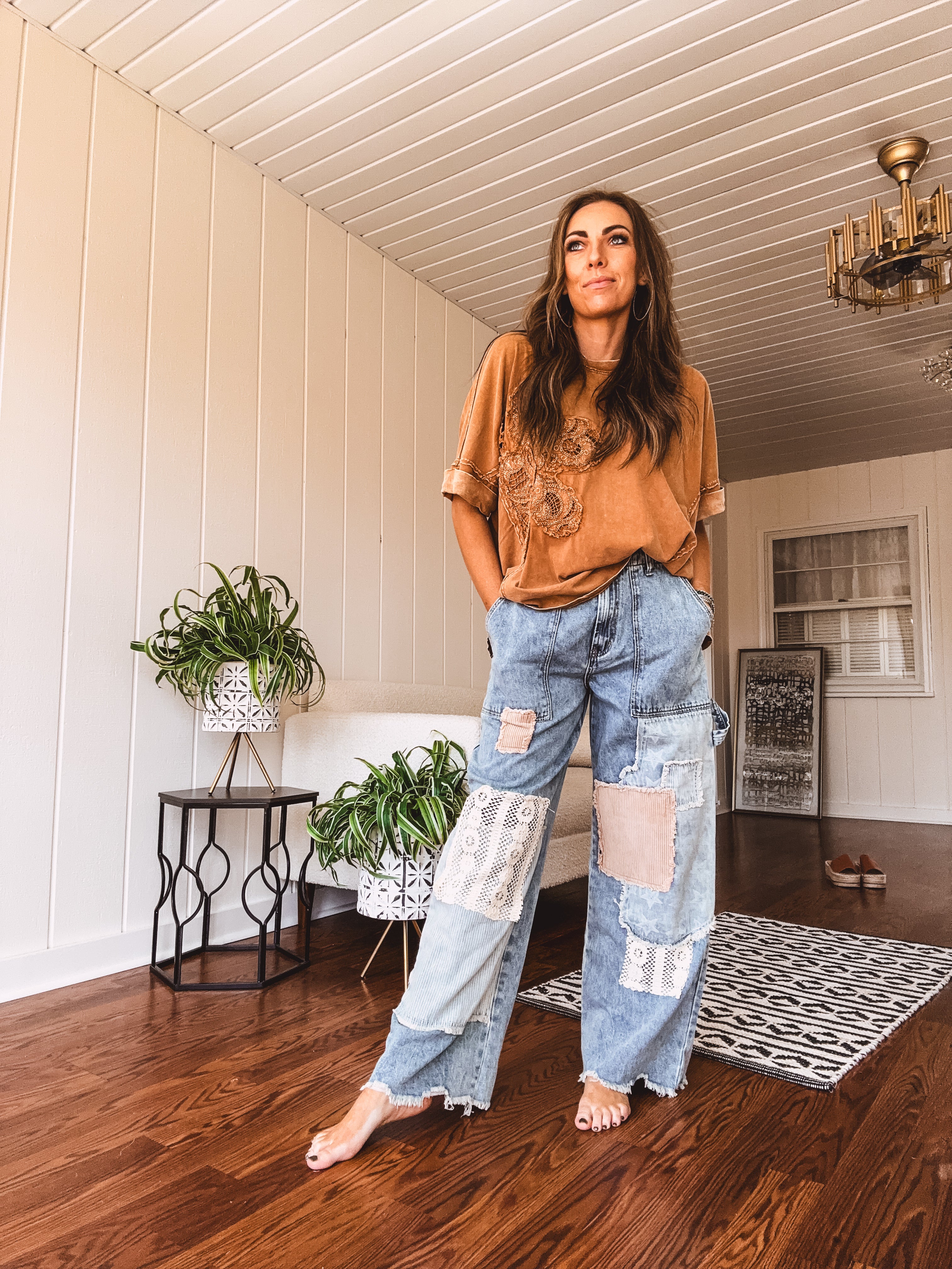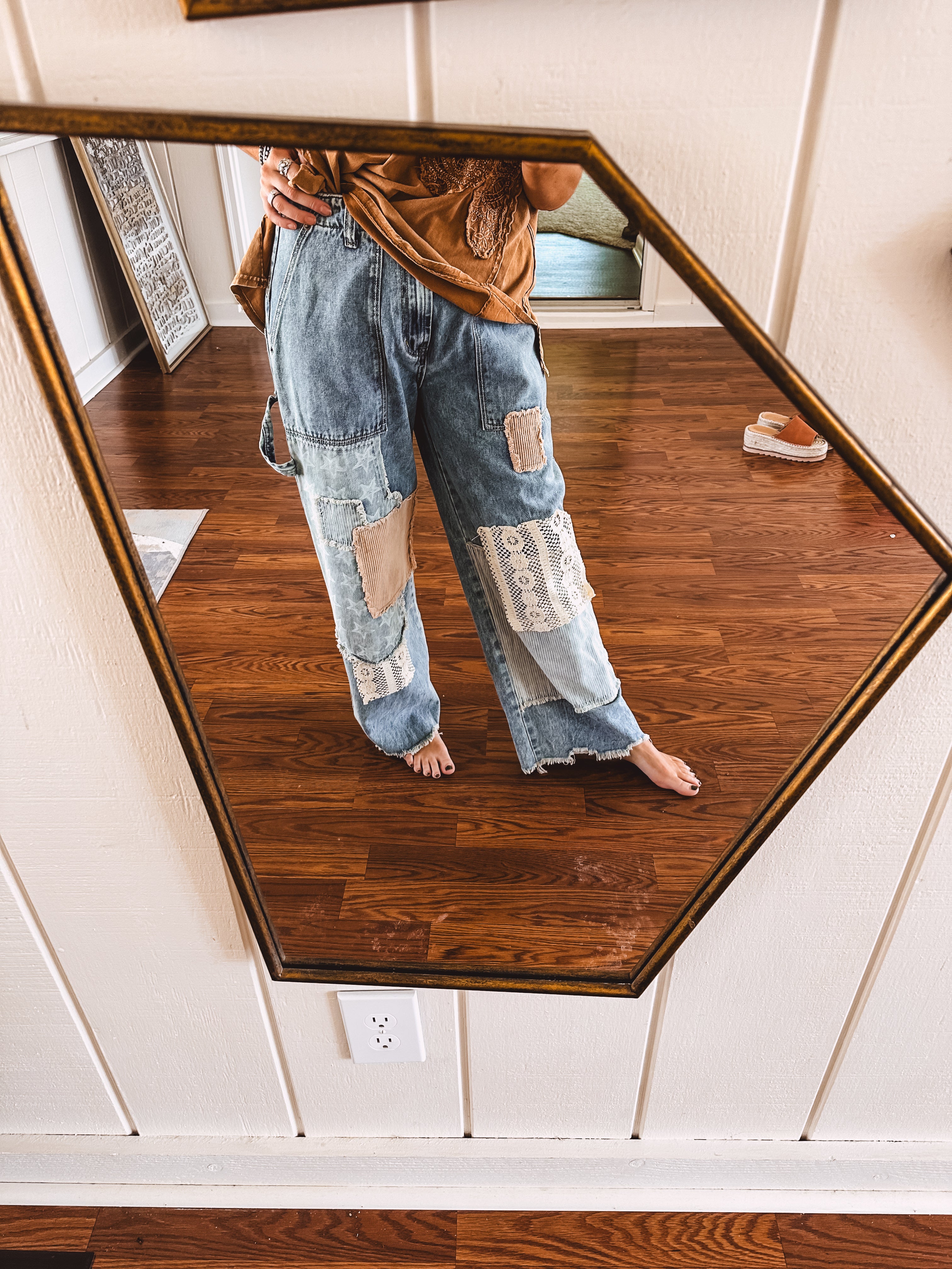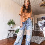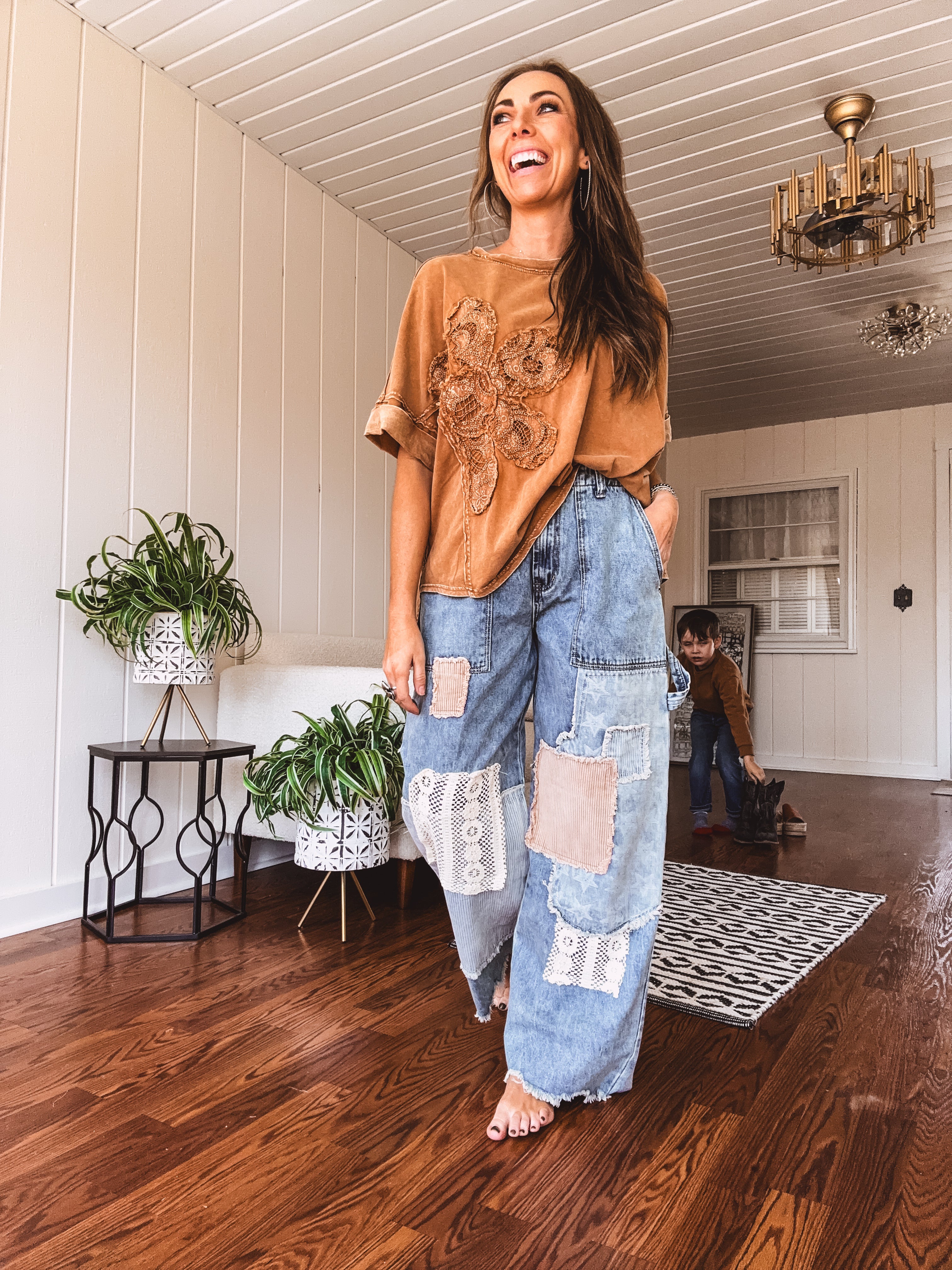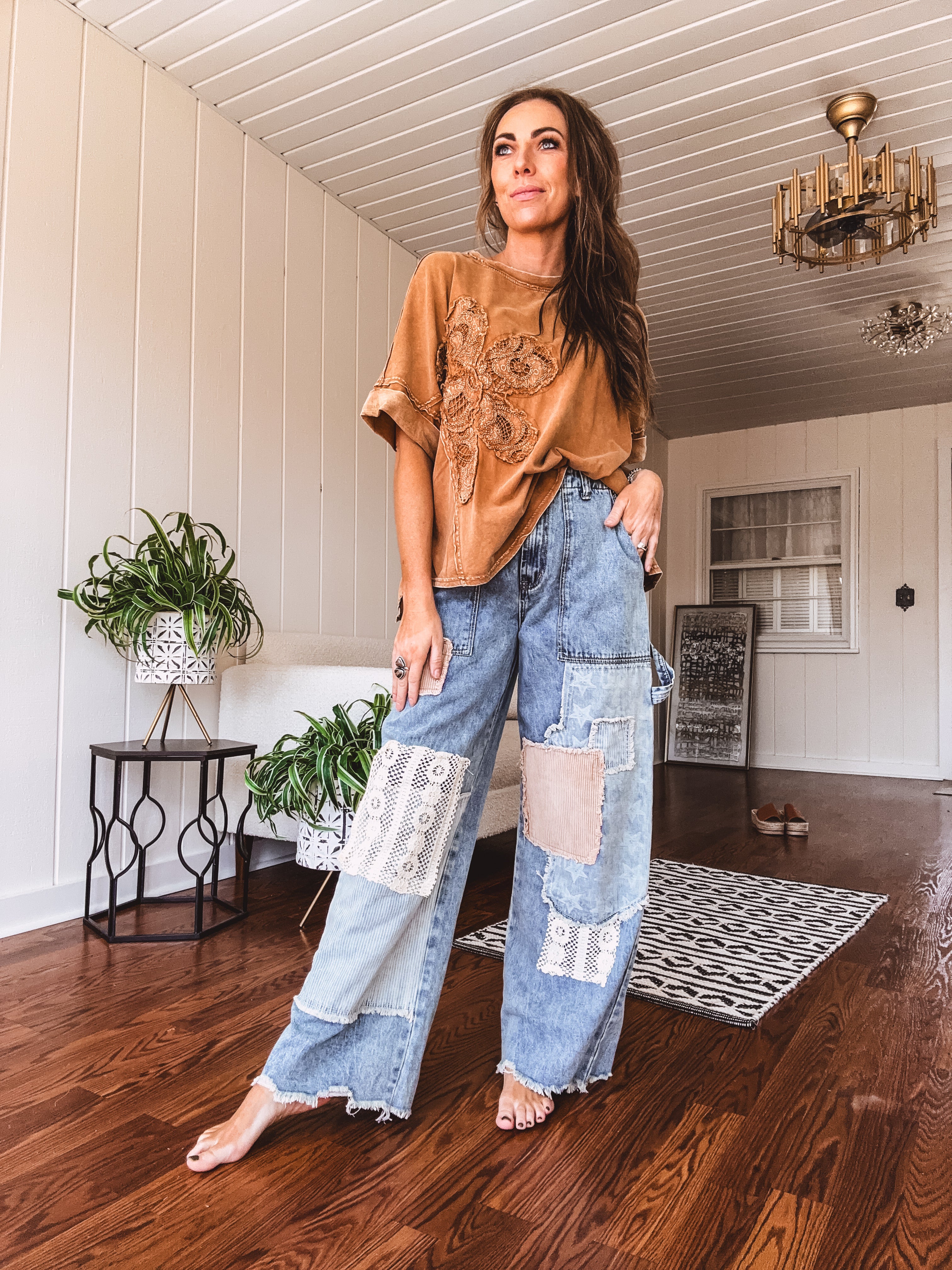 Looking for a pair of denim pants that don't take themselves too seriously? Our Washed Multi Patch Denim Pant has a relaxed fit, no stretch, and a fun, wide leg design. Plus, the back has an elastic waist band for added comfort. The carpenter-style pants are accented with quirky patches featuring textured materials like corduroy, stars, stripes, and lace crochet in neutral shades. Perfect for a playful and unique look!