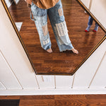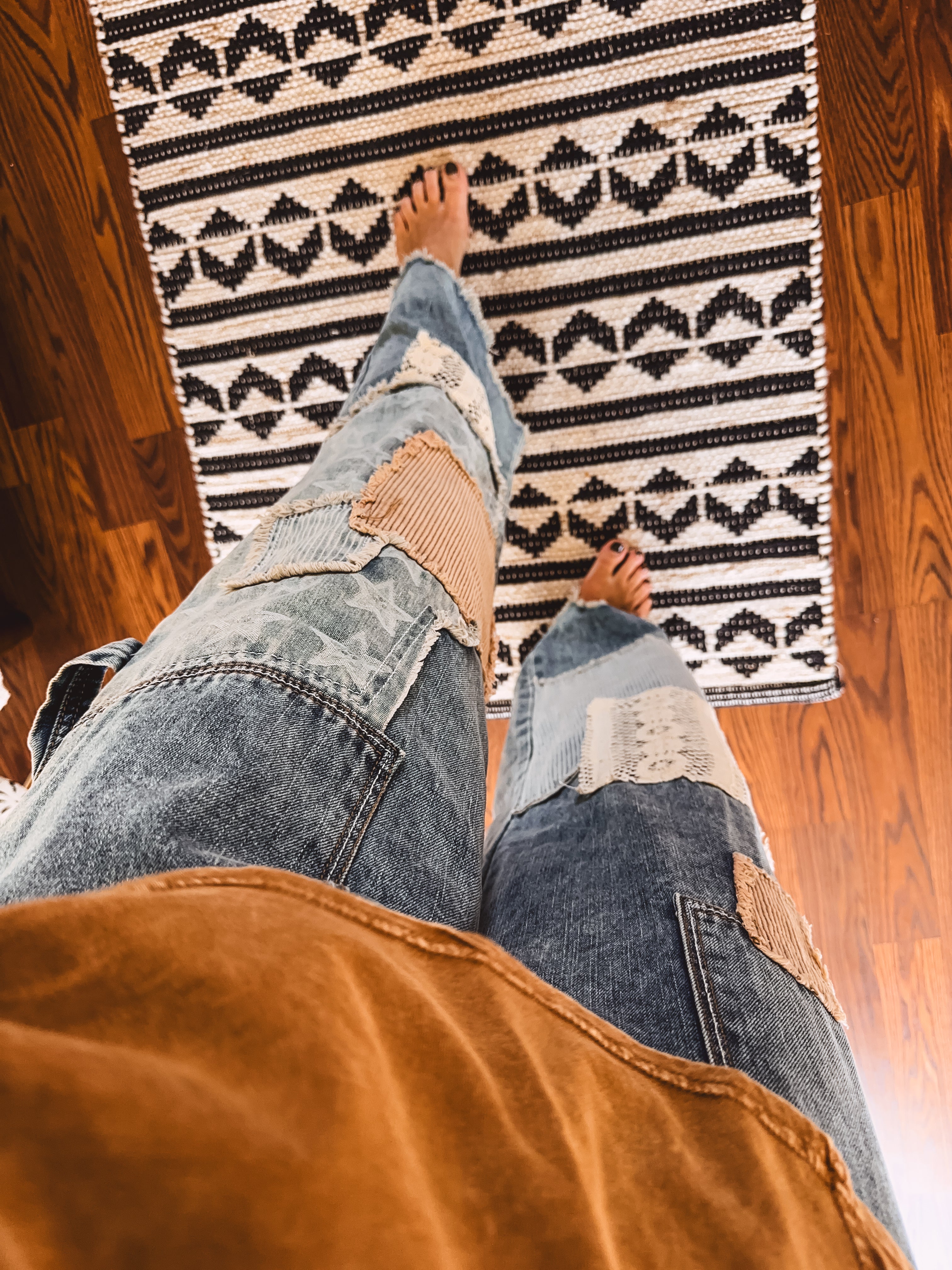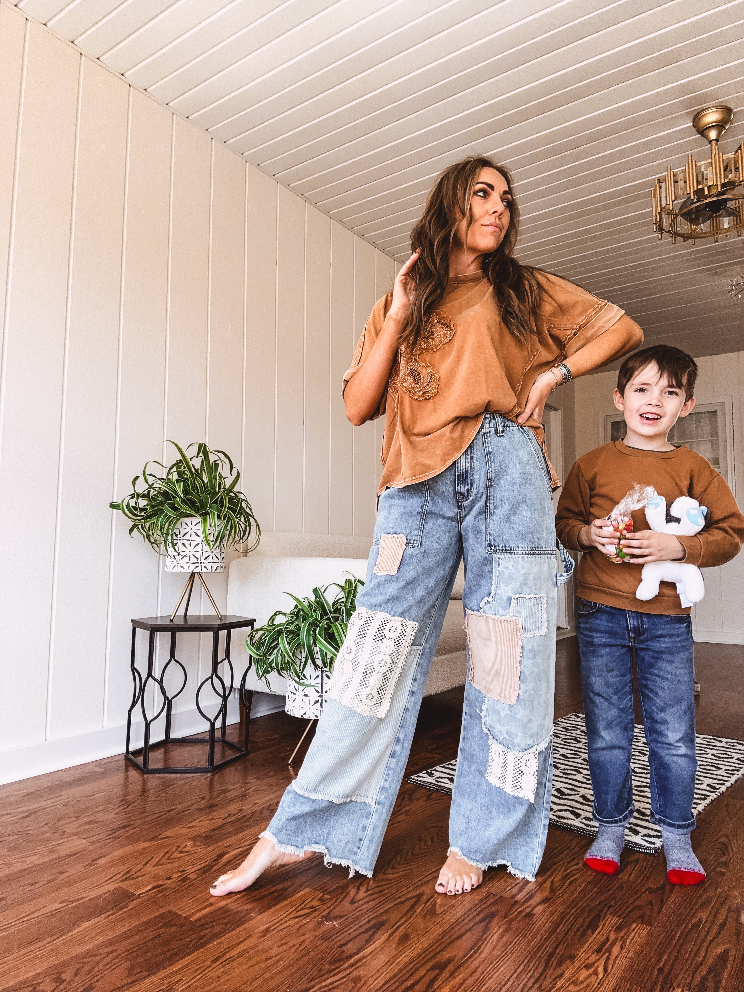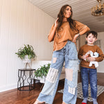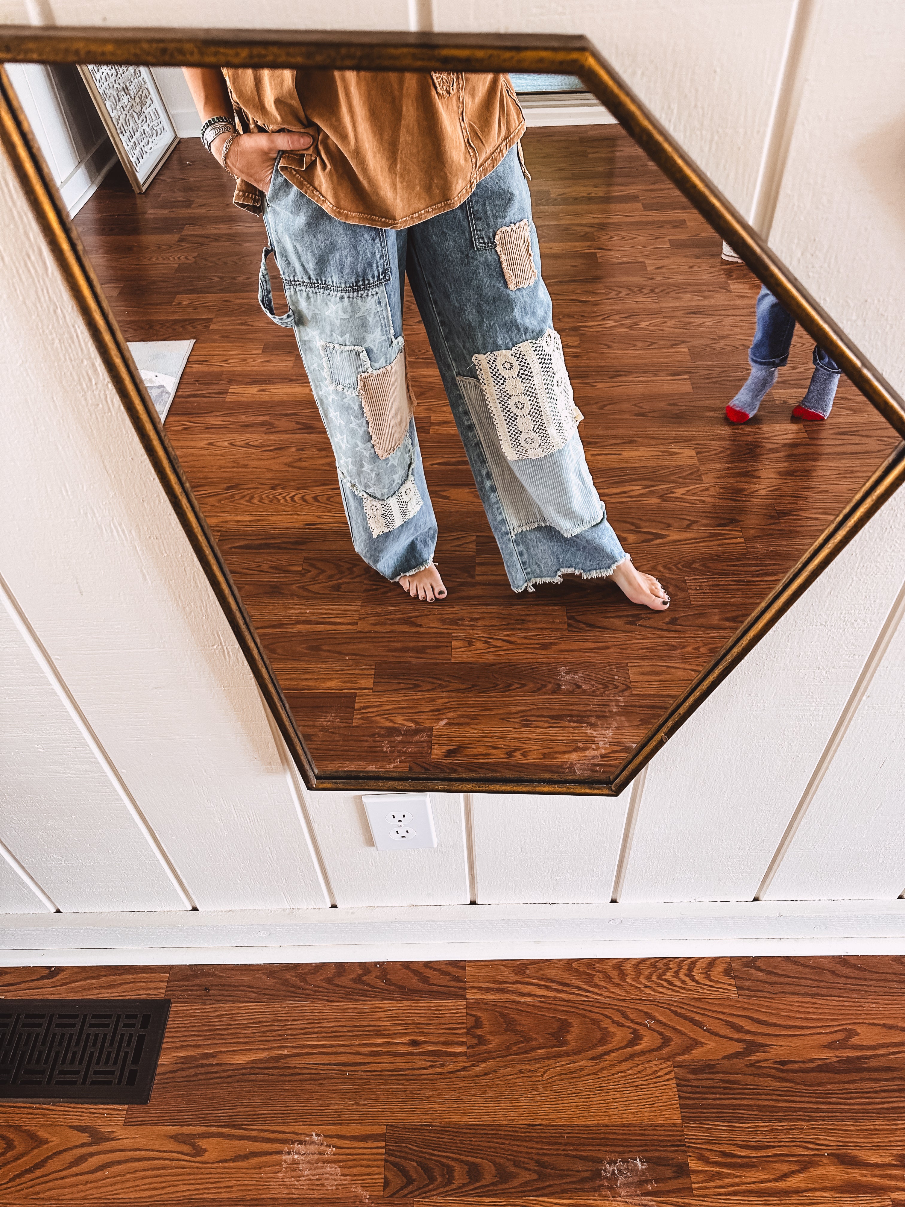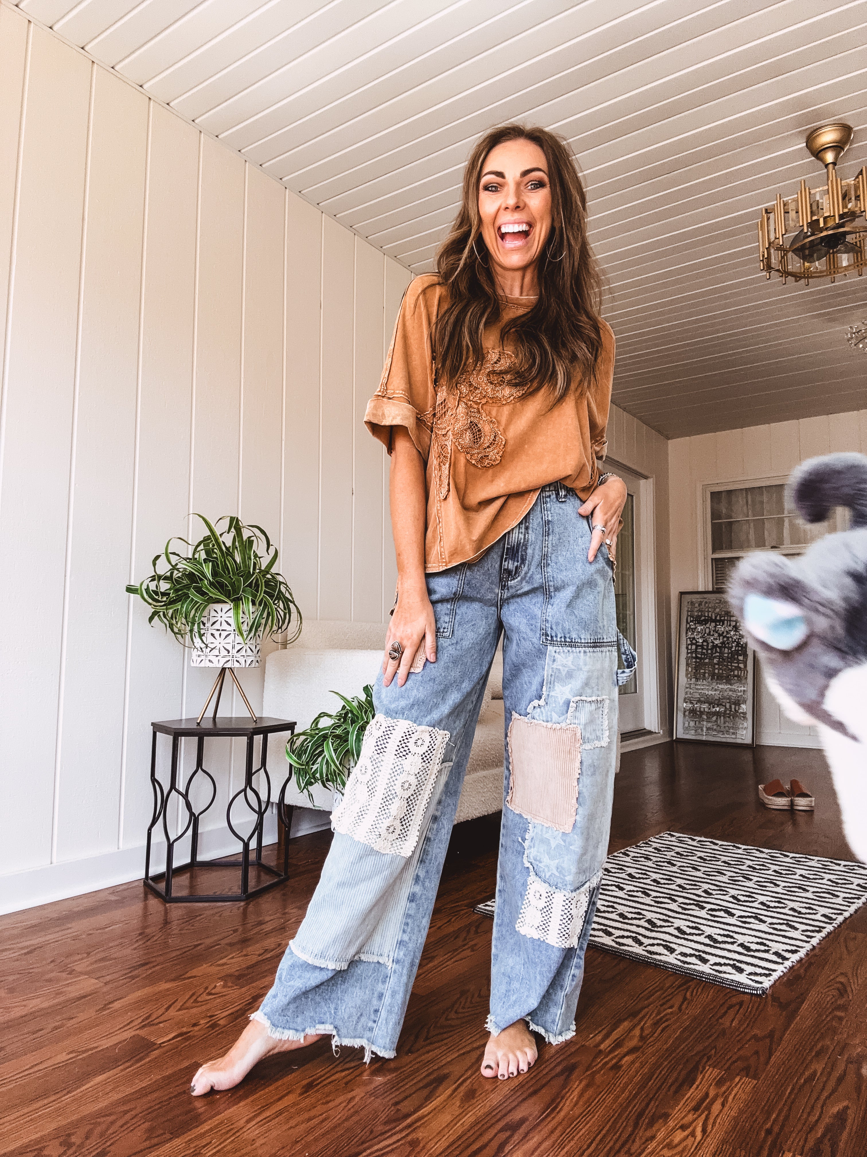 Looking for a pair of denim pants that don't take themselves too seriously? Our Washed Multi Patch Denim Pant has a relaxed fit, no stretch, and a fun, wide leg design. Plus, the back has an elastic waist band for added comfort. The carpenter-style pants are accented with quirky patches featuring textured materials like corduroy, stars, stripes, and lace crochet in neutral shades. Perfect for a playful and unique look!