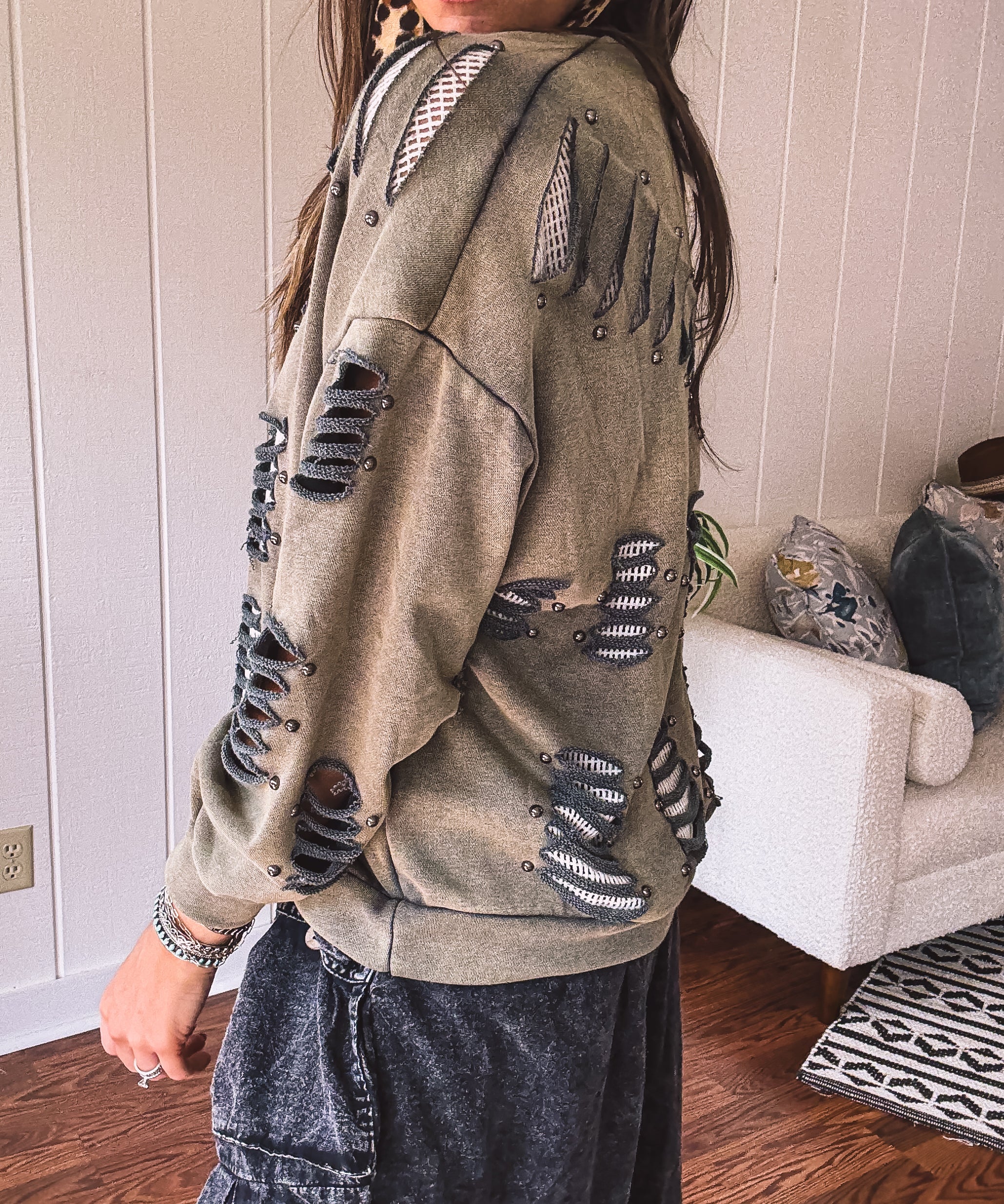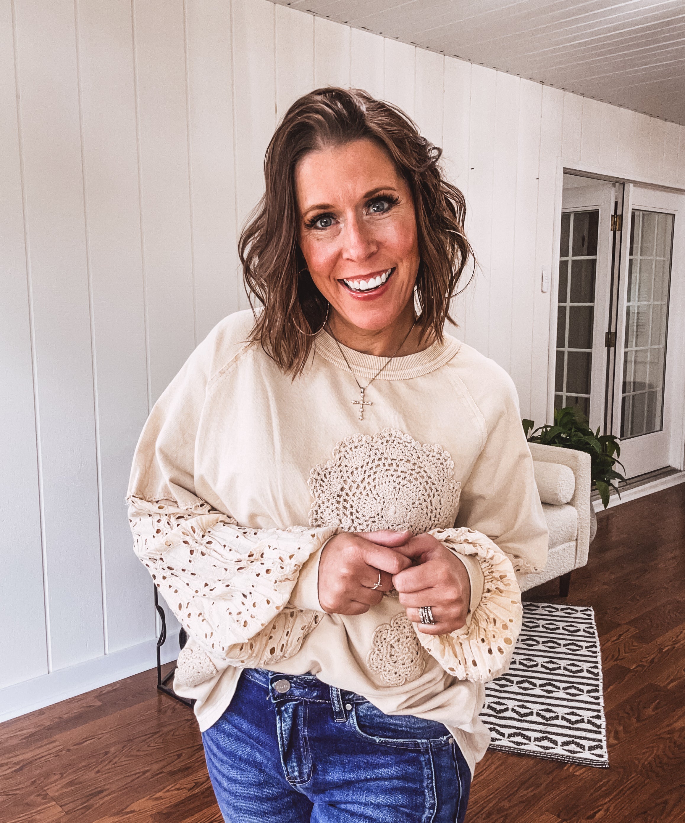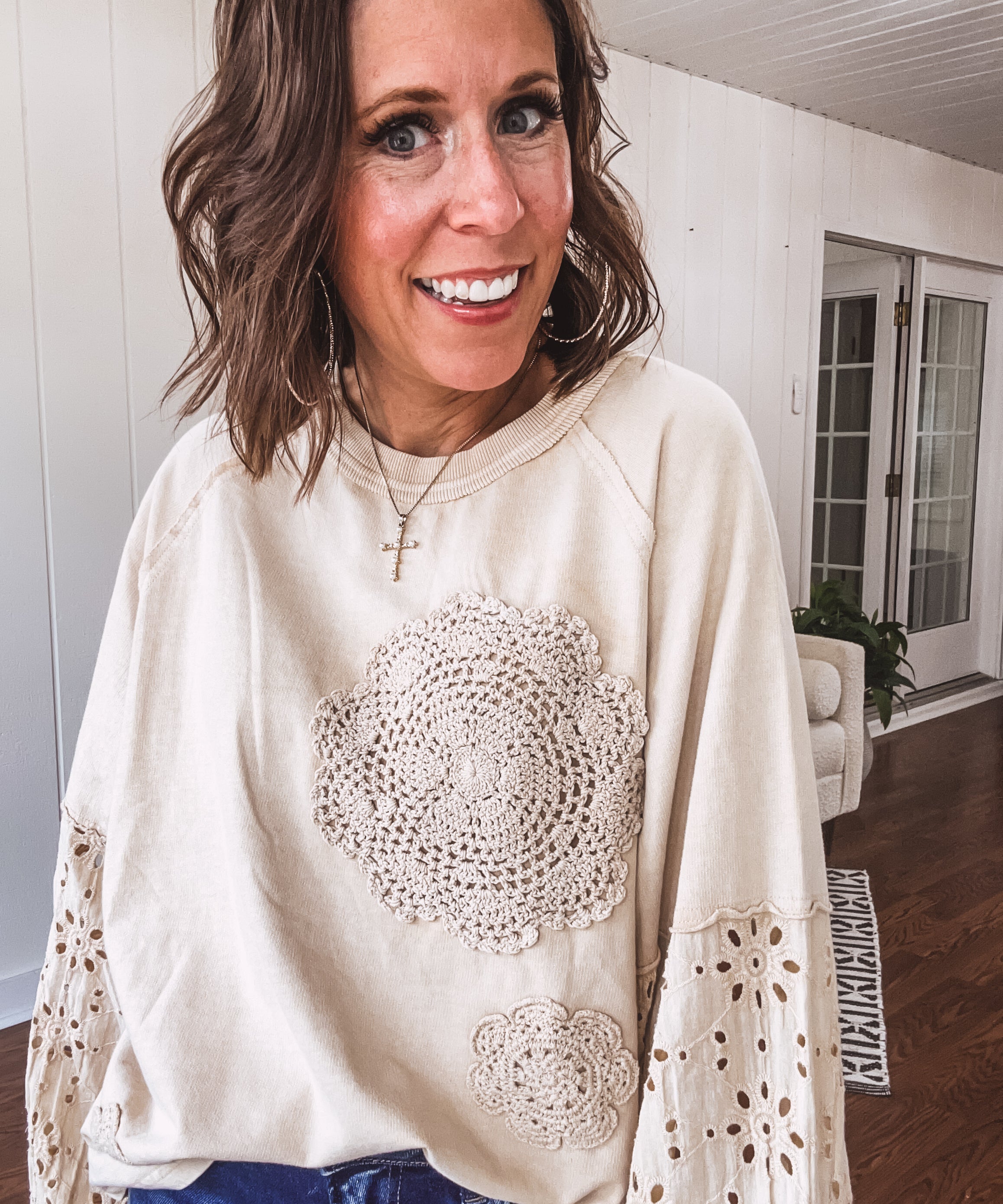 Ecru Eyelet Lace Contrast Sleeve Pullover