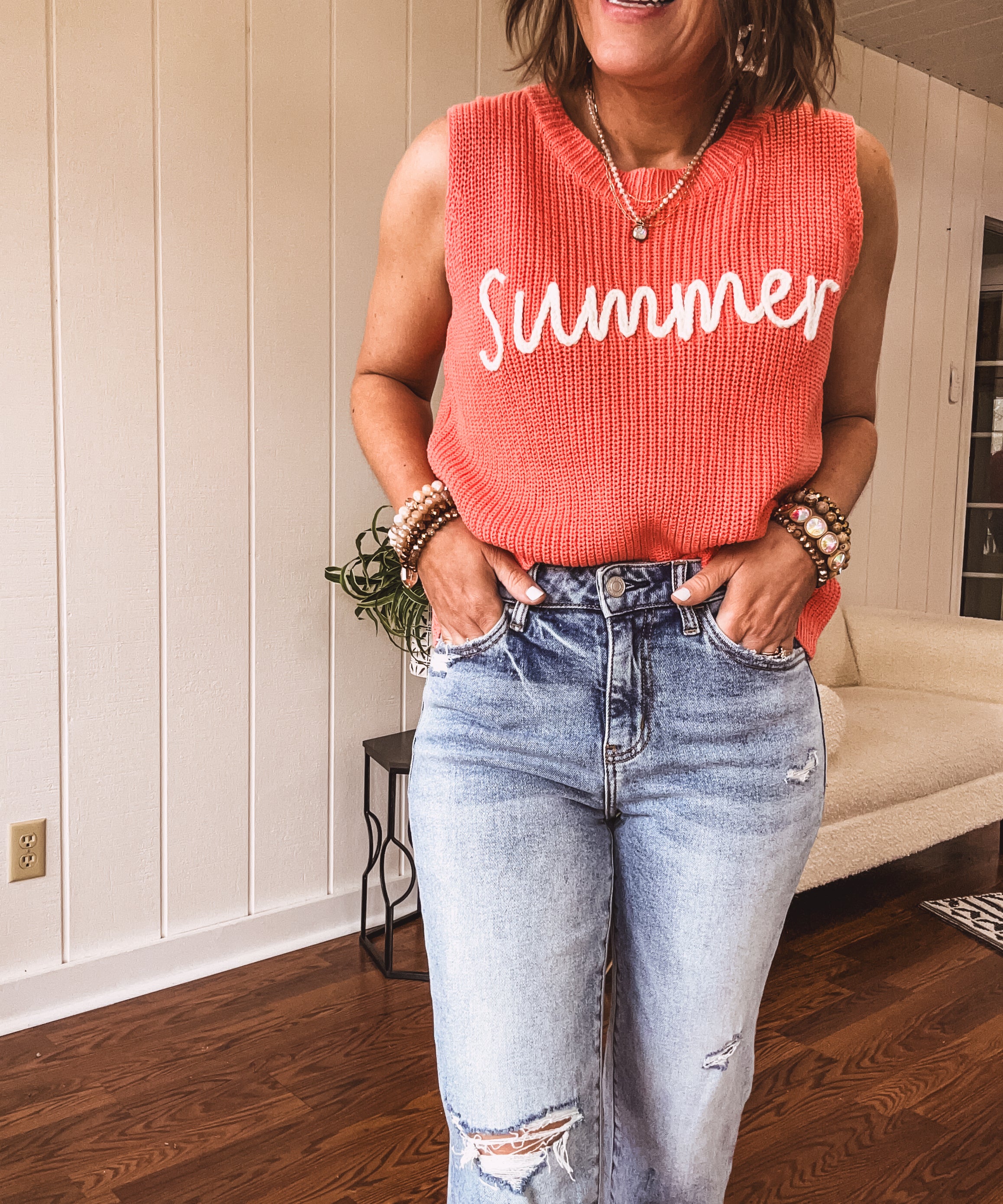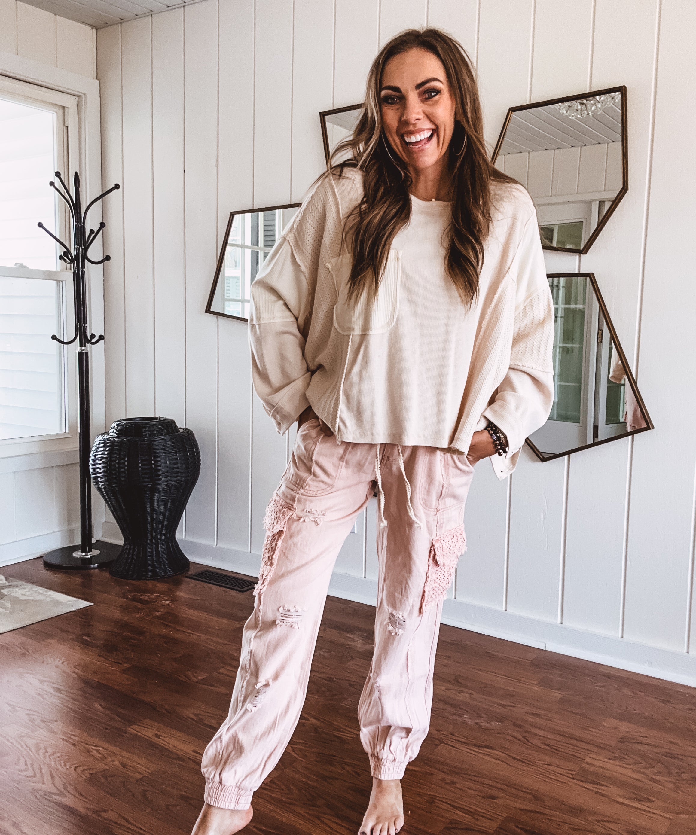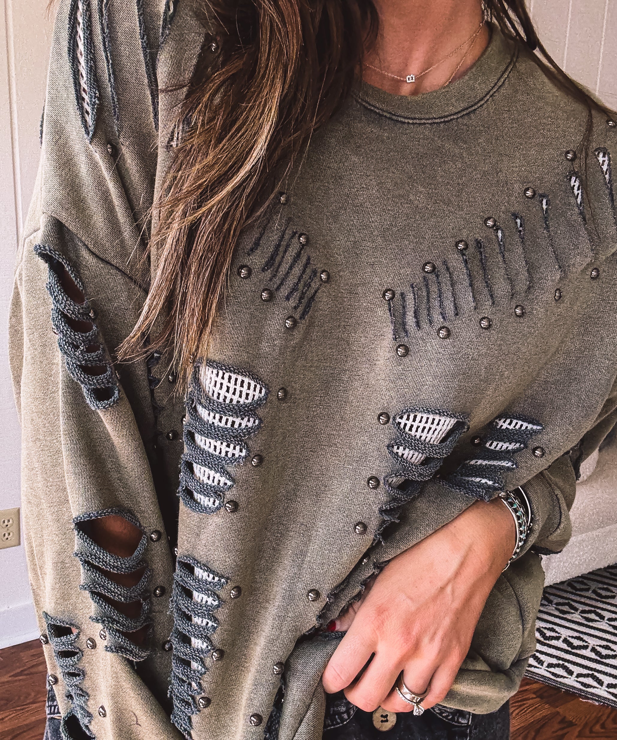 Ecru Eyelet Lace Contrast Sleeve Pullover