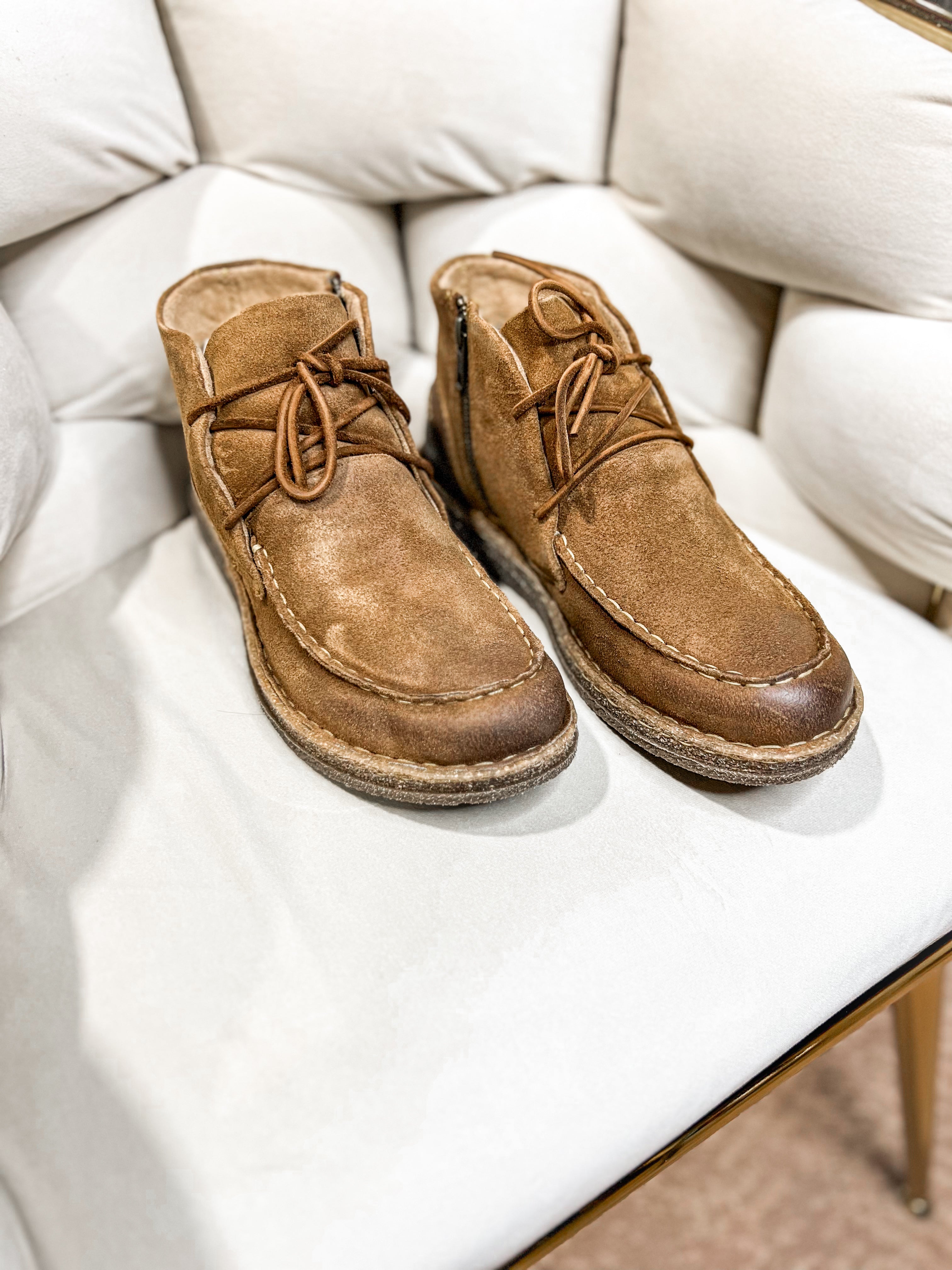 Soft hand-finished distressed suede leather upper Breathable soft fabric suede and leather combination lining Removable soft fabric suede covered footbed with extra foam for added comfort High traction flexible lightweight cork infused rubber outsole Opanka hand crafted construction Heel Height: 1 Inch. Shaft Height: 3 1/3 Inches and Shaft Circumference: 9 Inches