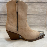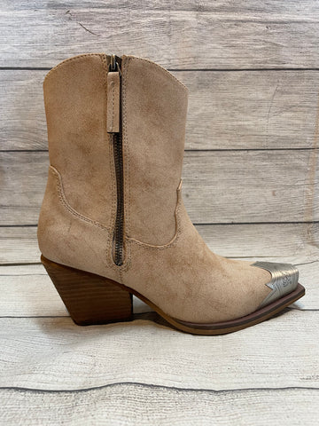 Step out and unleash your wild side with these playful boots! Perfect for concerts or dance nights, these distressed nude faux suede booties bring bold style wherever you go. Featuring a convenient side zipper, cushioned insole, and a tough metal toe cap, they keep you comfortable and ready to move all night long.
